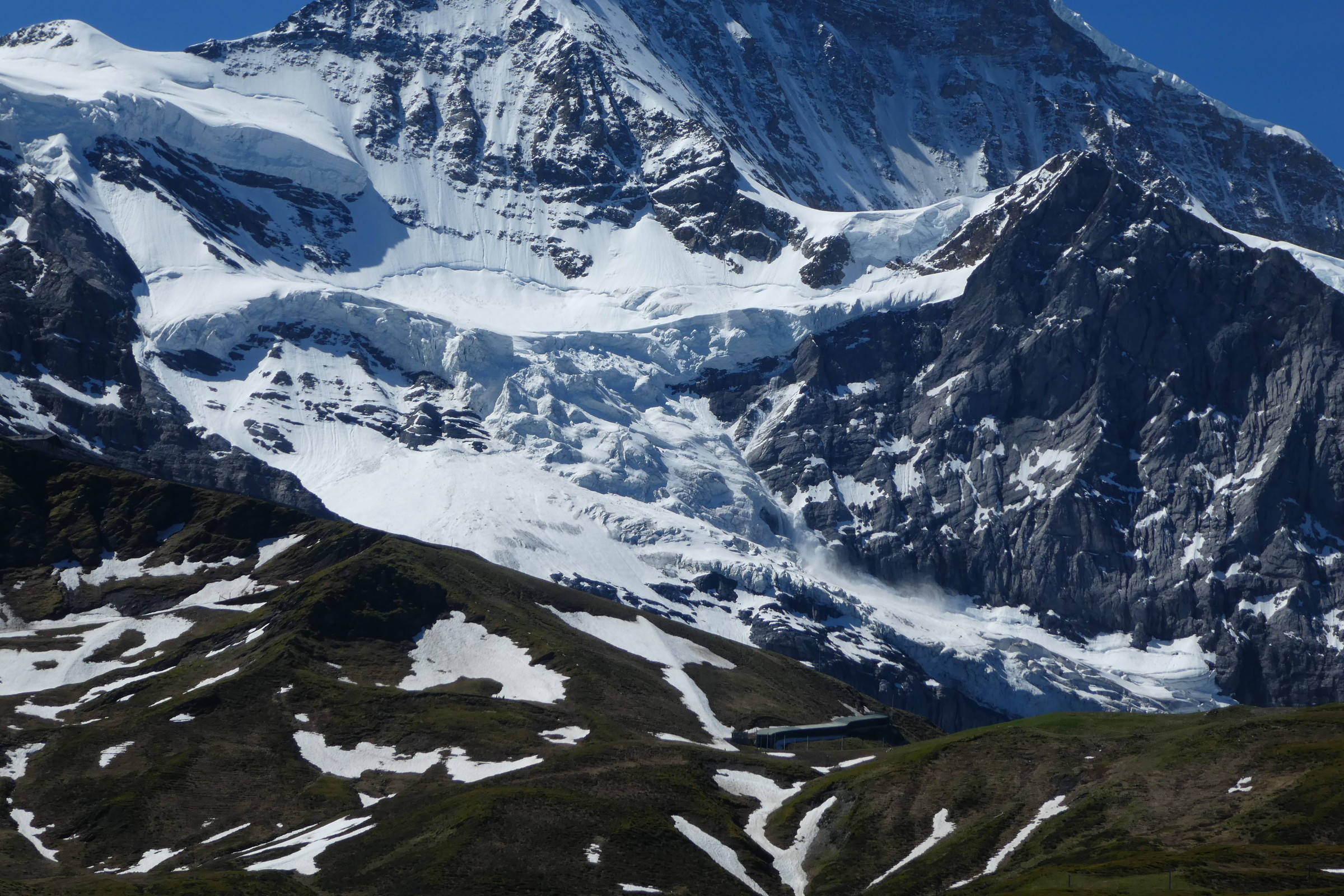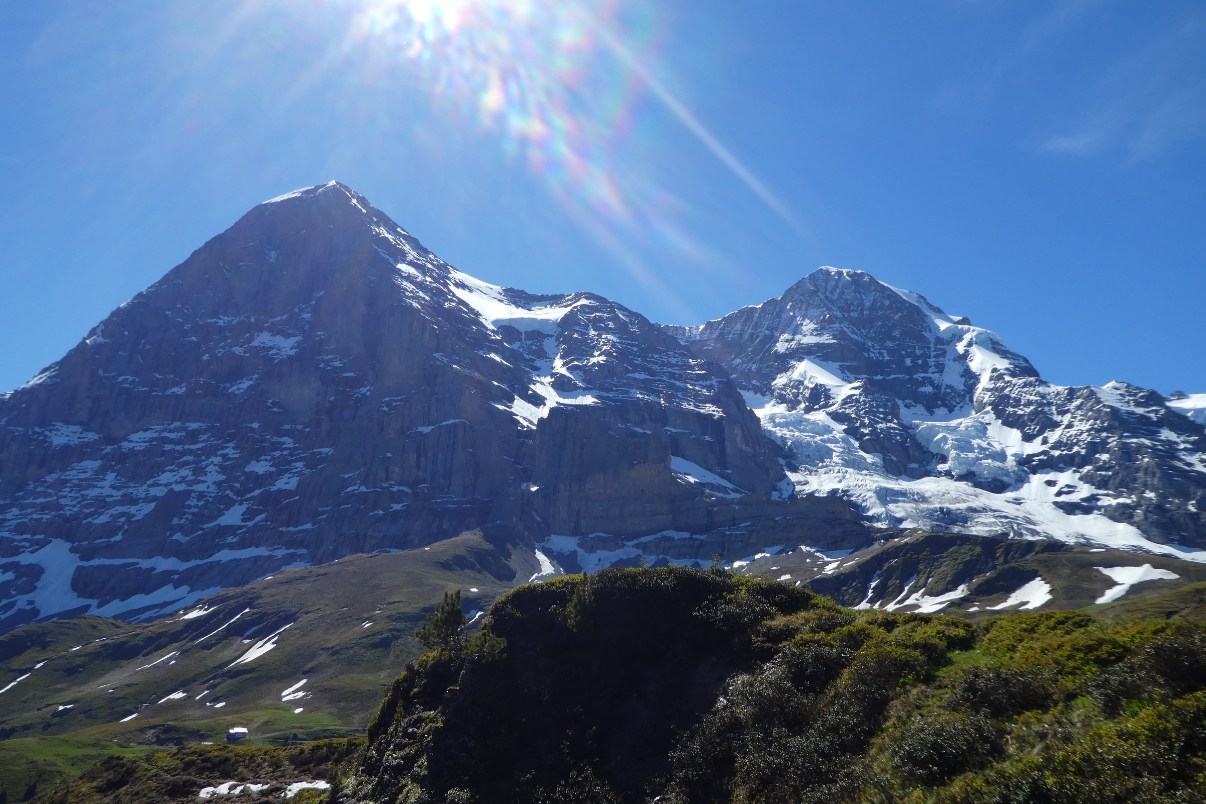 Nun zu den Bildern. Die ersten sind vom kurzen Spaziergang am ersten Tag. (Bilder zum vergrössern anklicken) Die kleine Scheidegg mit dem Breithorn im Hintergrund Die Schafe beobachten einen