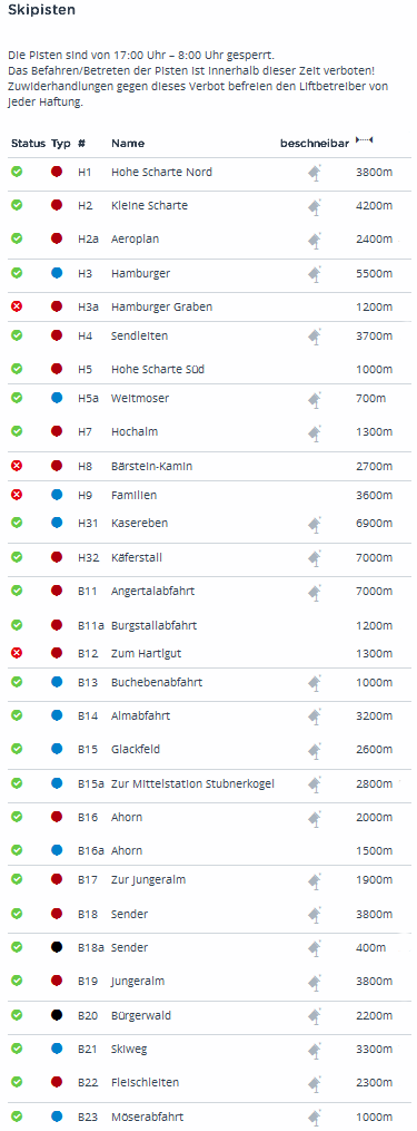 Fast ausschließlich Kunstschnee, besonders auf den Talabfahrten. Die Pisten waren aber in anbetracht der Naturschneelage sehr gut. Am Stubnerkogel und den Abfahrten von dort ins Angertal hatte es recht viele Steine, besonders im unteren Drittel. Überall liefen die Schneekanonen aber auf Volltouren