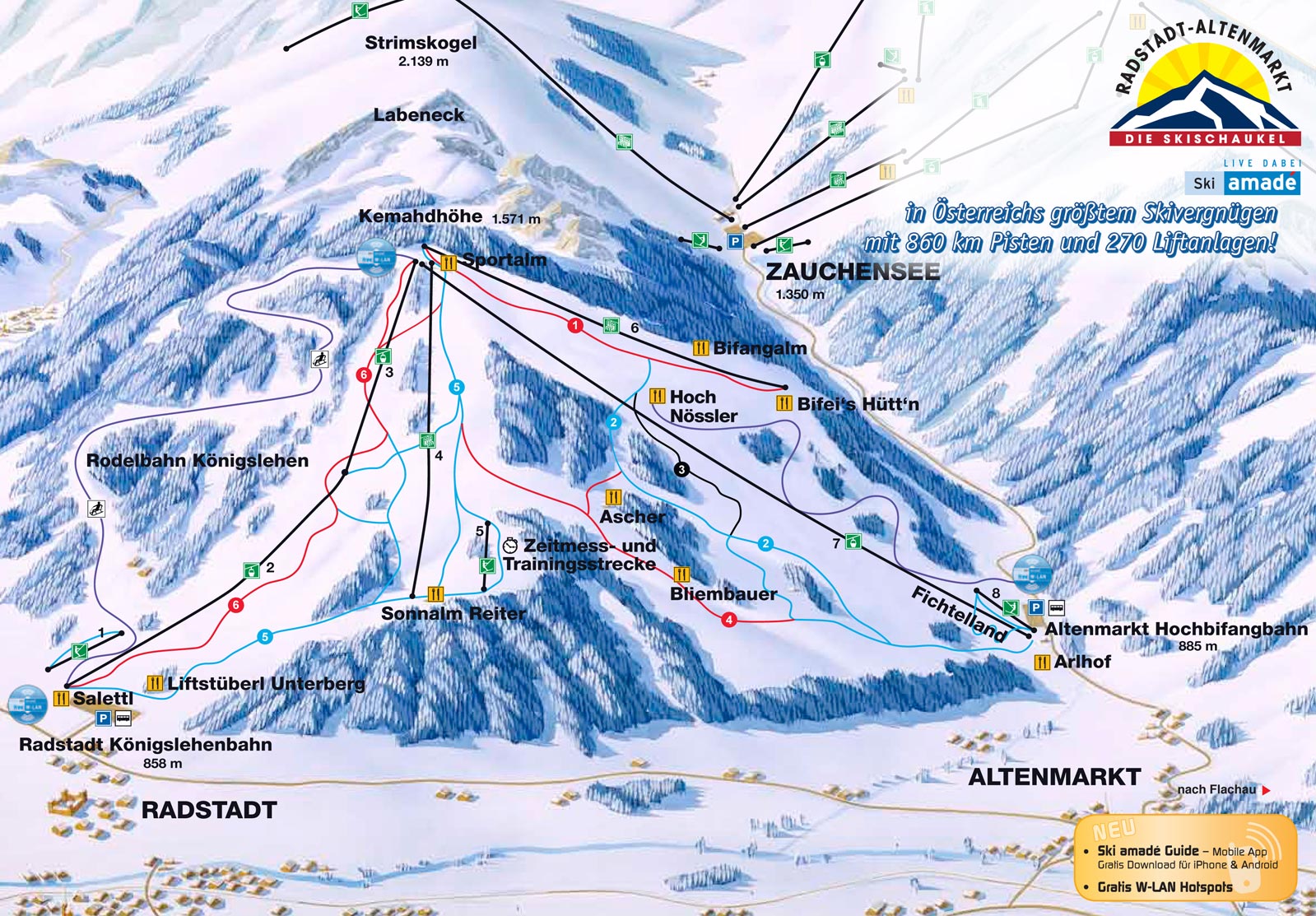 Überraschenderweise ist Radstadt-Altenmarkt ein sehr abwechsungsreiches Skigebiet, was man vom Plan her gar nicht vermuten mag … liegt es doch nur auf einem Berg. Aber durch die schnellen Anlagen und breiten Pisten zu unterschiedlichen Himmelsrichtungen wird es nicht langweilig und man kann sogar sehr gut Höhenmeter sammelt.