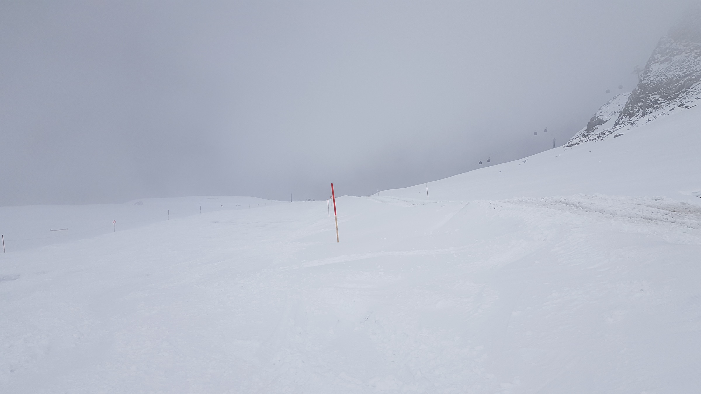 In der Nacht zu gestern hatte es etwas weniger stark gefroren, dadurch wurden die Pisten etwas früher weich. Zudem bereits morgens ein paar Wolken, nachmittags mehr. Insgesamt also etwas schlechter als Di/Mi aber immer noch gut. Allerdings nimmt die Schneeauflage seit gestern wieder ab und es kommt viel Gletschereis zum Vorschein. Di/Mi waren fast reine "Schneetage".