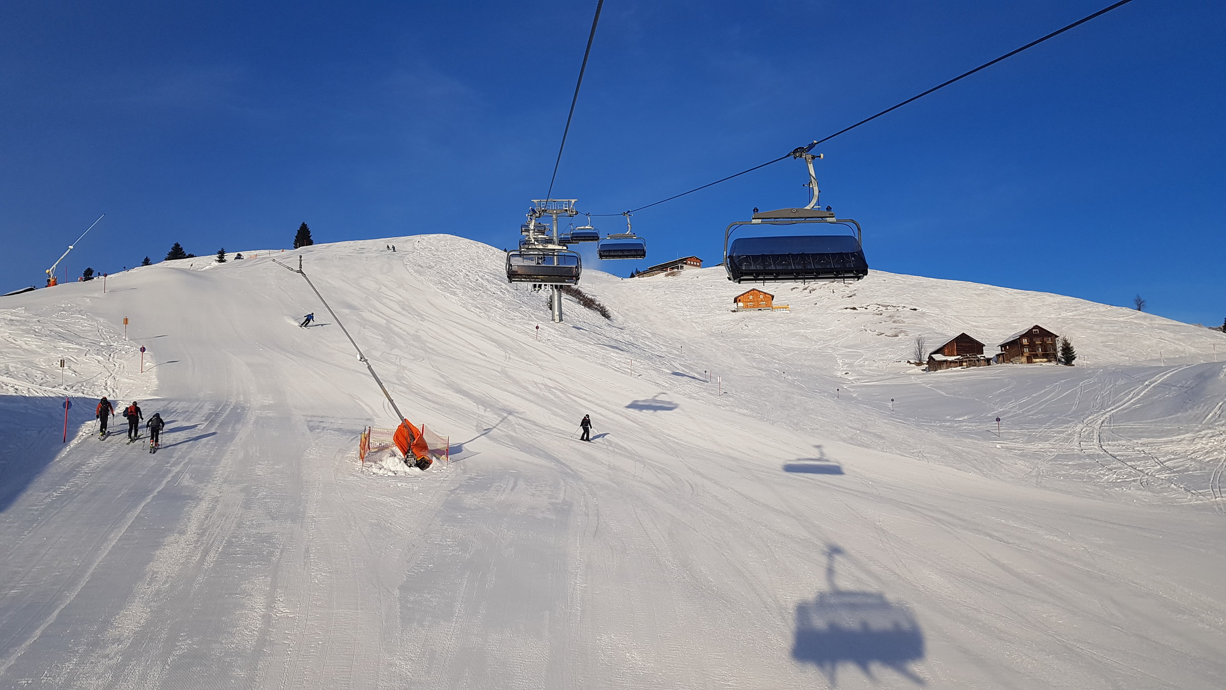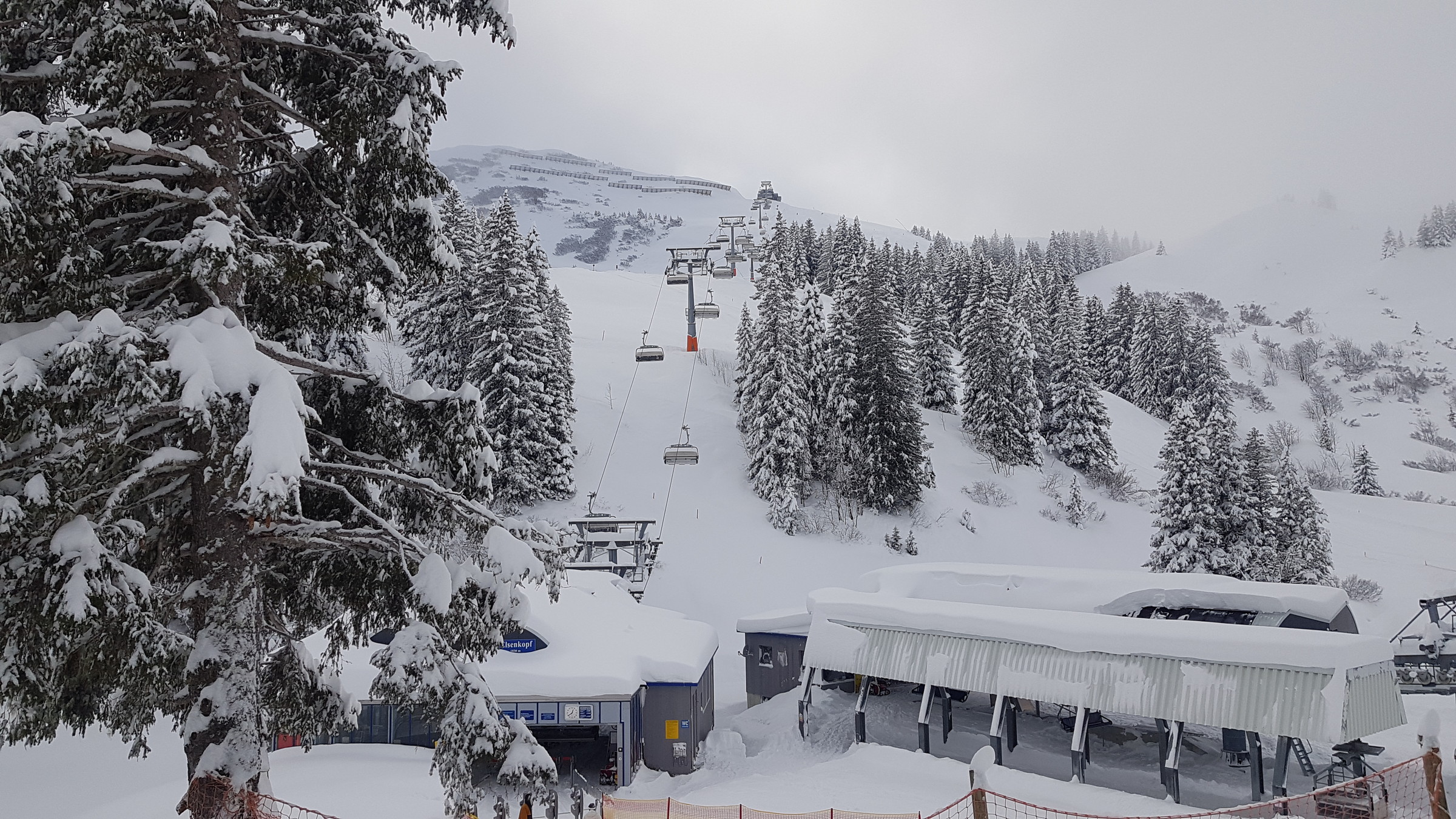 Ansonsten: noch vor Mittag waren neben Uga und Walisgaden auch Oberdamüls, Furka, Sunnegg, Hasenbühel, Elsenkopf, Hohes Licht und Hohe Wacht offen, wobei die letzten beiden auch schnell wieder schlossen. Los war deutlich mehr als gestern, aber man hatte Pisten und Lifte schon noch ziemlich für sich alleine.