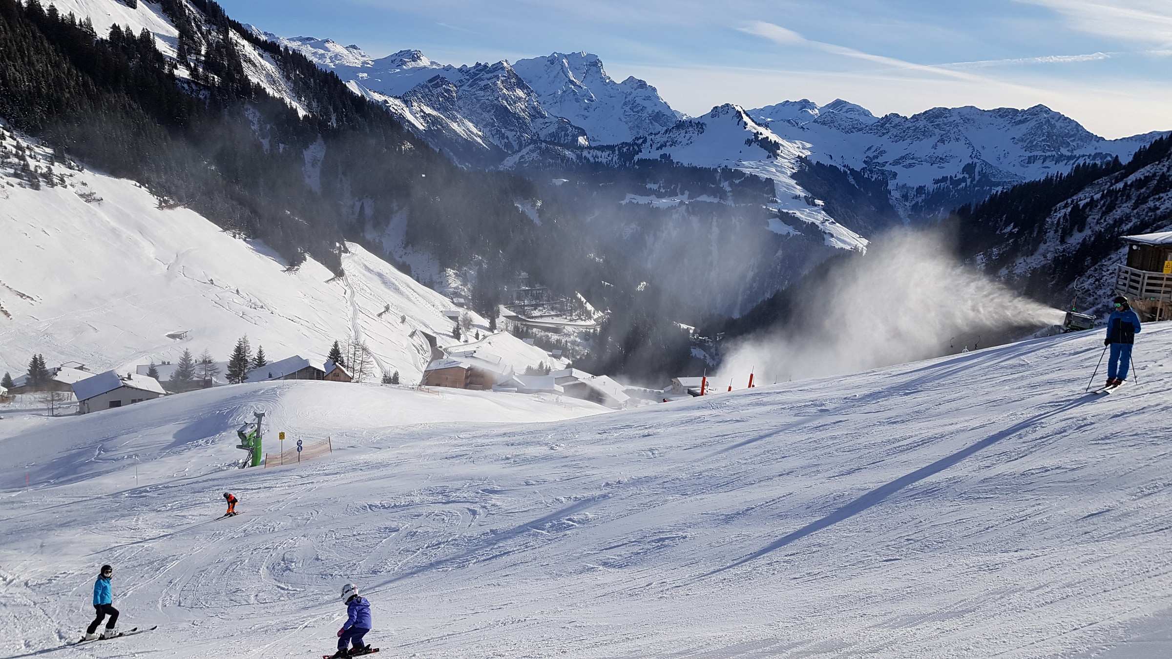Pisten in Damüls besser als beim letzten Mal, die beschneien auch Vollgas und bald werden weitere Pisten öffnen. Auch ist es nicht mehr so eisig wie es schon mal war, dennoch schaden gute Kanten nicht.