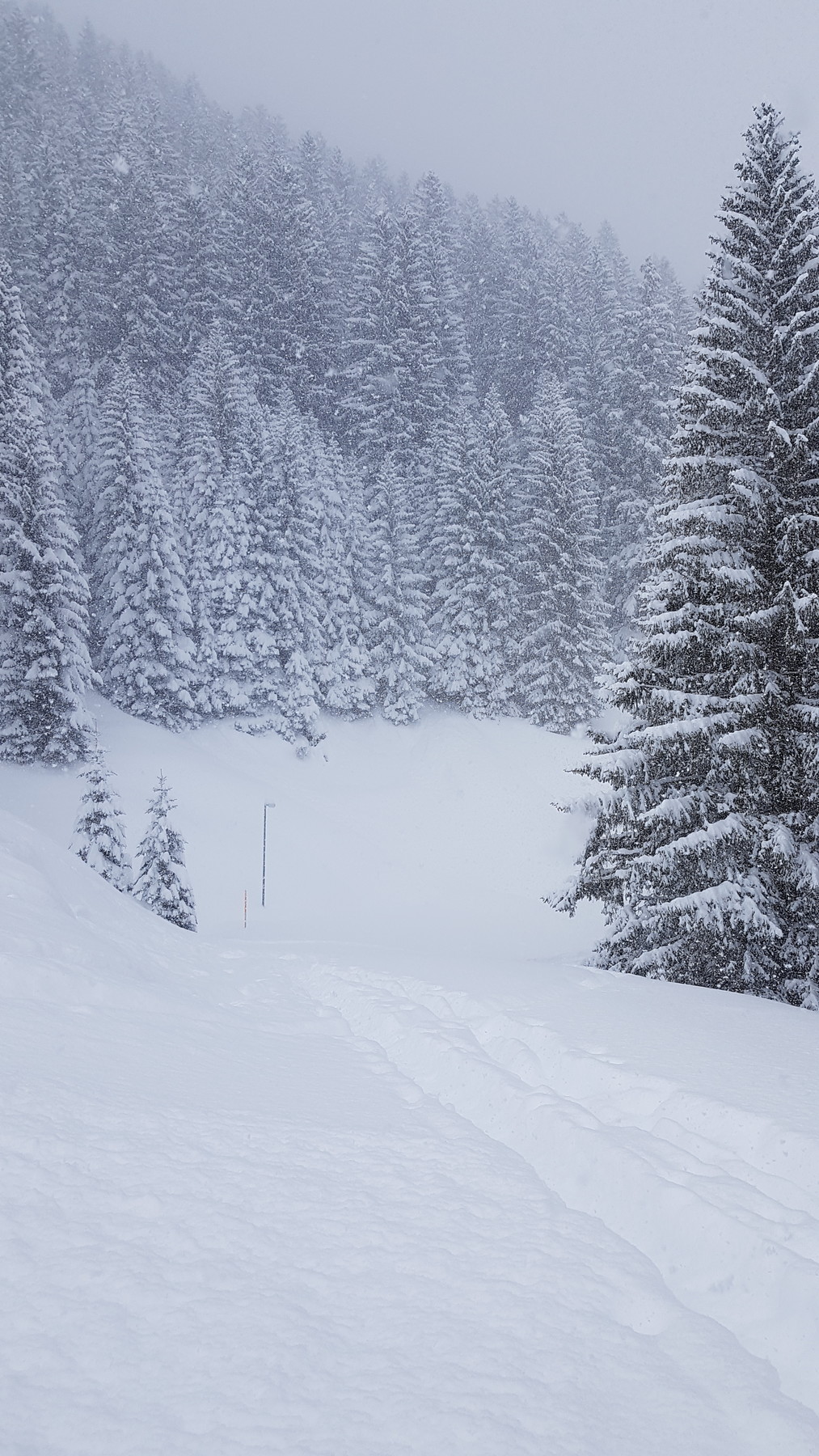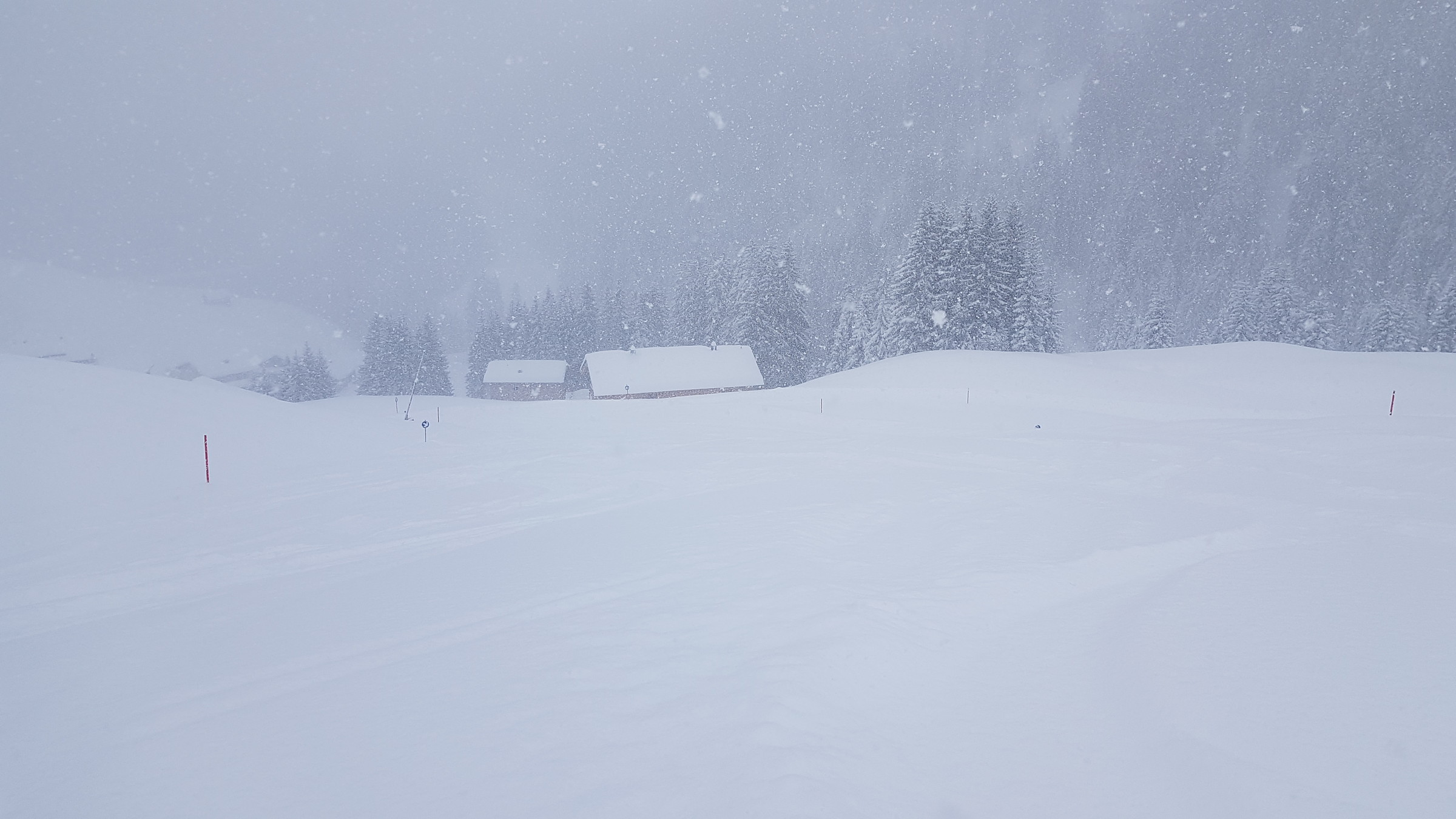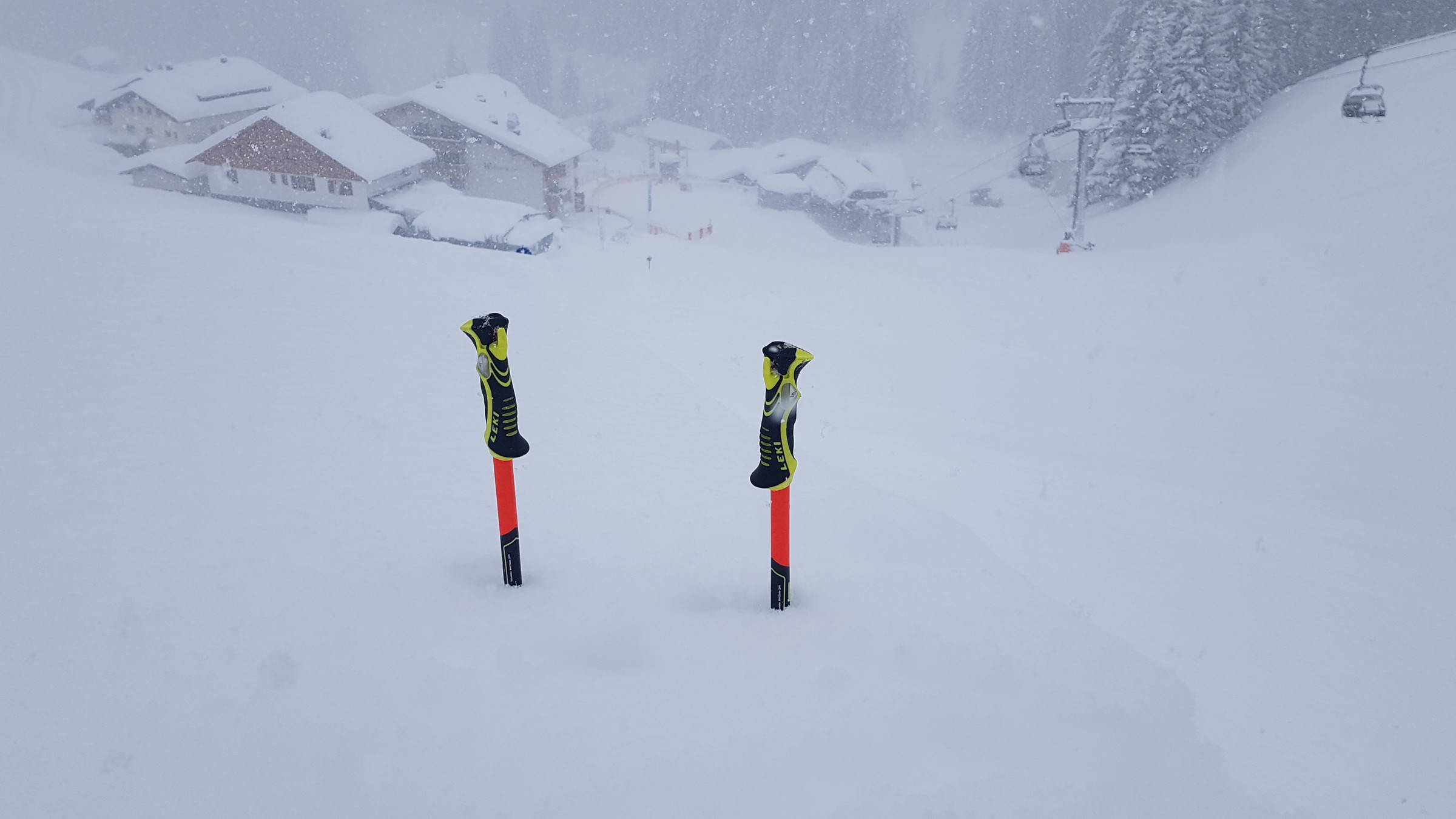 Im Gelände teilweise hüfttief (siehe Foto mit den 1,20 m Stöcken), aber auch auf den Pisten ordentlich Schnee. Und die nächsten Stunden schneit es wohl noch immer weiter :o 8)