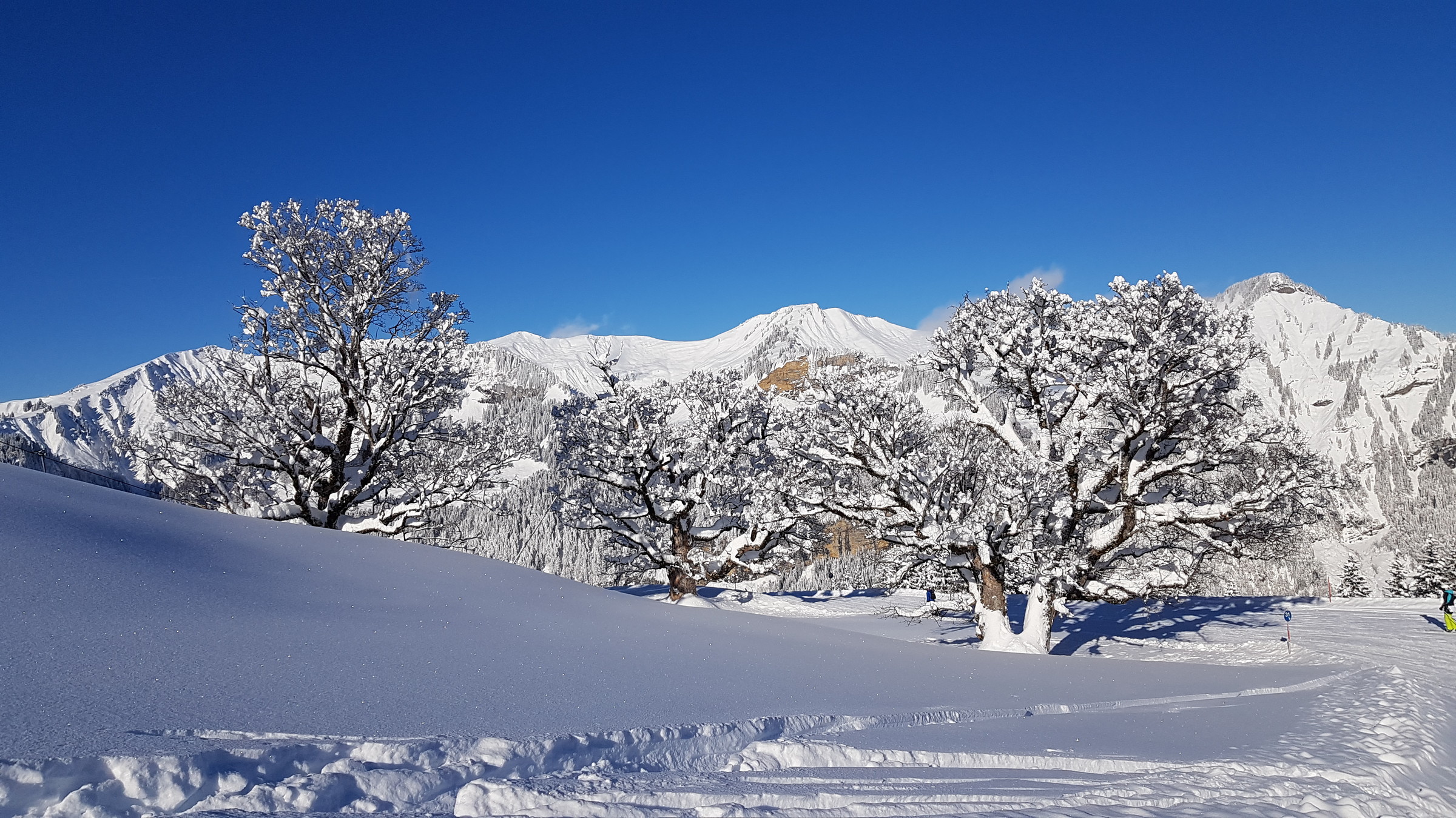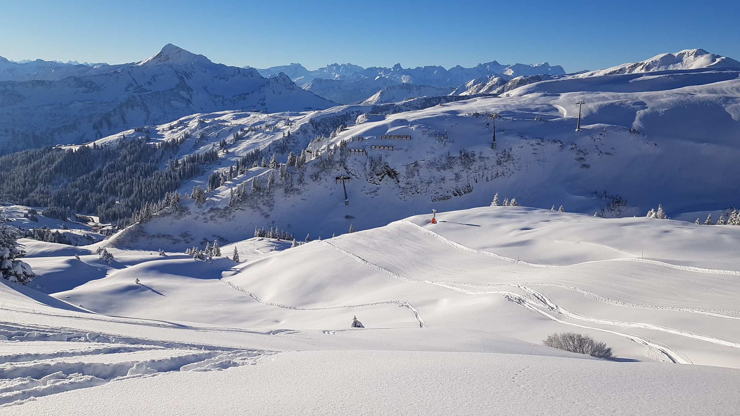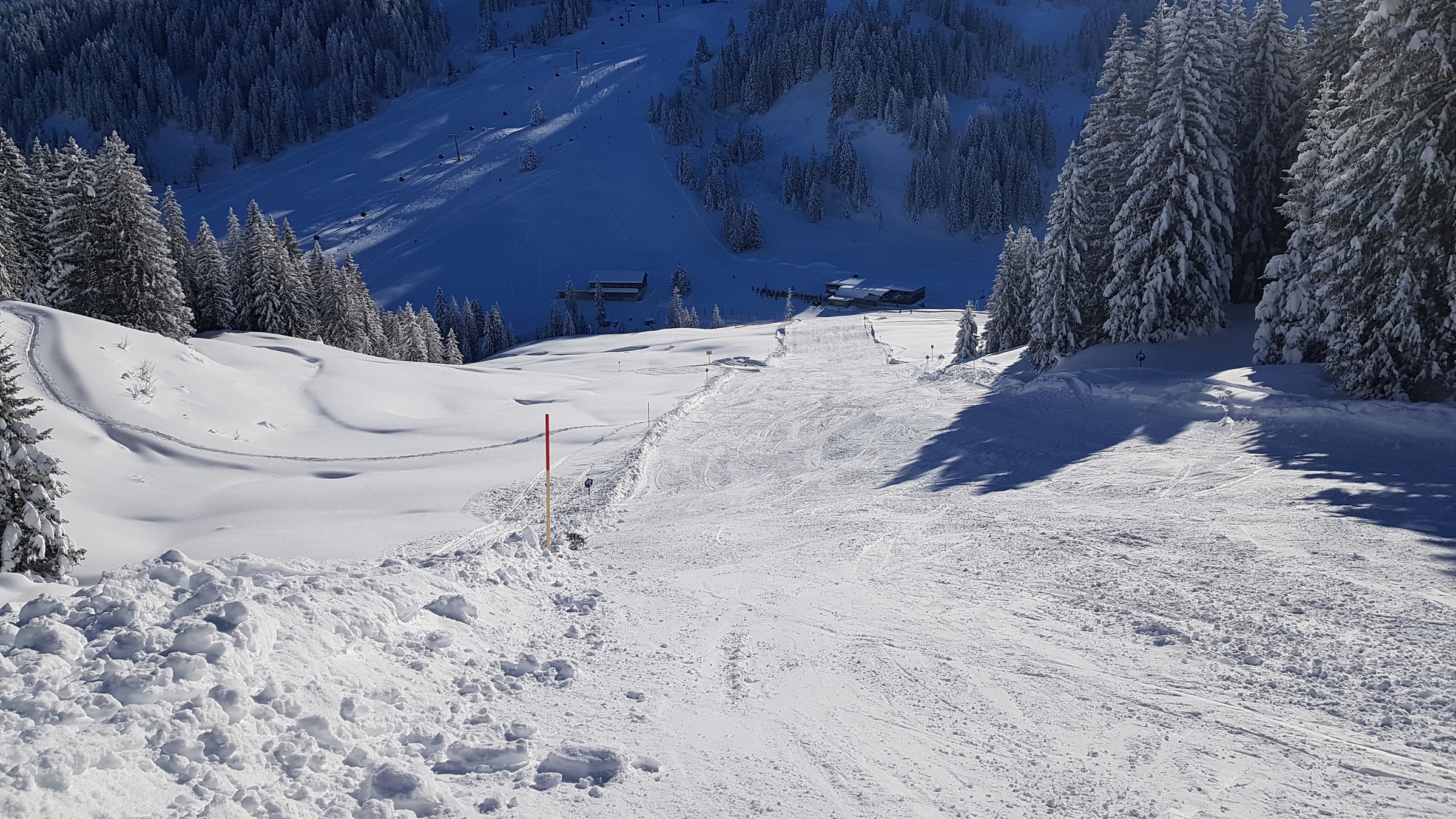 In Mellau zudem nun die Pisten 26, 27, 28, 30 und 33 hergerichtet, die blieben lange unzerfahren (während sich in Damüls dann doch schnell Buckel bildeten, wenn auch sehr weiche).