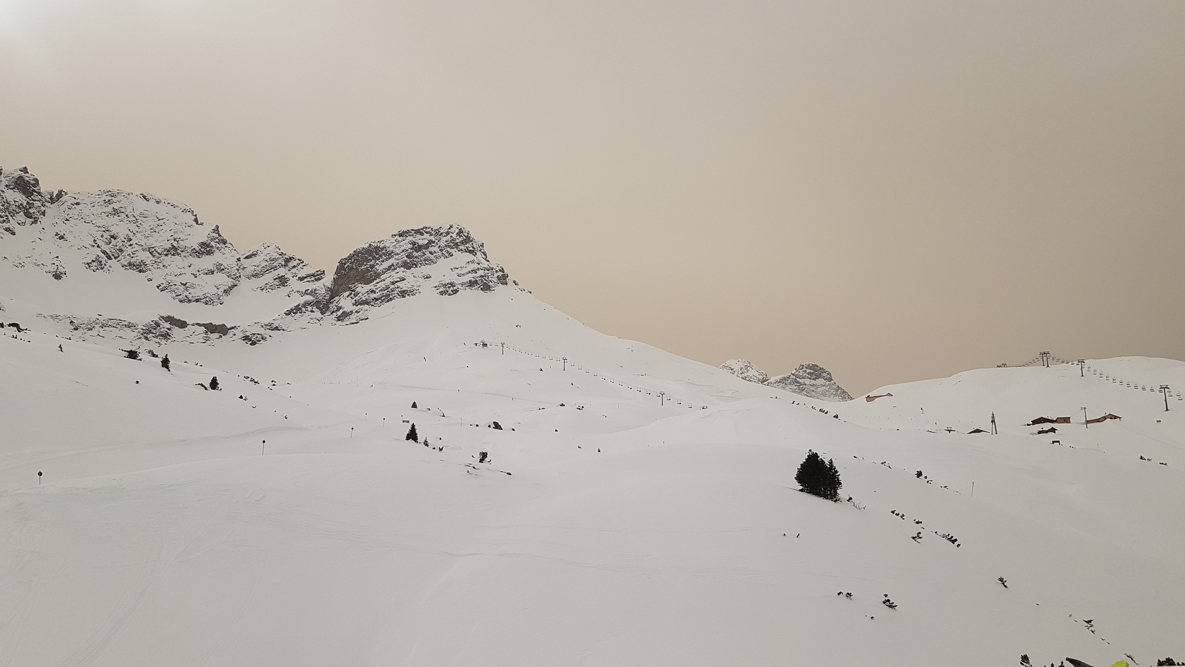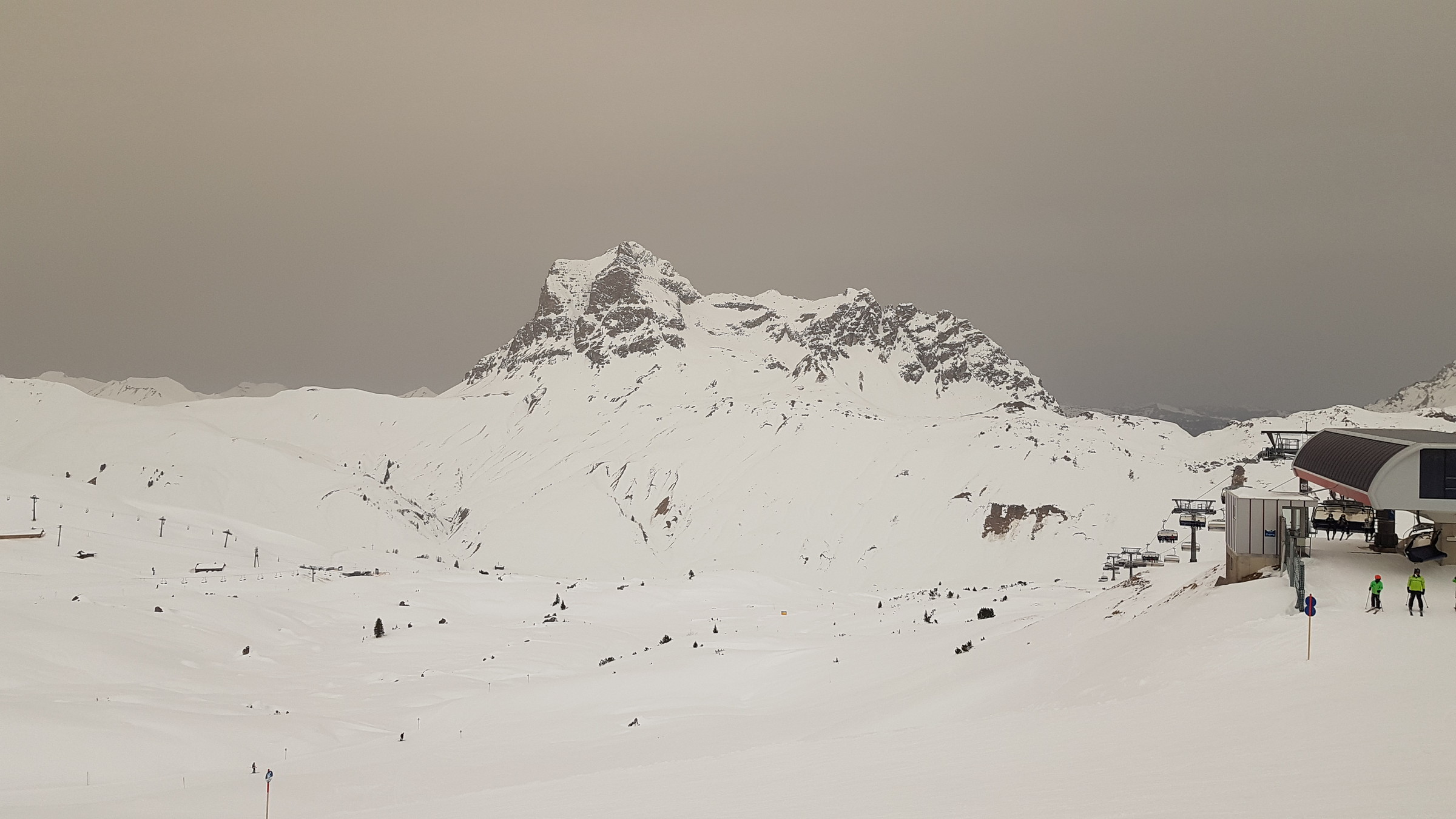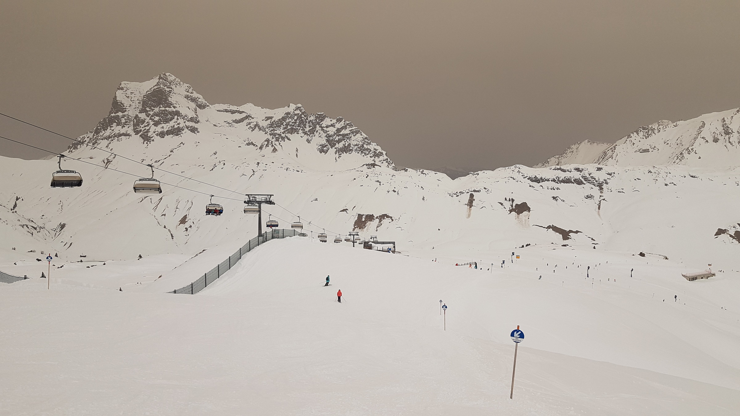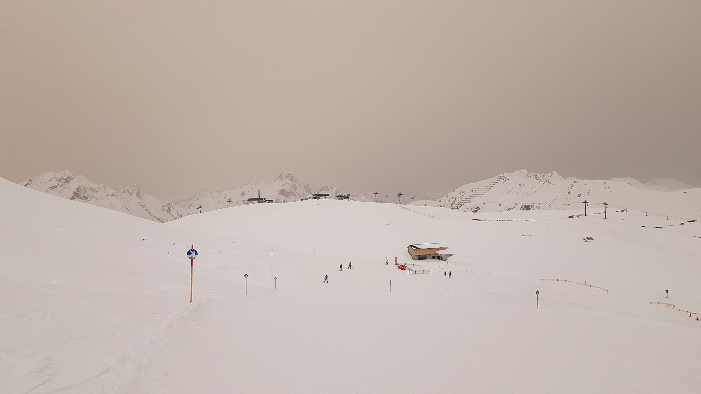 Heute war ich mal in Warth. Geöffnet sind aktuell Steffisalp, Wannenkopf, Wartherhorn, Jägeralp und Karhorn. Vormittags war relativ viel los, aber trotzdem musste man nur selten mal ein paar Sessel warten. Wohl einer der volleren Tage hier in letzter Zeit. Ab Mittag wurde es dann eh ruhiger. Das sonnige Wetter, das die meisten Wetterdienste versprachen, gab es nur zu Beginn. Im Laufe des Tages wurde die Luft immer sandiger und gelber. So gegen 14 Uhr war das Licht besonders krass: alles in braun-gelb-grau getunkt. Schon eine ungewöhnliche Stimmung, auch wenn zunehmend die Bodensicht darunter litt. Der Schnee morgens noch relativ hart, dann den restlichen Tag aber überall sulzig-weich. An den Talstationen ging es Richtung 10 °C.