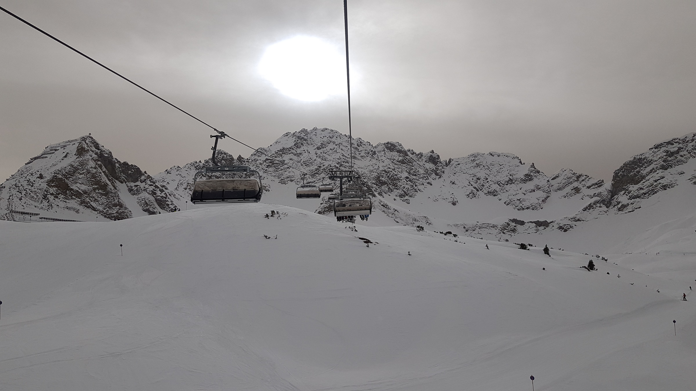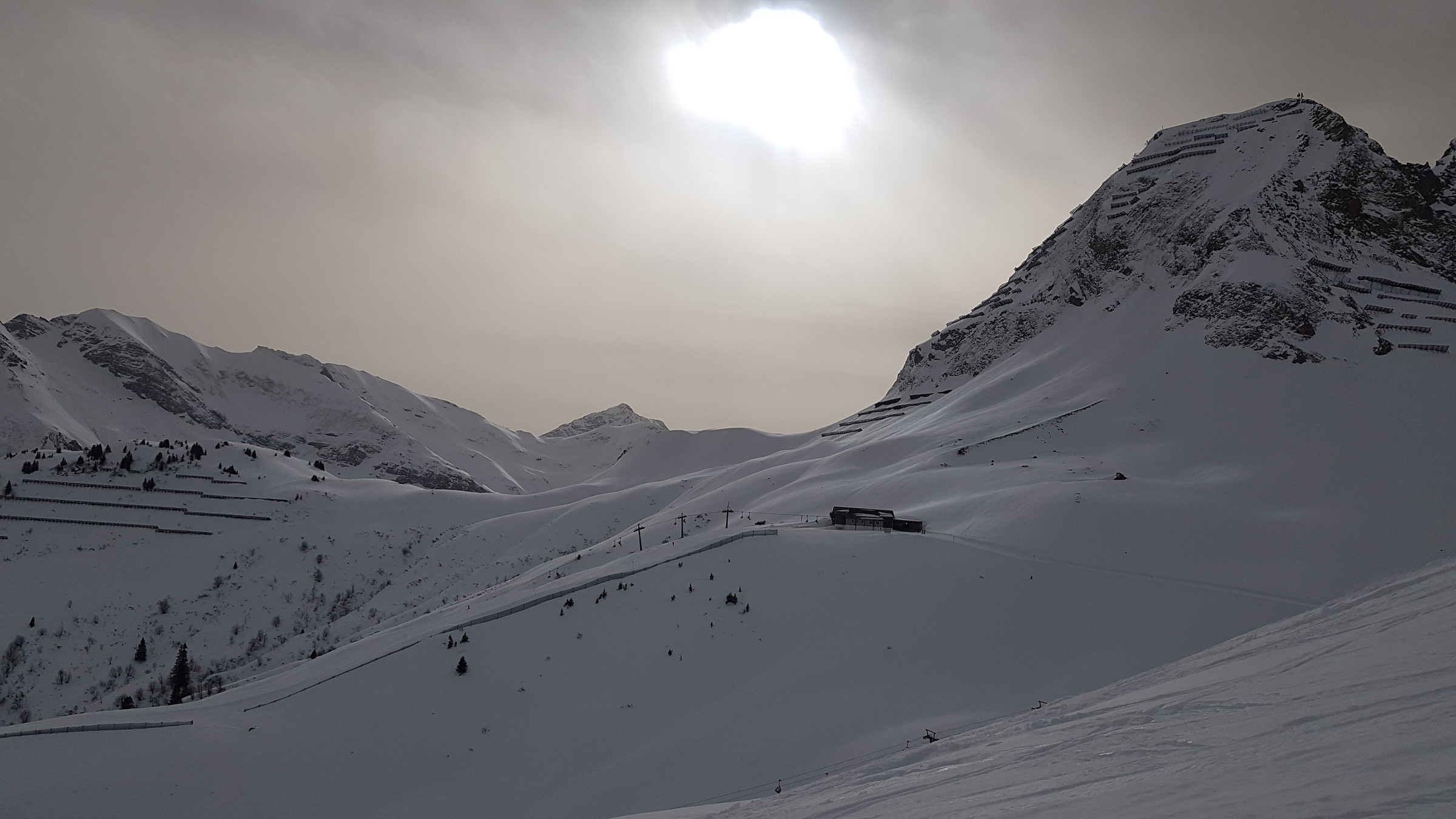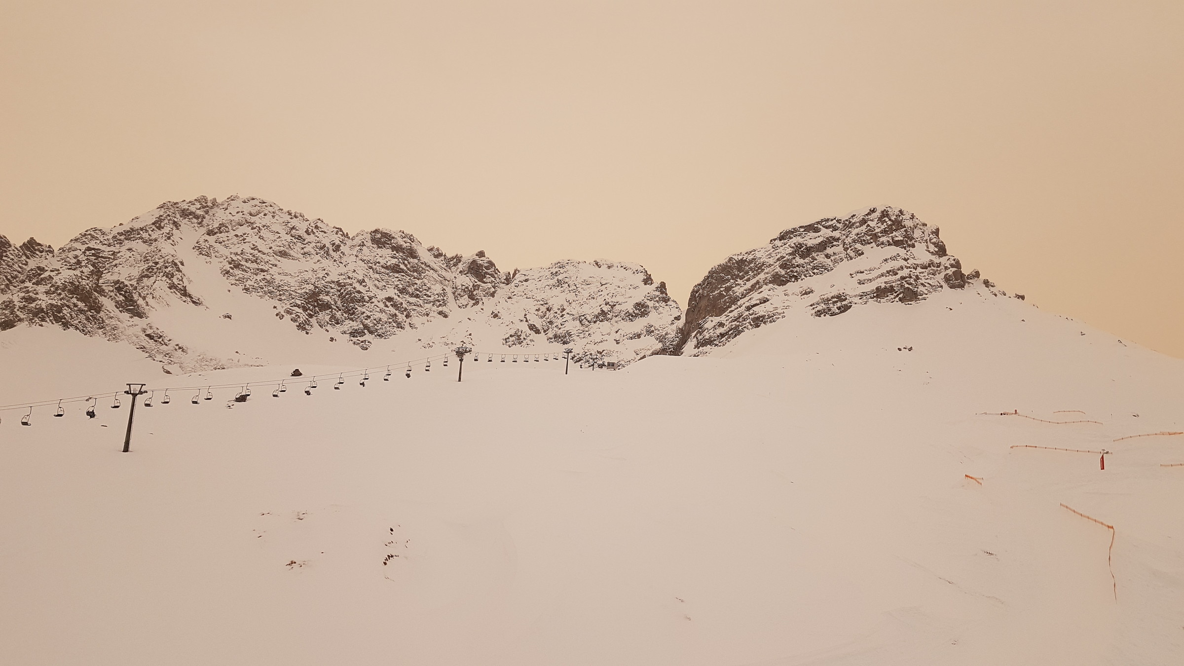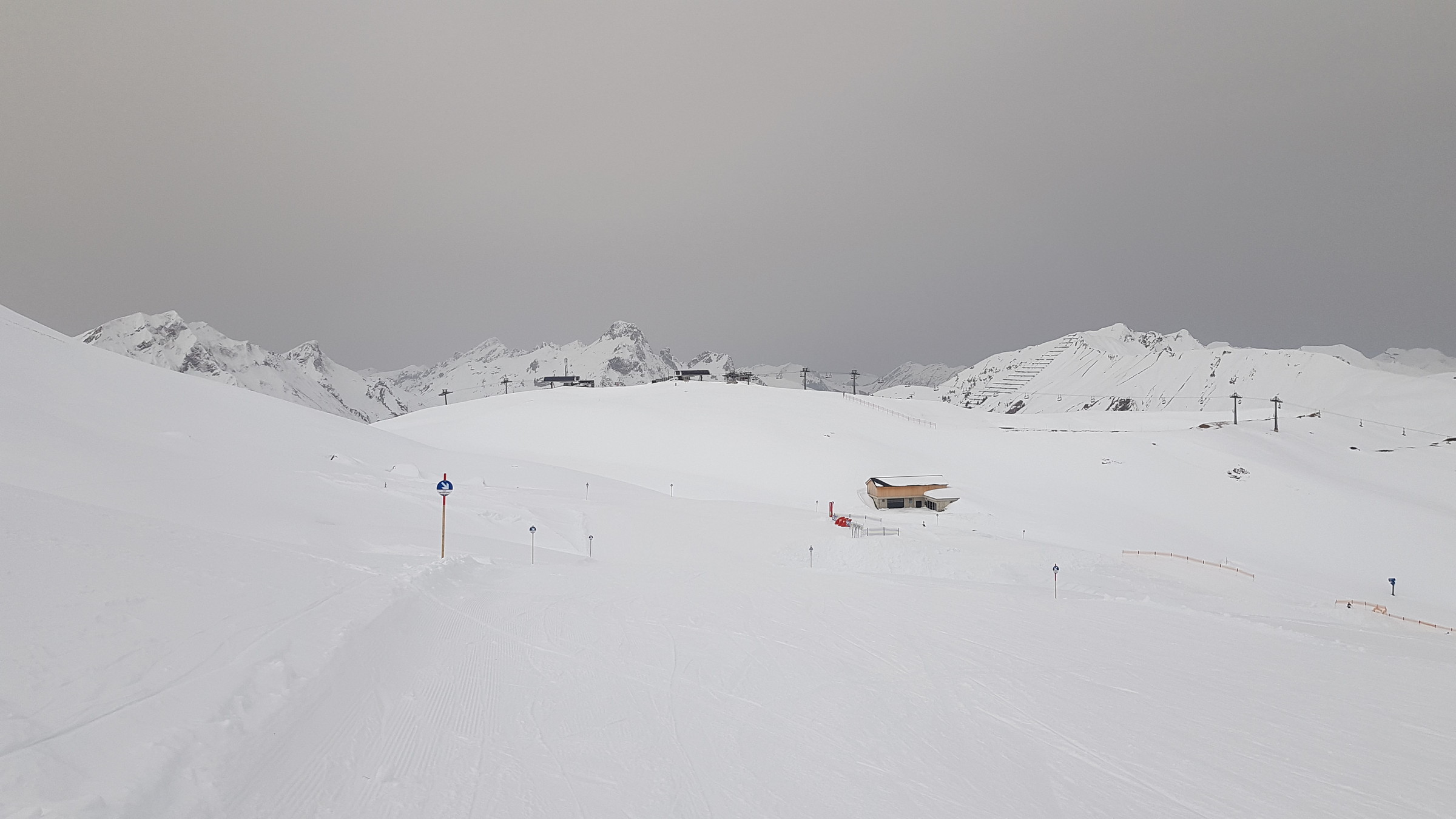 Heute war ich mal in Warth. Geöffnet sind aktuell Steffisalp, Wannenkopf, Wartherhorn, Jägeralp und Karhorn. Vormittags war relativ viel los, aber trotzdem musste man nur selten mal ein paar Sessel warten. Wohl einer der volleren Tage hier in letzter Zeit. Ab Mittag wurde es dann eh ruhiger. Das sonnige Wetter, das die meisten Wetterdienste versprachen, gab es nur zu Beginn. Im Laufe des Tages wurde die Luft immer sandiger und gelber. So gegen 14 Uhr war das Licht besonders krass: alles in braun-gelb-grau getunkt. Schon eine ungewöhnliche Stimmung, auch wenn zunehmend die Bodensicht darunter litt. Der Schnee morgens noch relativ hart, dann den restlichen Tag aber überall sulzig-weich. An den Talstationen ging es Richtung 10 °C.