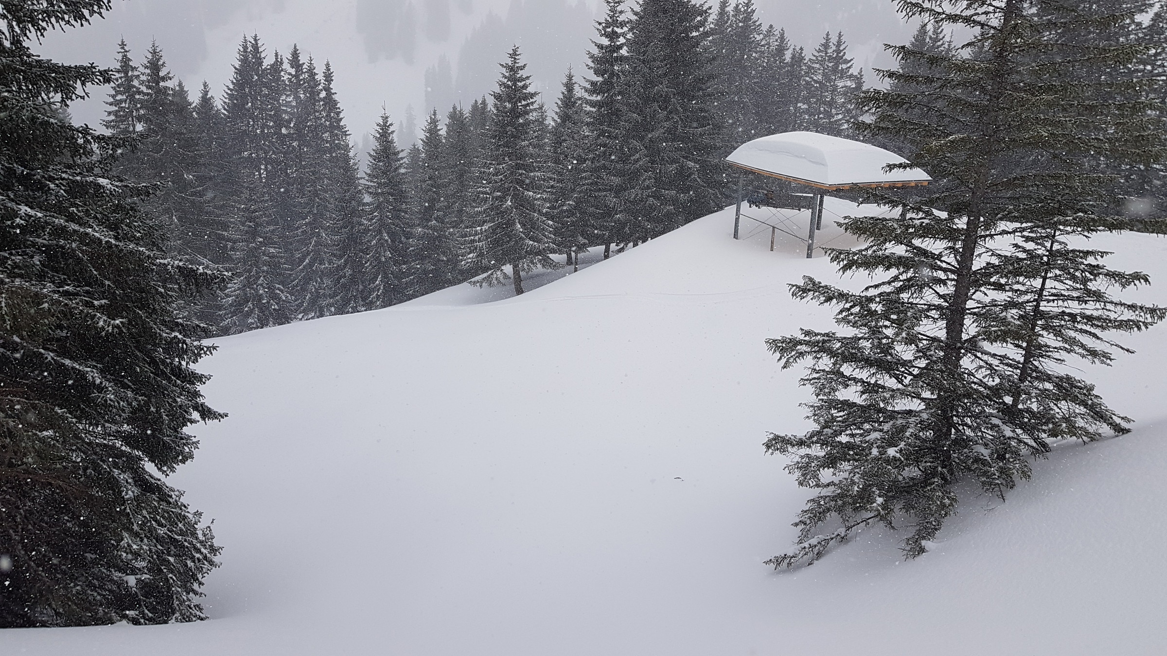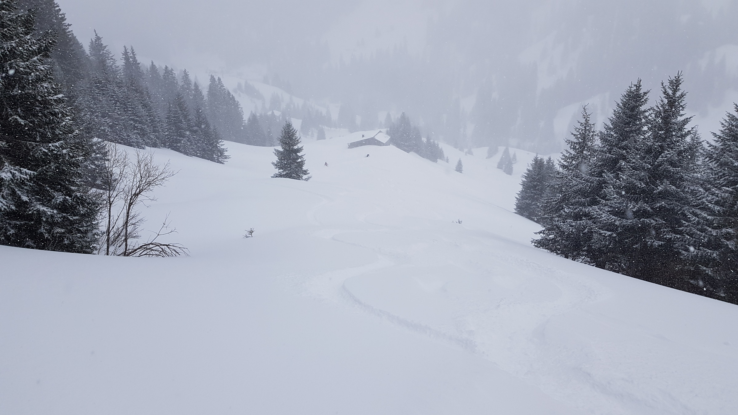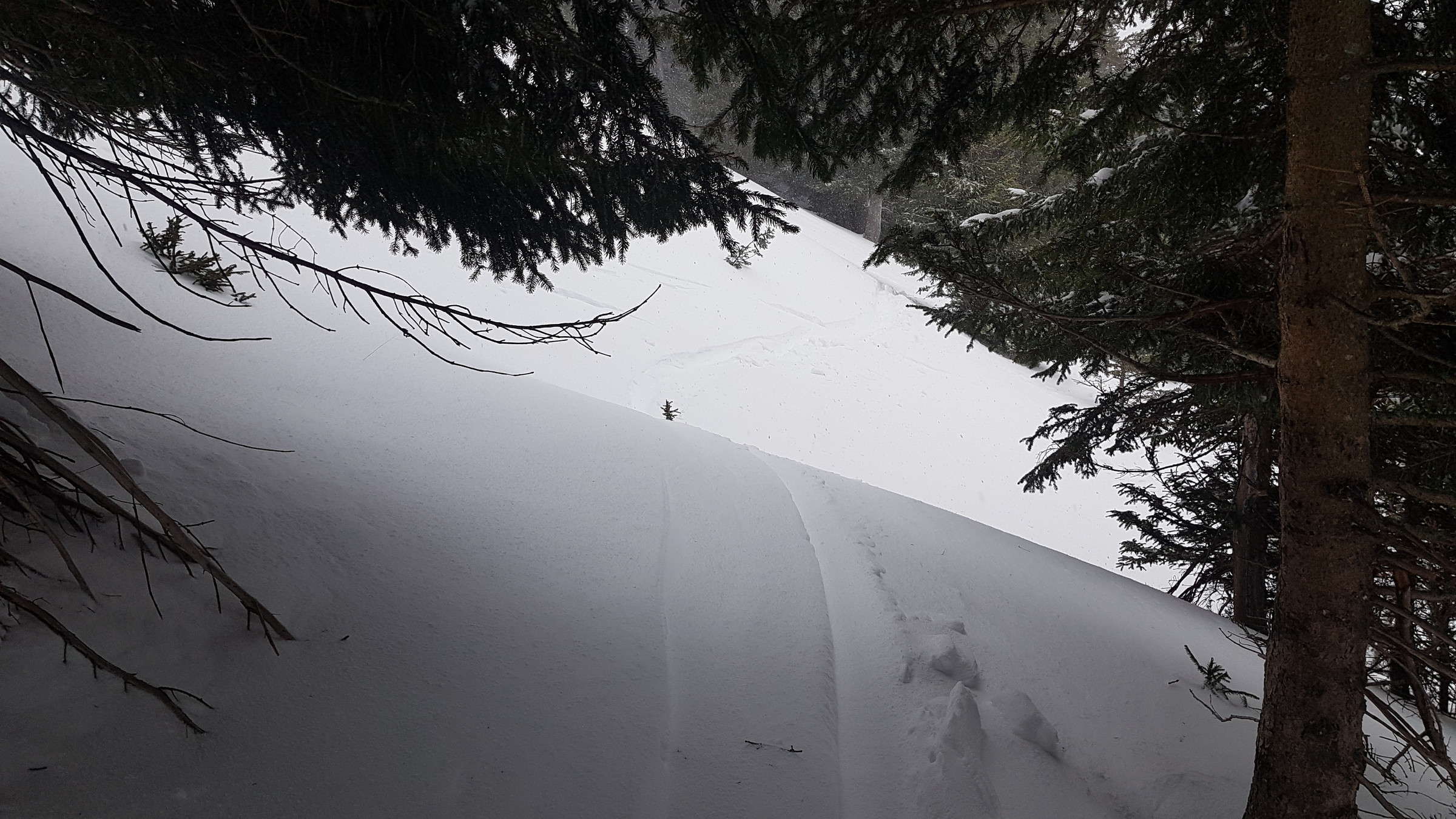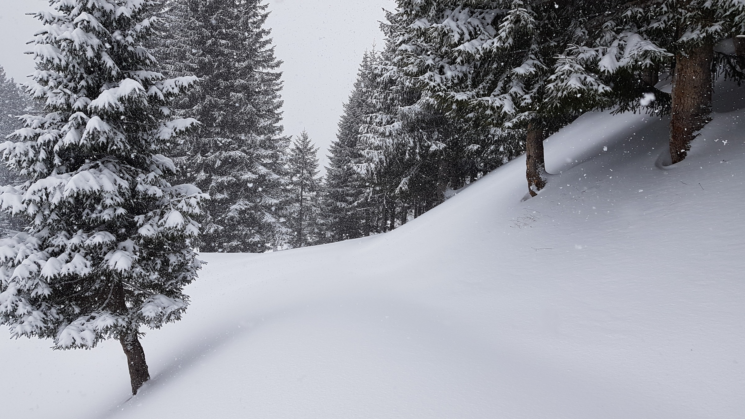 Über Nacht und im Laufe des Vormittags sind etwa 30 cm hinzugekommen. In höheren Lagen der Schnee allerdings mal wieder ziemlich gepresst und heute immer mal wieder Graupel. Also ein ähnliches Spiel wie letzte Woche. In windgeschützten Bereichen, vor allem in den Wäldern aber trotzdem ganz netter, unverspurter Pulverschnee