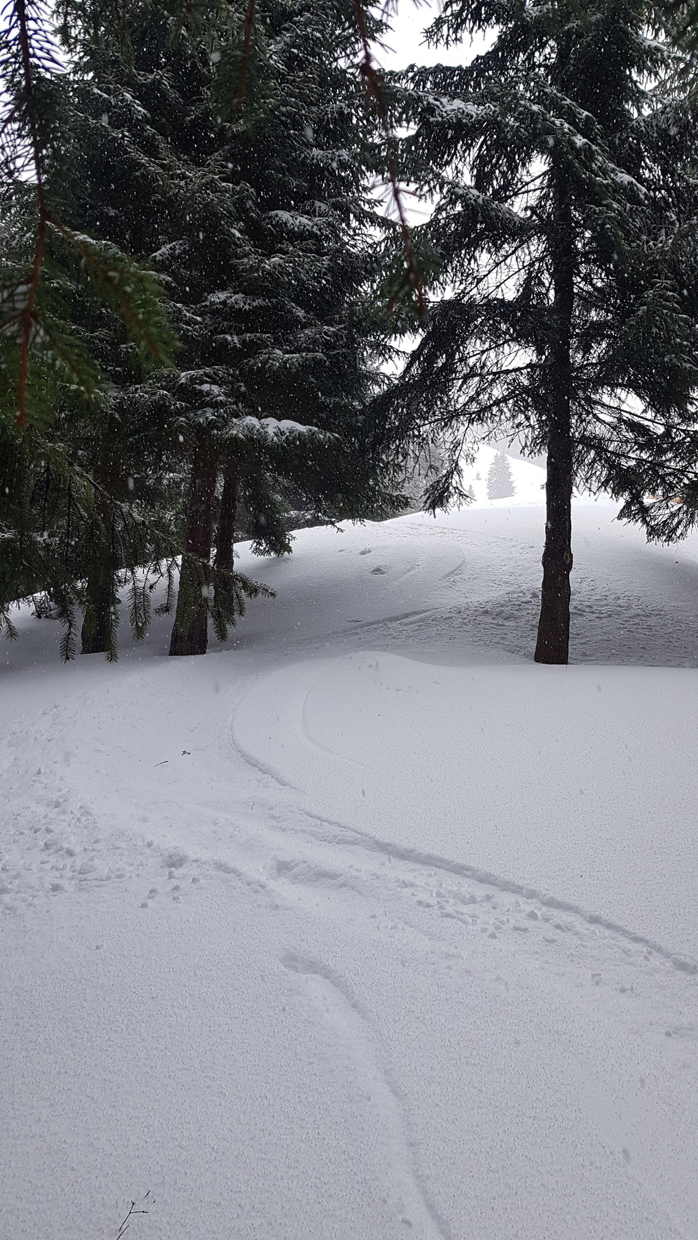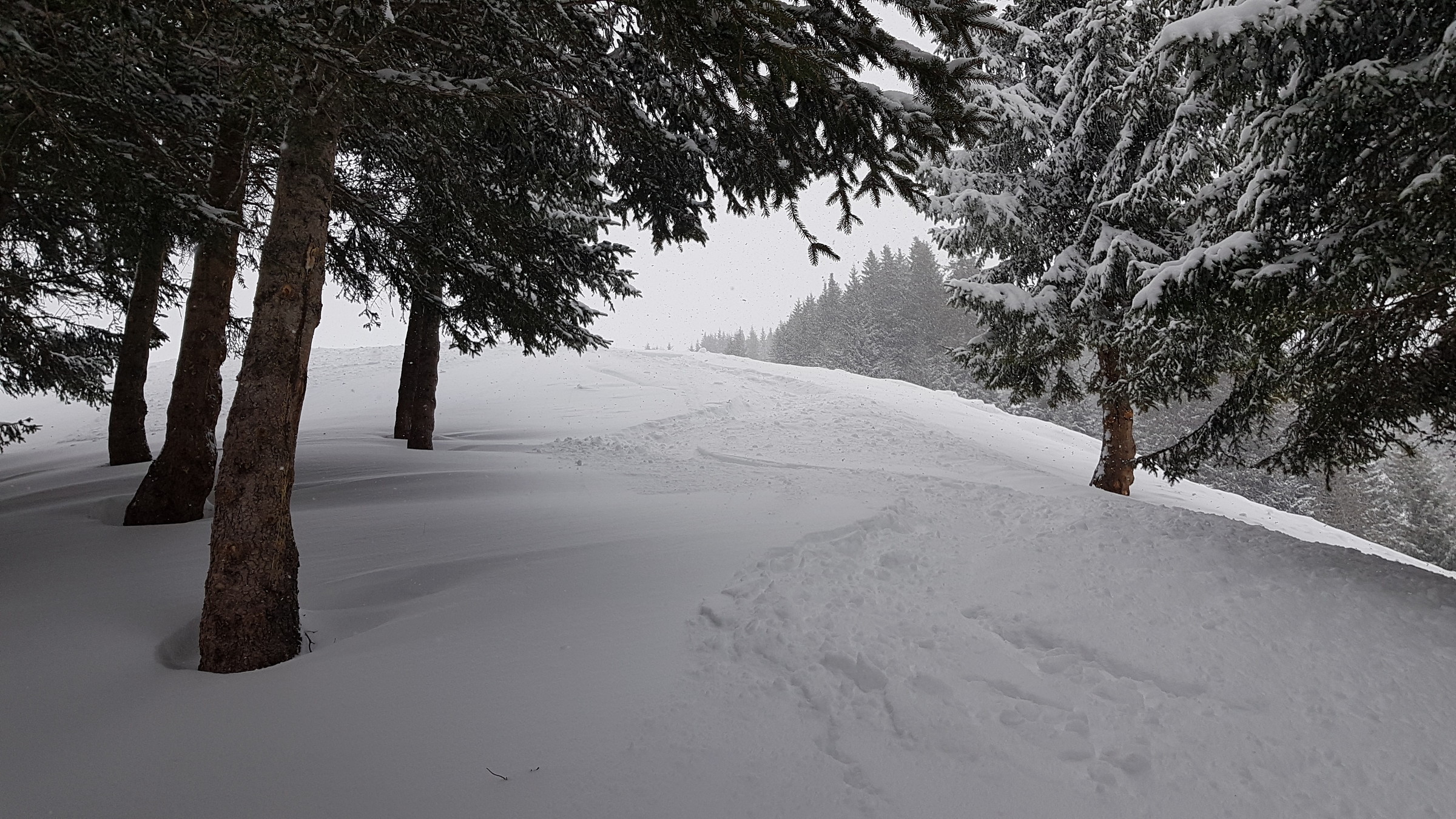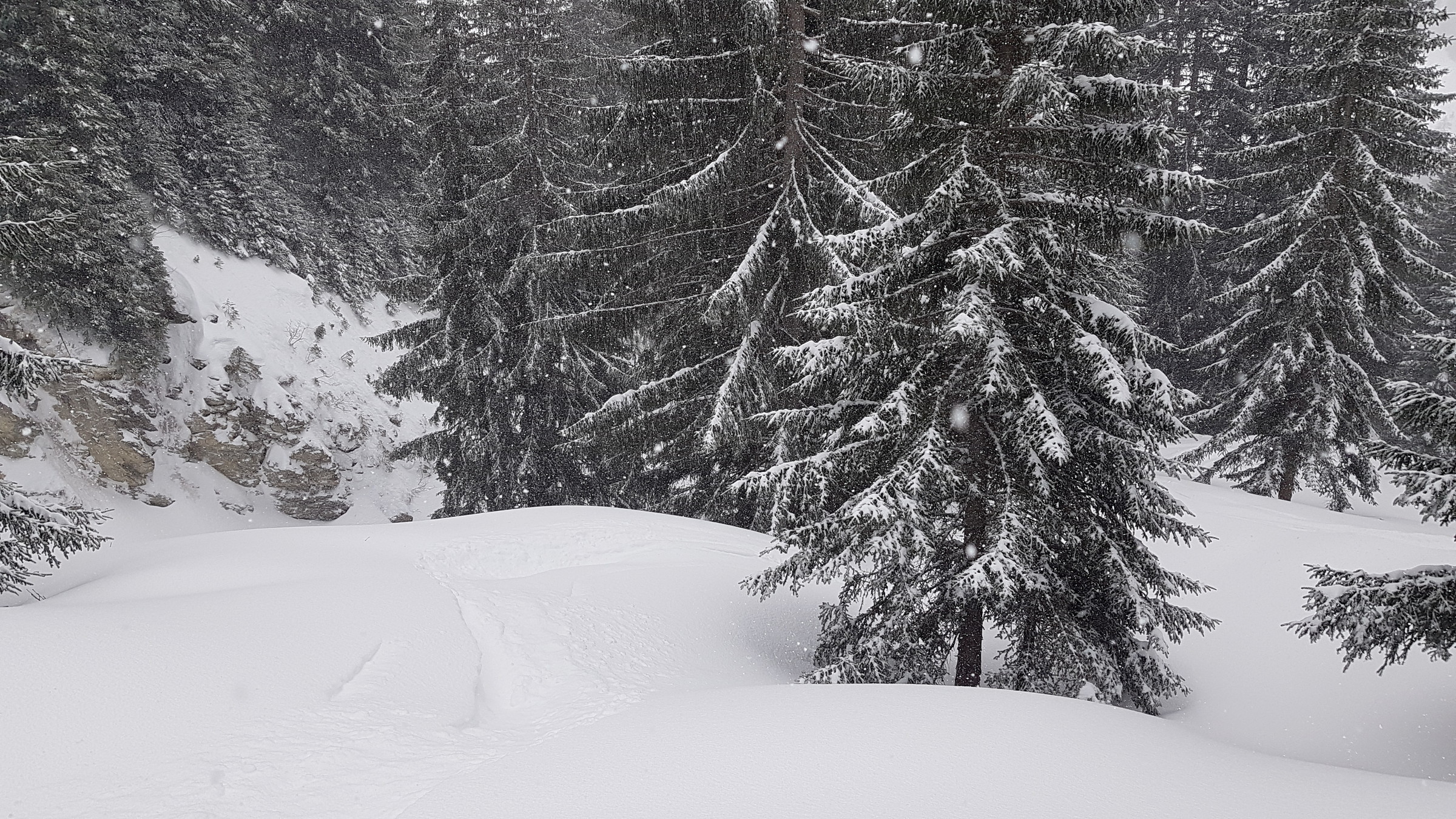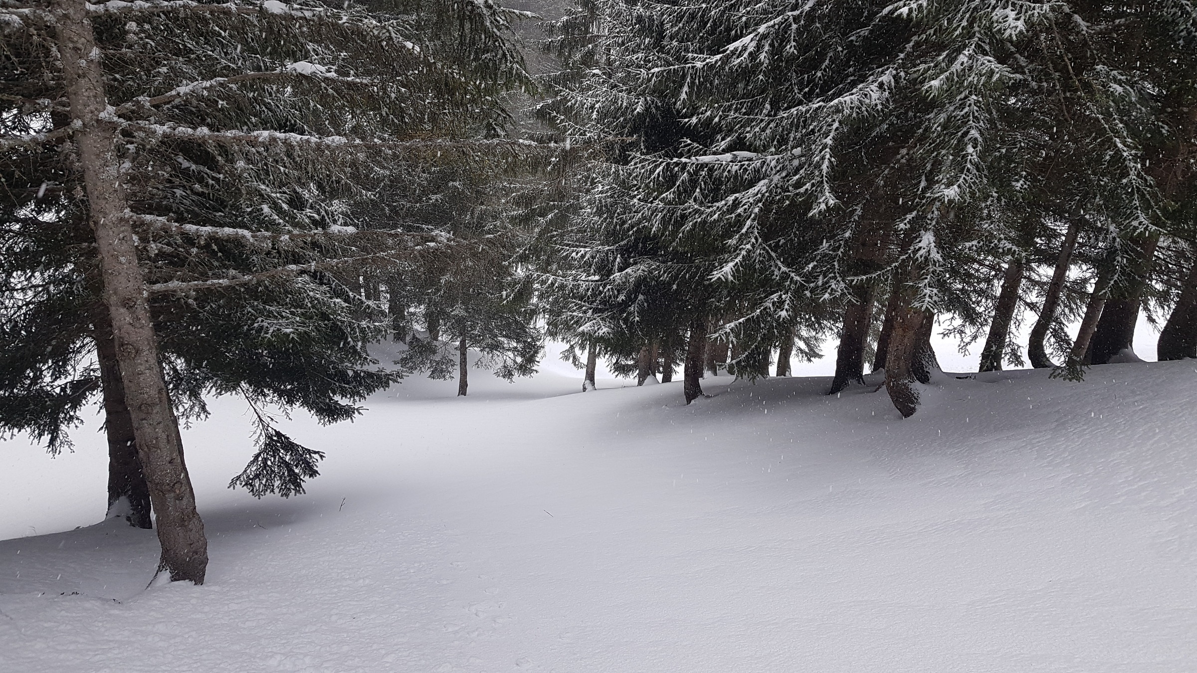 Über Nacht und im Laufe des Vormittags sind etwa 30 cm hinzugekommen. In höheren Lagen der Schnee allerdings mal wieder ziemlich gepresst und heute immer mal wieder Graupel. Also ein ähnliches Spiel wie letzte Woche. In windgeschützten Bereichen, vor allem in den Wäldern aber trotzdem ganz netter, unverspurter Pulverschnee