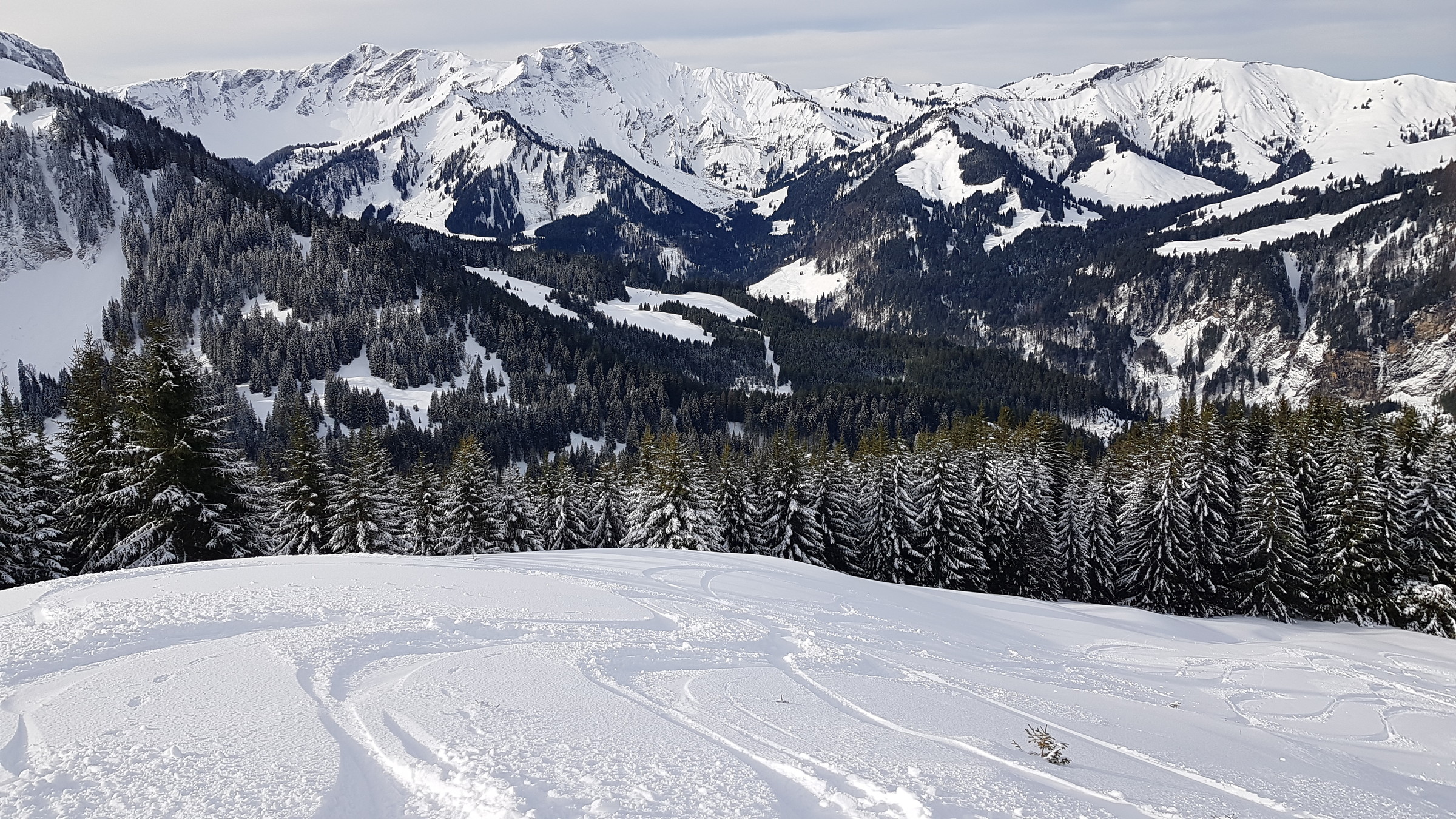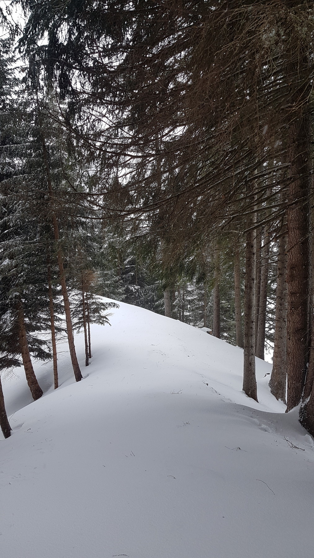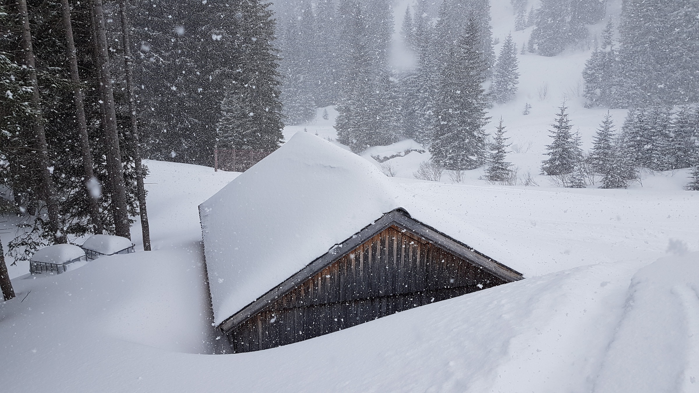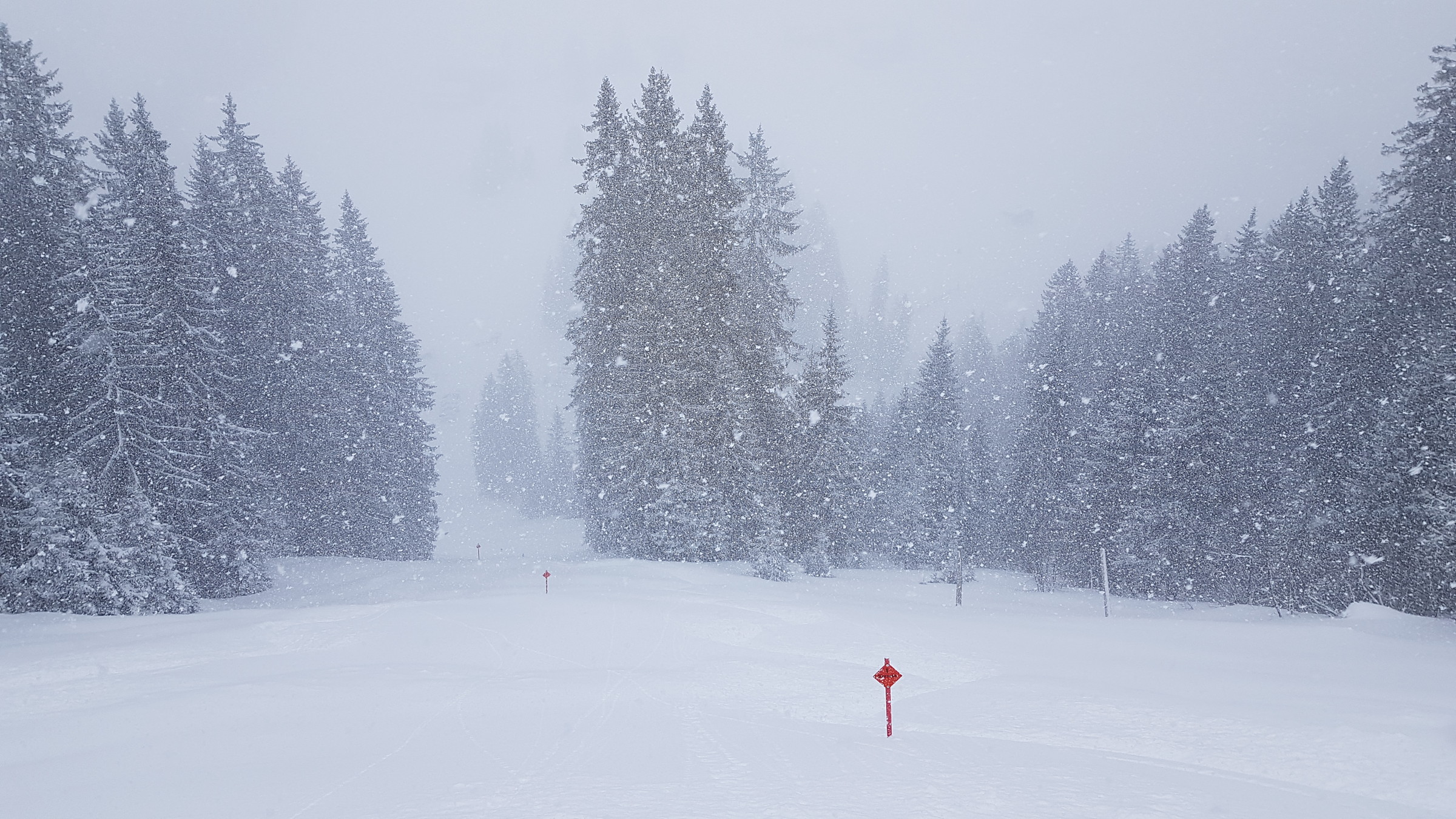 Über Nacht und im Laufe des Vormittags sind etwa 30 cm hinzugekommen. In höheren Lagen der Schnee allerdings mal wieder ziemlich gepresst und heute immer mal wieder Graupel. Also ein ähnliches Spiel wie letzte Woche. In windgeschützten Bereichen, vor allem in den Wäldern aber trotzdem ganz netter, unverspurter Pulverschnee
