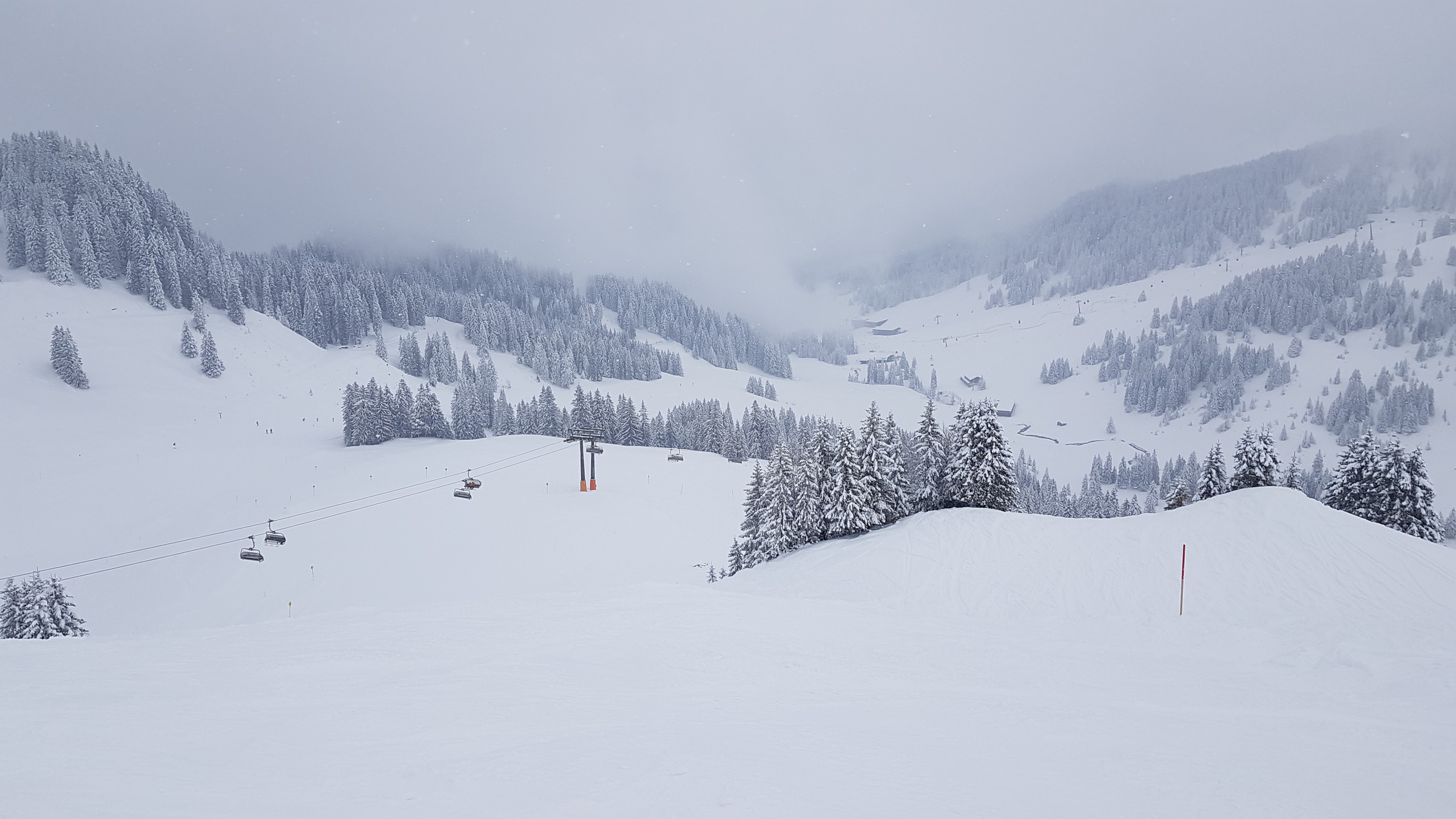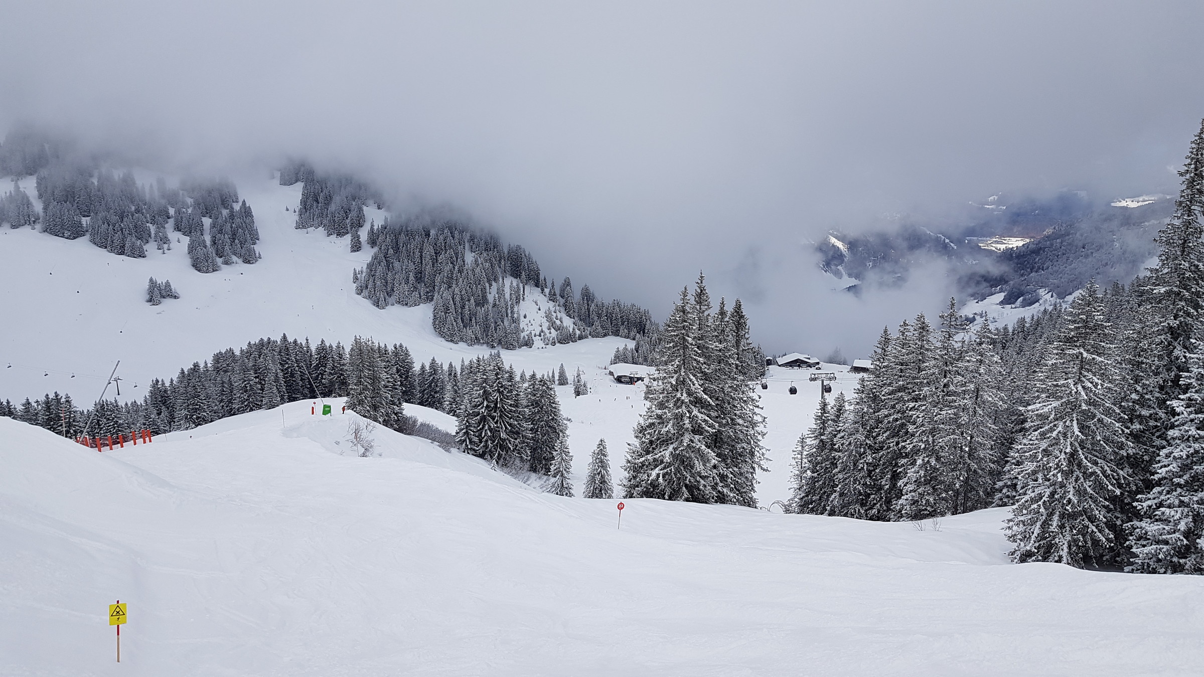 Der Wetterbericht prognostizierte eine Wetterbesserung im Laufe des Tages mit überwiegend Sonnenschein am Nachmittag. Als dann am späteren Vormittag erstmals die Sonne etwas durchkam, fuhr ich zum Parkplatz in Damüls und wechselte von der Schlechtwetter-Skibrille zur Sonnenbrille. Das stellte sich als schwerer Fehler heraus, denn plötzlich hat es wieder komplett zugezogen und am frühen Nachmittag schneite es sogar aus dichten Wolken. Erst nach 14.00 Uhr wurde es wieder besser. Vollständig konnte sich die Sonne aber nicht mehr durchsetzen.