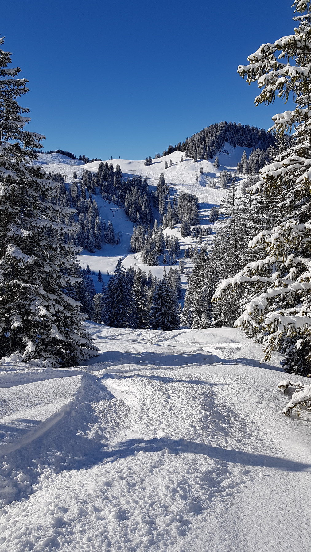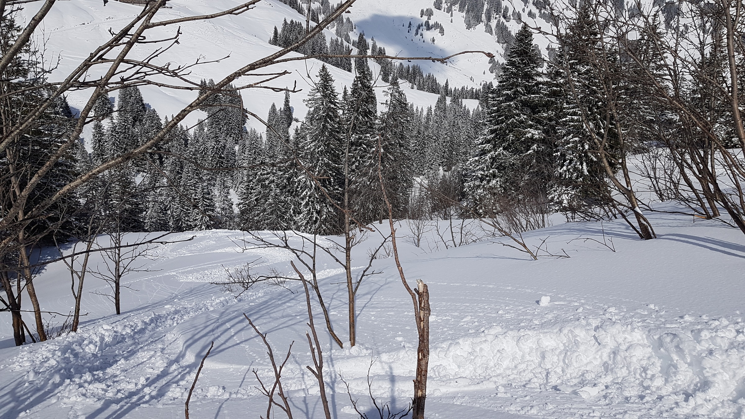 Gestern war es echt nochmal sehr schön abseits der Pisten (siehe unten). heute war es dann schon wieder vorbei mit der winterlichen Atmosphäre: die Tannen wieder schneefrei, genauso wie manche Südhänge. Außerdem der Schnee zunehmend nass und teils klebrig bei über 10 Grad.