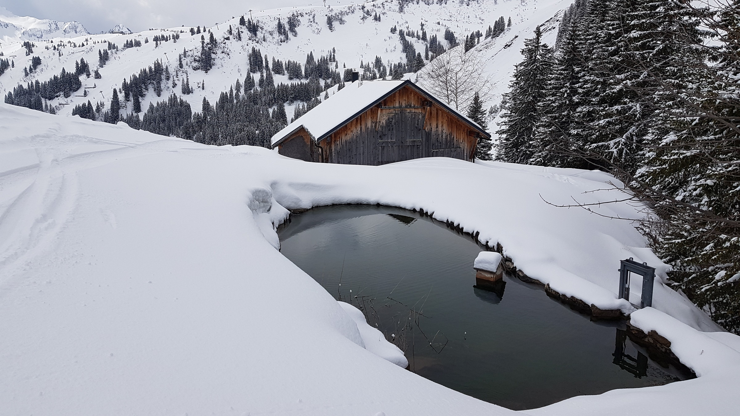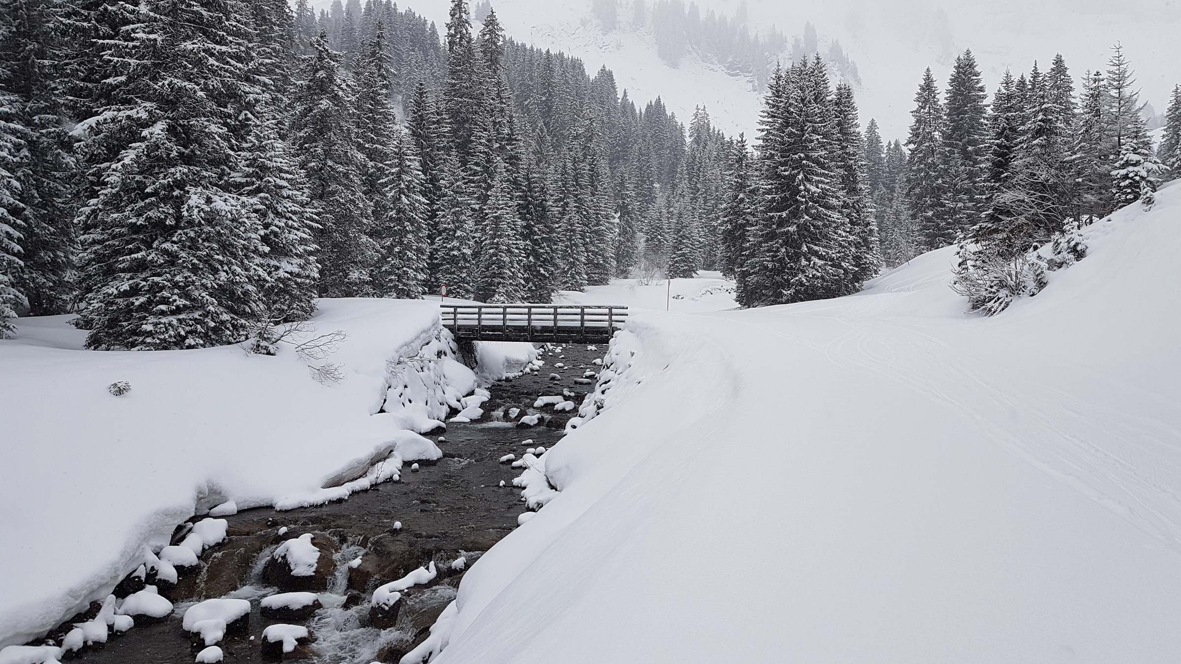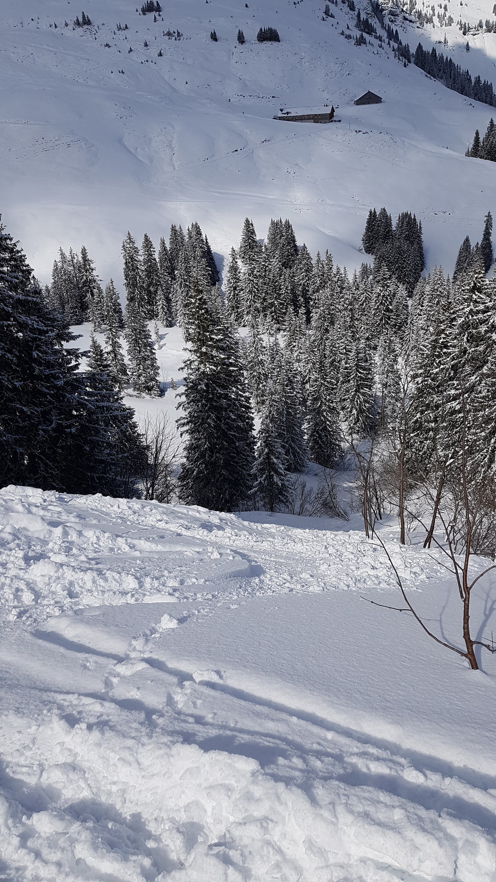 Ganz die Menge von Lech ist in Damüls vermutlich nicht heruntergekommen, wobei es durch die Windverlagerungen schwer zu sagen ist, wie viel wirklich bisher gefallen ist. In unpräparierten, windgeschützten Waldabschnitten sank ich nämlich doch bis zu den Knien ein.