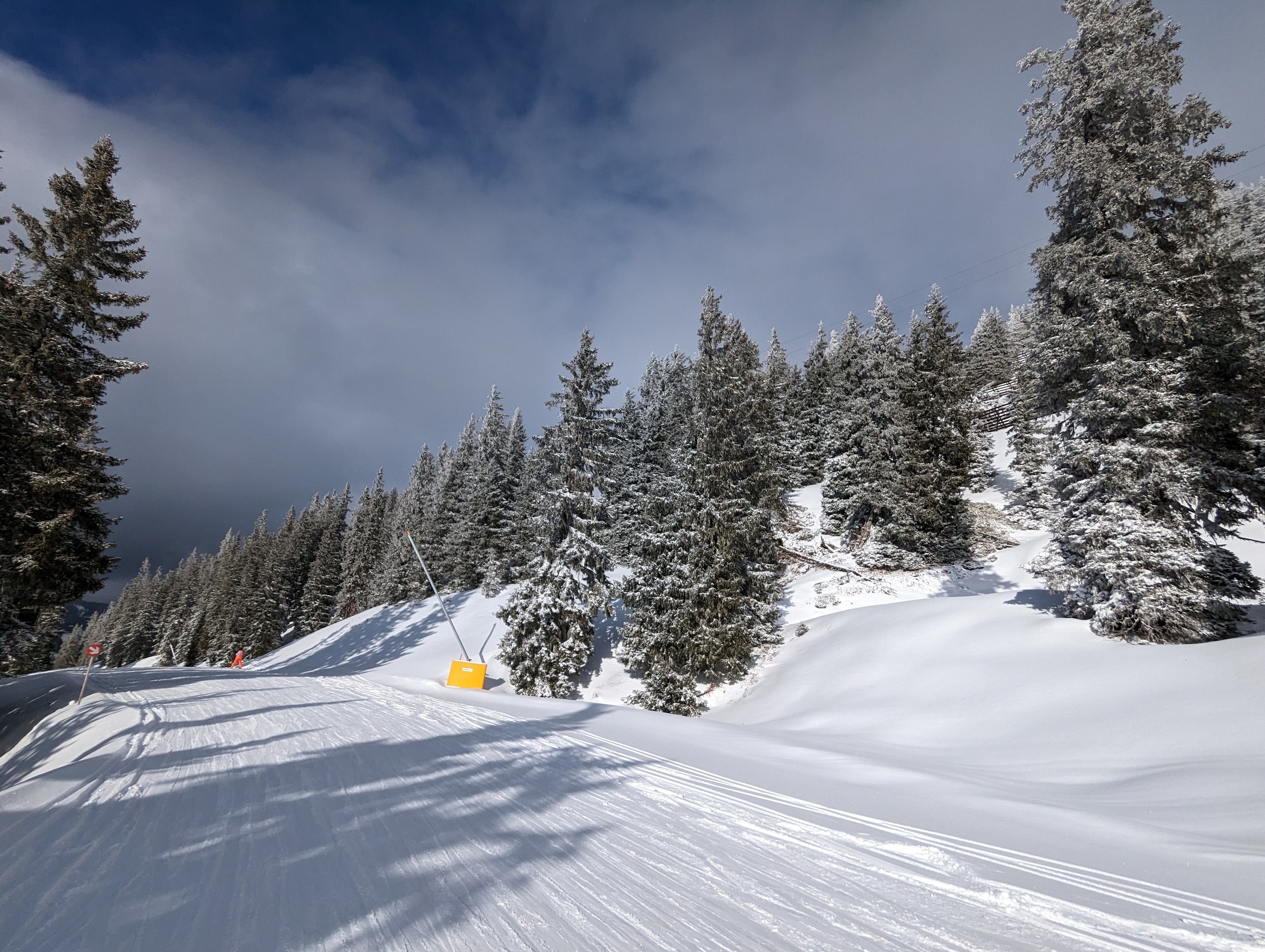 Schneeverhältnisse fast überall ganztags griffig. Tannwaldabfahrt eher auf der eisigeren Seite im unteren Bereich.