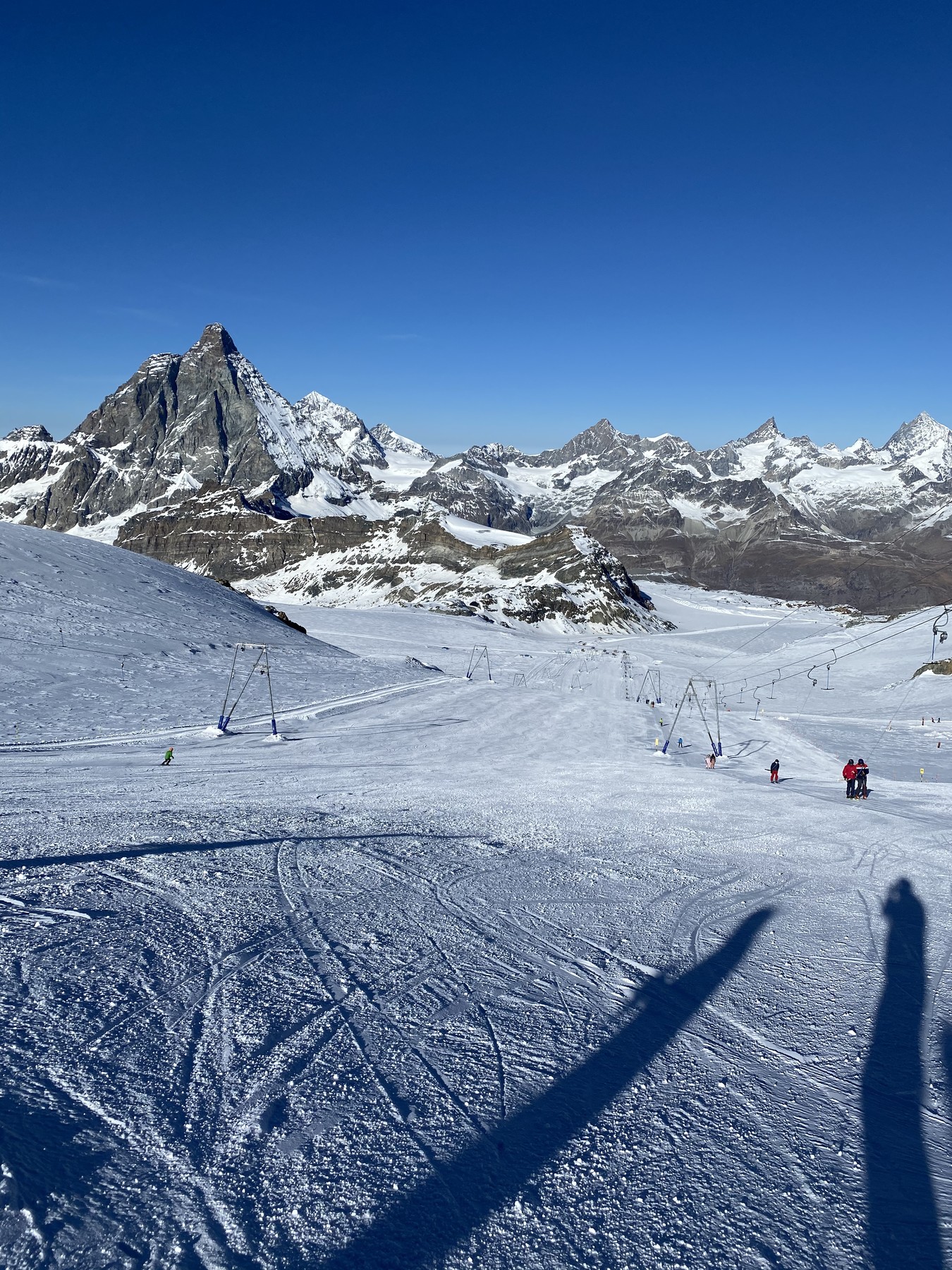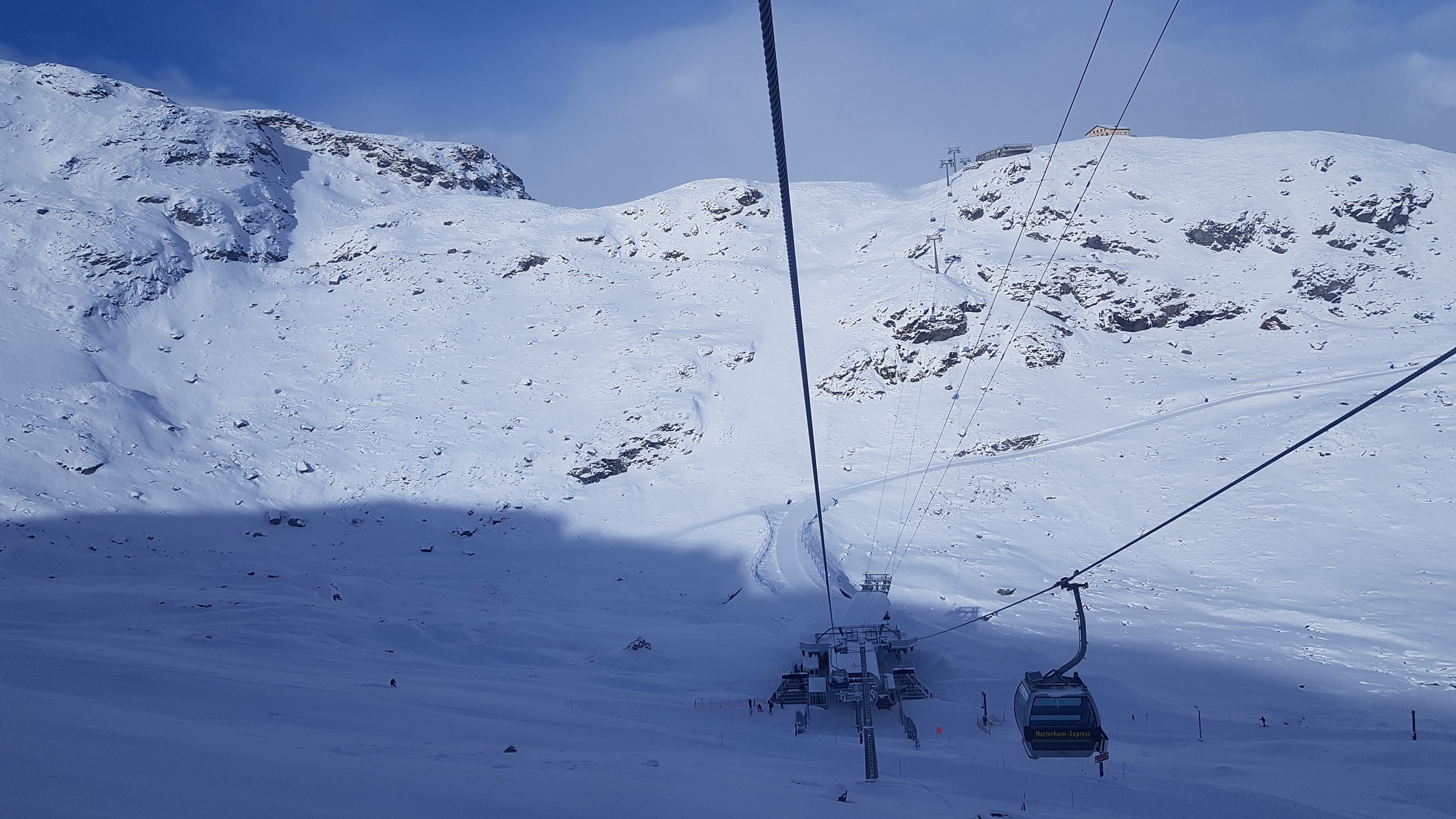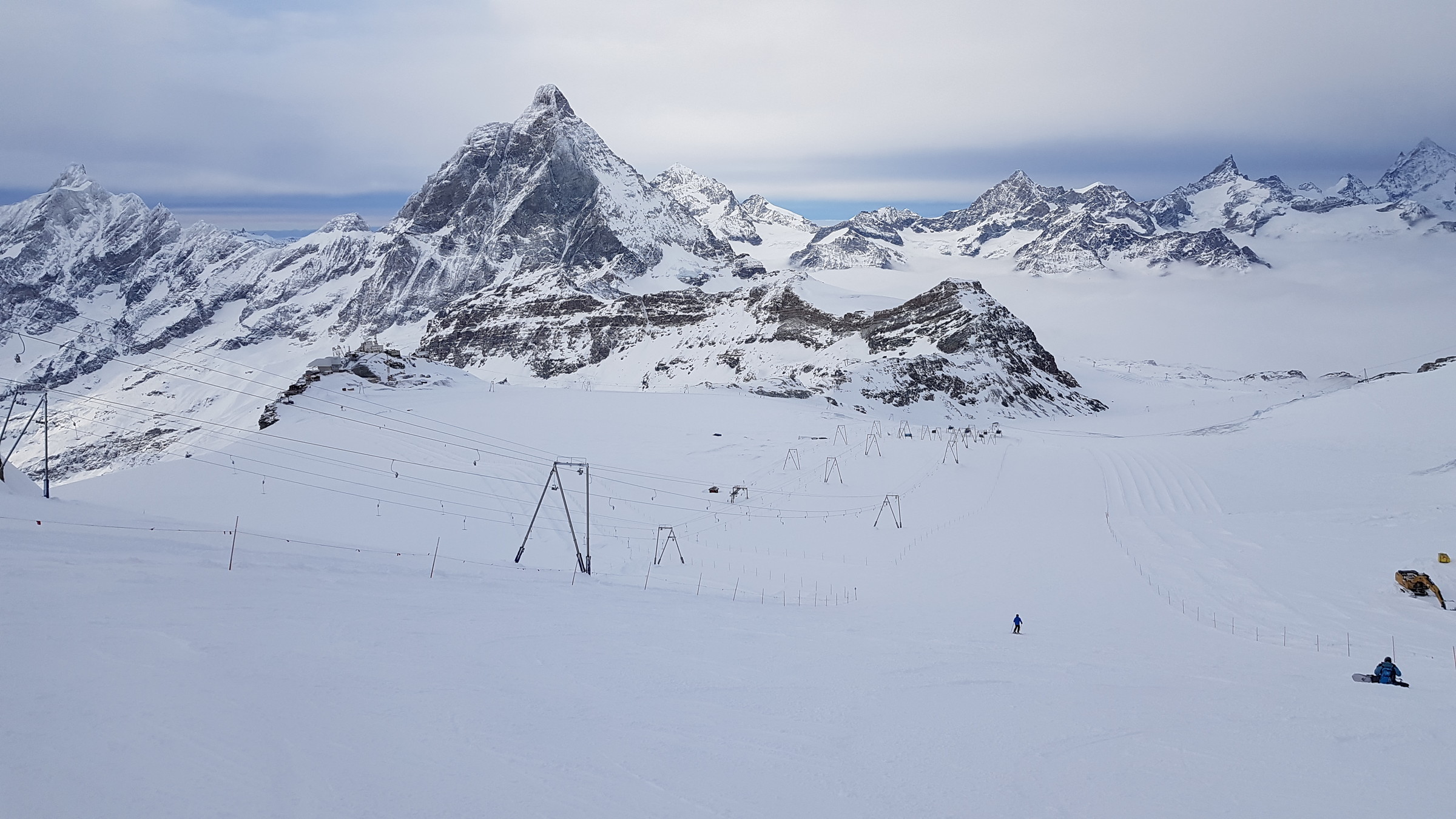 Da die 3S erst so spät aufging, waren die Pisten oben nachmittags super. Dazu gab's eine tolle Lichtstimmung mit Blick ins sonnige Aostatal und zum Mont Blanc. Nachmittags kam auch das Matterhorn zum Vorschein.