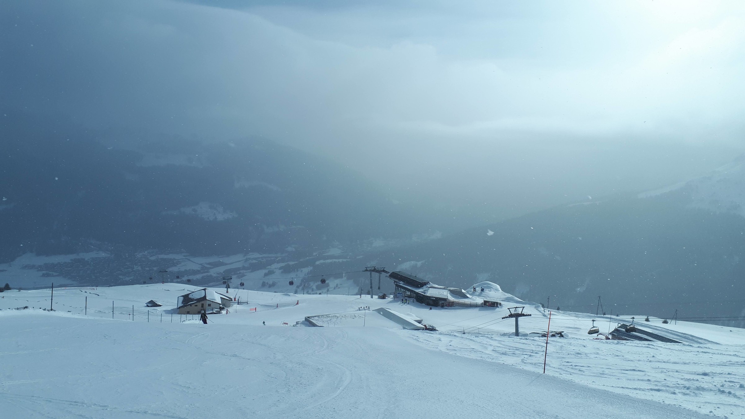 In Radons angekommen hat es komplett zugezogen und die Sicht wurde schlechter. Hier auch gut zusehen, wie der Föhnsturm den Schnee weggeblasen hat: Tgeps - Piz Cartas war den ganzen Tag ja zu, deshalb gings weiter Richtung Naladas. Auch hier haben die Pisten etwas unter dem Wind gelitten, ab und zu braune Stellen.
