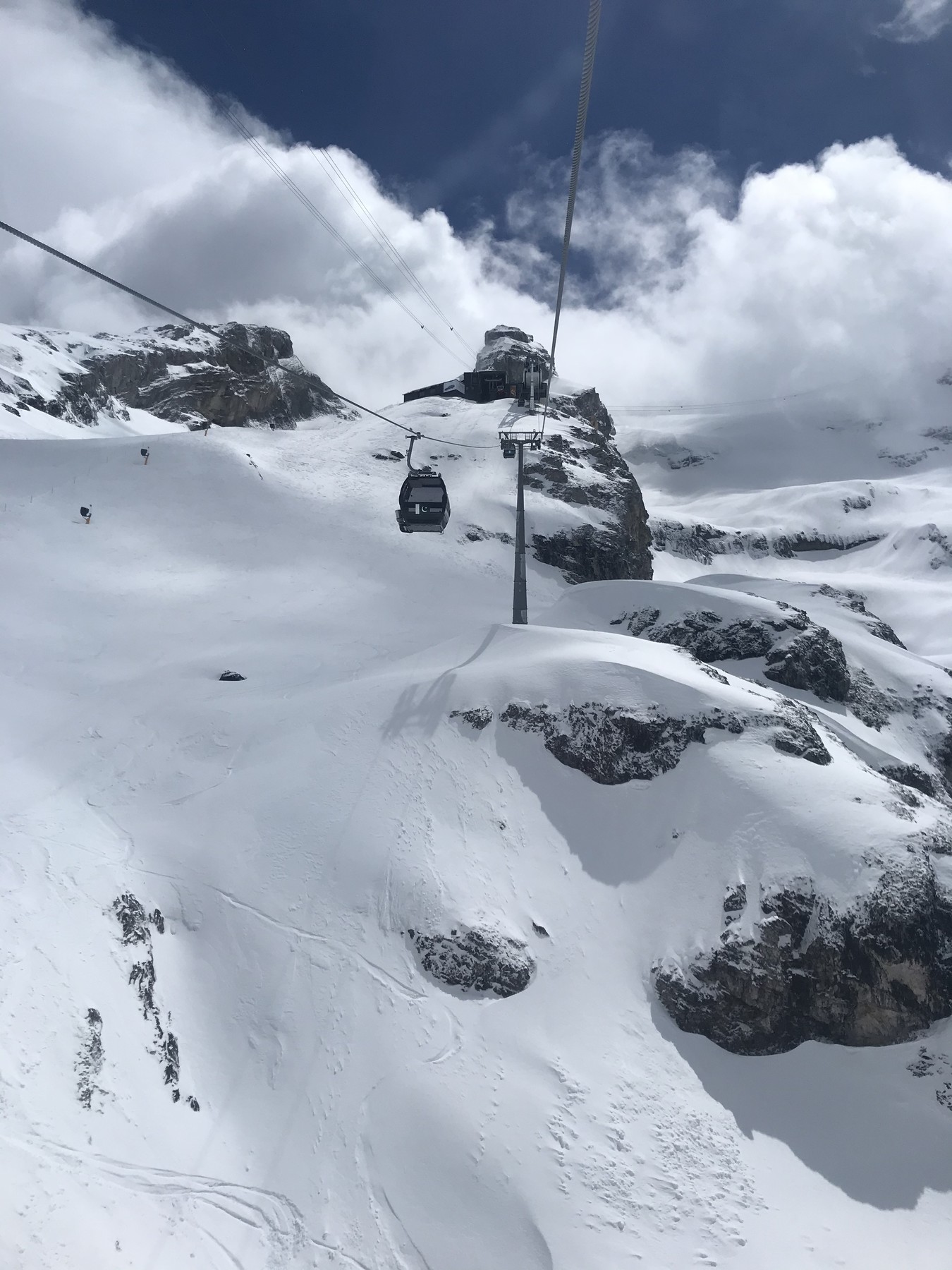 Als ich um 12 Uhr hochfuhr, ging die Rotair grad auf und ich freute mich auf frisch präparierte Pisten: Bis kurz nach der Iceflyer-Talstation war das auch herrlich. Ganz wenig Neuschnee auf der Piste, wunderbar. Doch danach null präpariert: Bei der ersten Rotegg-Abfahrt war das natürlich noch lässig, frischer Powder, noch nicht zu warm. Ab Stand aber echt mies. Da wurde gestern Nachmittag präpariert und danach schneite es drauf. Entsprechend hügelig ist es: Herrliches Zmittag: Am Titlis schleichen noch ein paar Nebelfetzen rum, sonst aber wirkt das Zwischenhoch gut: Doch bei jeder weiteren Fahrt wird der Schnee schwerer: Dieses Bild täuscht: Dies ist eine soeben frisch gemachte Bullyspur entlang dem SL. Also quasi Fake-News. Nun hat es doch noch ganz aufgerissen: Einfach schade, dass die Engelberger so faule Typen sind