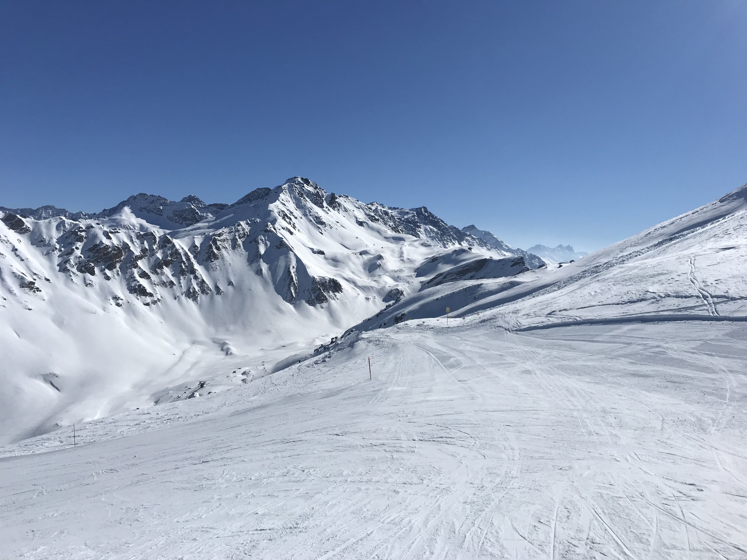 Zuerst fahre ich die schwarze Piste 7, auf der man wunderbar zum Aroser Weisshorn blickt.