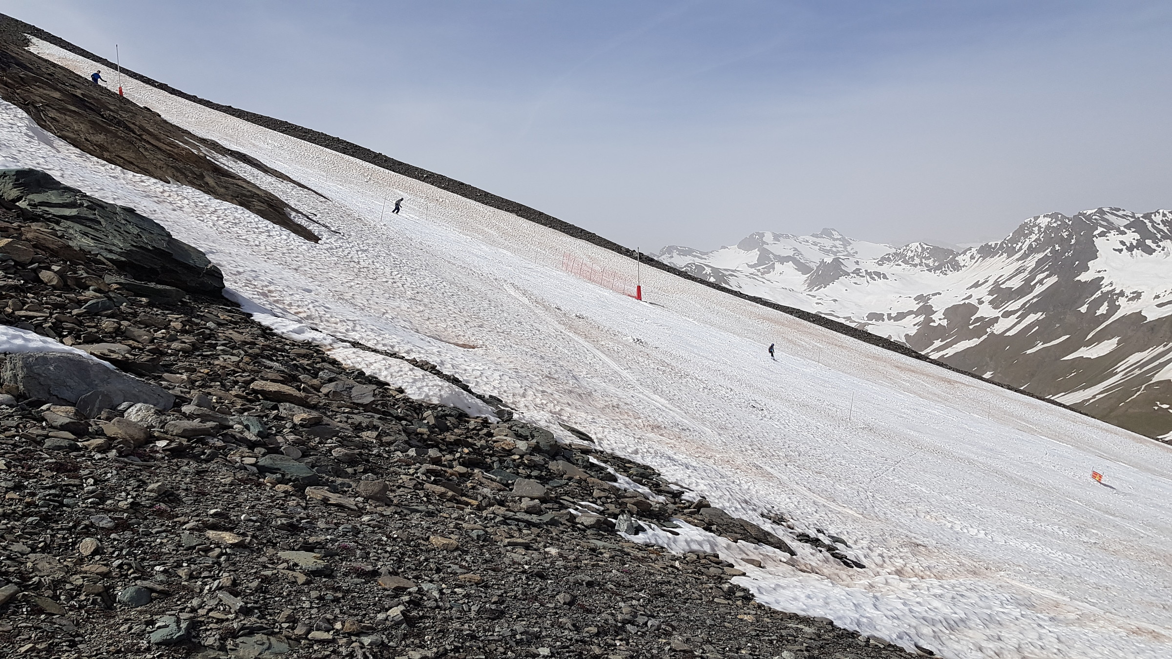 Tignes offnet die piste vom gletscher ins Tal (runter zu Val Claret) dank Snowfarming.