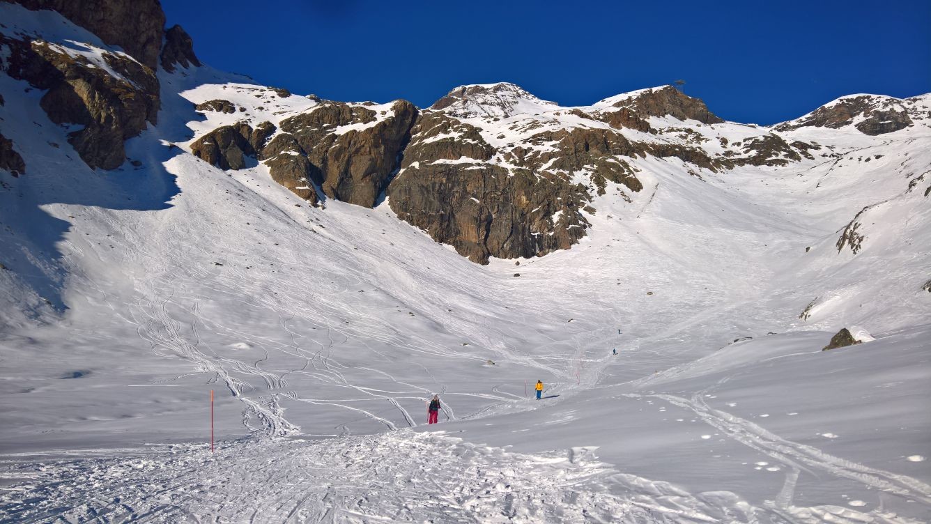 Nachmittags dann 2x von der Punta Indren runter. Hätte nicht gedacht, daß hier schon soviel geht. Für die Jahreszeit geht die Schneelage im oberen Bereich (oberhalb Gabiet) wirklich in Ordnung. Nur die Fortsetzung der Route über den "Canyon" (direkt zur schwarzen Talabfahrt) geht natürlich noch nicht, da muß dann noch ein Meter rein. Ansonsten sehr zufrieden!