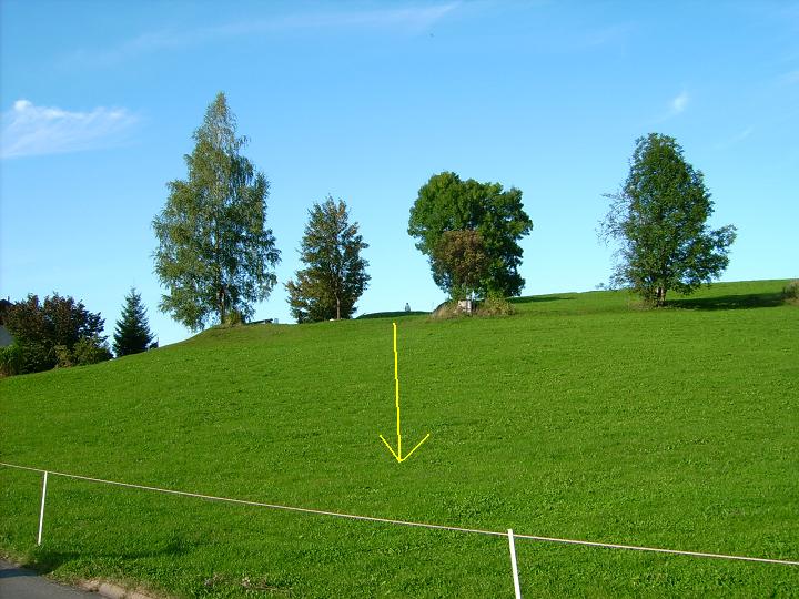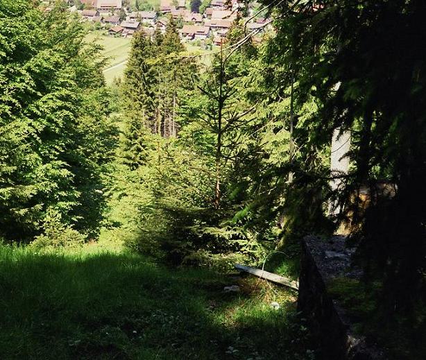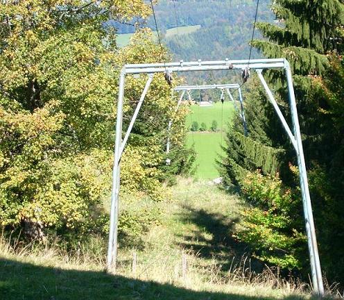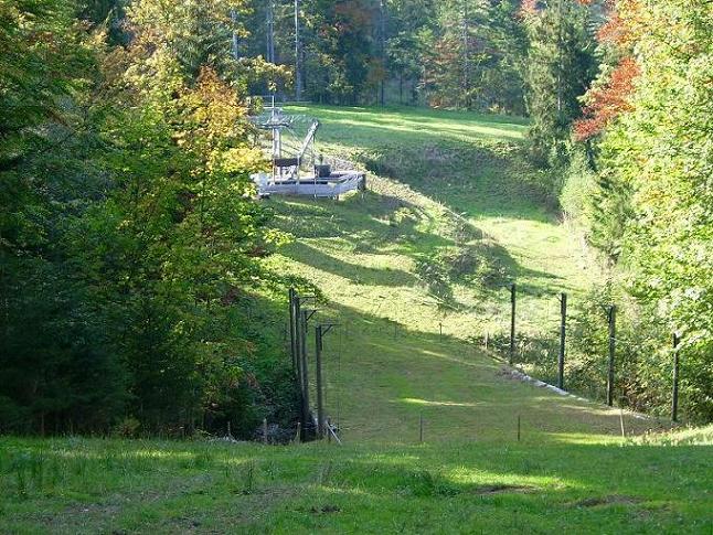 Die Talstation des Klammlifts ist auf meiner Wanderkarte am Berg oben eingezeichnet. Wie man zu dem Lift hinauf kam, sollte sie wirklich dort gewesen sein, ist mir schleierhaft. Vermutlich lag sie doch weiter unten, zumal sich dort noch eine Art Hohlweg befand, durch den die Schlepplifttrasse verlaufen sein konnte. (Der Film meiner analogen Kamera war leider aus.) Zum Lift kommt man, wenn man direkt durch den Ort Thalkirchdorf durchläuft und auf den Berg zusteuert, auf dem sich weiter oberhalb das Naturfreundehaus "Schönblick" befindet. Direkt neben dieser Berghütte lief der Lift auch vorbei.