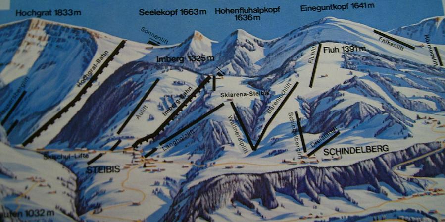 In Steibis stand bis vor kurzem noch die alte ESB Imbergbahn, die vom Ort über den Golfplatz hinweg auf den Imberg hinauf führte. Links davon bediente der Aulift einen interessanten Steilhang. (Lift =LSAP, aber Stützen, Stationen und Seil noch vorhanden) An der Talstation der neuen 8EUB Imbergbahn steht auch noch die des abgebauten Langholzlifts, der eine steile Schneise durch den Wald hinterlassen hat. Vom Walthersalplift gibt es nur noch eine Waldschneise, Fundamente und Stationsreste waren nicht zu sehen. Gar nichts hingegen hat der von mir erst jetzt auf alten Karten entdeckte "Sonnenlift" (namensgleich mit jenem am Hochgrat) am Südhang des Imbergs hinterlassen. Der Lift an der Falkenhütte sowie der an der Hörmoosalpe stehen noch. Aber ich weiß nicht, ob die noch laufen. Ist eh ein Blödsinn gewesen, die zu bauen, finde ich. Man muss erst ewig mit dem Bus über den Imberg drüber, wieder das Tal hinunter und abermals den Berg hinauf, um die beiden ca. 400-500 Meter langen Lifte zu erreichen. (Beides Einzellifte ohne Verbindung.) Erst einmal stelle ich eine alte 70er Panoramakarte rein, auf der alle hier erwähnten Lifte zu erkennen sind. Außerdem noch eine von Oberstaufen, wo der Staufenlift, der Lift bei Buflings und jener in Katzhofen zu sehen sind. Außerdem gibts noch ein Skipanorama der Arena Steibis vor dem Umbau.