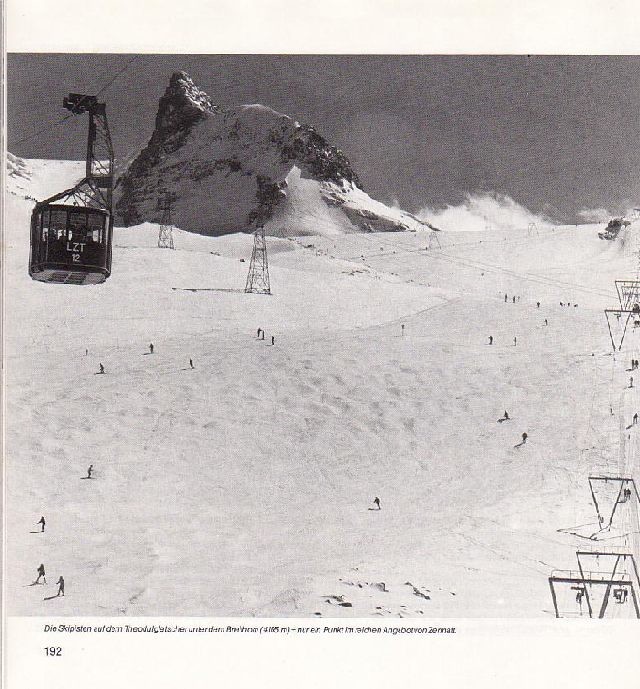 Interessant ist gleich das erste Bild v. Tr. Steg. Bin dort 1986 im März zum ersten Mal gefahren. Da war schon viel weggeschmolzen, der Felsen ( heute Bergstation Gl. Theodul) viel höher.