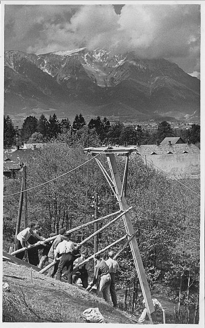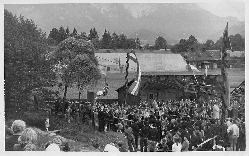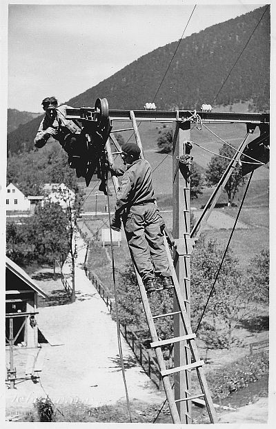 Liebe Kollegen! Ich habe Kontakt zu einem netten Gemeindebeamten in Puchberg geknüpft dessen Opa beim Bau und Betrieb dieser Anlage dabei war. Er hat mir am Dachboden ein Album herausgegraben, husthust ,verstaubt, aber drinnen ein wahrer Schatz. Bau und Betrieb der Anlage , erzeugt von der Wiener Brückenbau und daher ein Abkömmling von Wolf und Switzeny. Die Anlage war von 1949 -1995 in Betrieb . Hier das erste Bild , knapp vor der Eröffnung, alles mit Fahnen geschmückt, der Rest folgt.