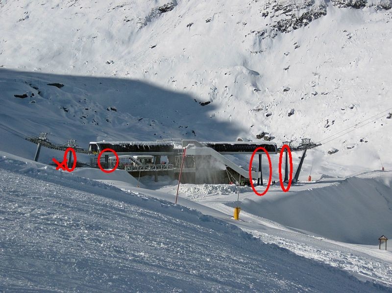 Das kann eigentlich nur bei der Pfeilspitze von ATVs Bild aufgenommen sein: Wo die Seile die Umhausung verlassen und in die Stützenrollen übergehen (sorry für die untechnischen Begriffe - ich bin kein Fachmann, nur Beobachter), ist nur ein kurzer Betonpfeiler. Ebenso beginnt die (kurze) Stütze für die Seilrollen auf Aufnahmeebene. Also muß das die Ausfahrt in Richtung Trockener Steg sein. Bei der Ausfahrt Richtung Schwarzsee ist eine hohe Betostütze bis weit unter das Bahnsteigniveau und die Stützen für die Seilführung gehen ebenfalls weit nach unten. Aufnahmeort und Stützen auf dem Bild von ATV markiert:
