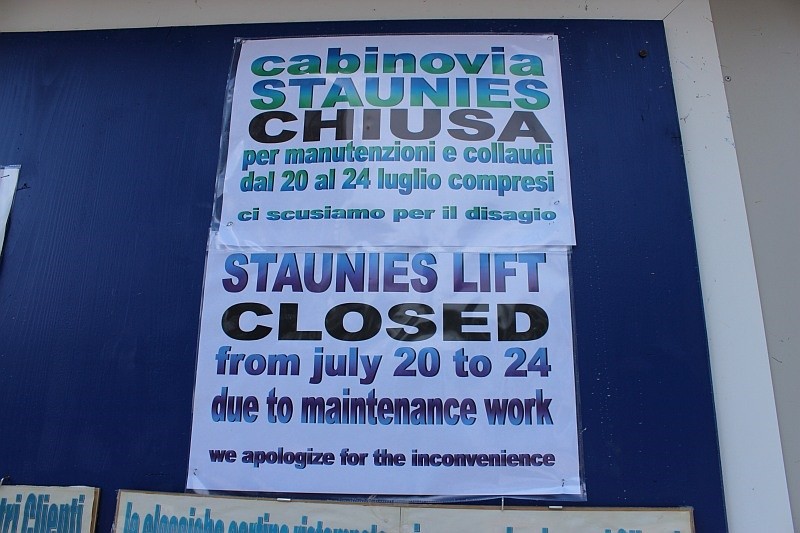 Schon eigenartig, warum man das jetzt macht und nicht vor der Sommersaison, bevor man die Kabinen raufgehängt hat? Oder gibt es doch ein dringenderes Problem z.B. aufgrund von Hitze oder Regen?Comunichiamo che per effettuare lavori urgenti ed il programmato collaudo, la cabinovia VALGRANDE STAUNIES sarà chiusa al pubblico per il periodo da lunedi 20 luglio a venerdi 24 luglio compreso