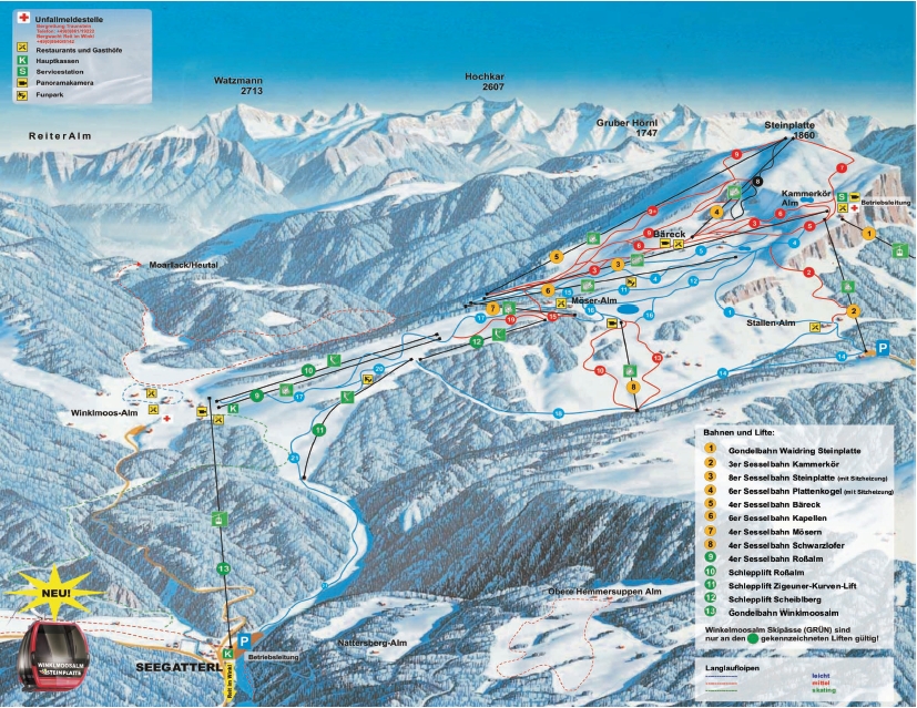 Durchaus interessant ist auch, dass beide Gebiete eigene Pistenpläne haben, die Winklmoosalm hingehen das Gesamtgebiet darstellt (so wie es sich gehört), die Steinplatte die Alm aber beim Scheiblbergschlepper abschneidet. Ebenso findet die Winklmoosalm auf dem Deckblatt des Faltplanes keinerlei Erwähnung, die Winklmoosalm tritt gemeinsam mit der Steinplatte auf dem Deckblatt auf. Das finde ich gegenüber des kleineren Partner mehr als unverschämt. Wenn man geminsam ein Skigebiet anbietet, gehört meines Erachtens auch ein gemeinsames Panorama dazu. Man stelle sich mal vor, in SFL haben die Komperdellbahnen eines und die BB Fiss-Ladis, jedes geht nur bis zur Sattelbahn ... tztztz.
