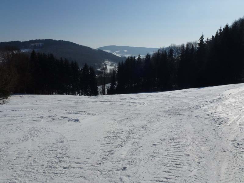 Die Schneelage ist an diesem Tag in der Rhön sehr unterschiedlich und variiert von Berghang zu Berghang. Während sich andere Skigebiete mit 10-20 cm Schnee abmühen, bringt es der Hang am Zuckerfeldlift auf 20-30 cm plus Maschinenschneeunterstützung. Der extrem geschützte Spielberghang bringt es sogar auf 30-40 cm Naturschnee. Damit herrschen gute bis sehr gute Schneeverhältnisse; kleine Einschränkungen gibt es nur an den Waldrandbereichen am Zuckerfeldlift, wo sich teilweise ein wenig Dreck in den weißen Schnee verirrt hat. Temperaturmäßig ist es mit 15 Grad Minus bitter kalt. Am Zuckerfeldlift herrschen wenige Minuten Wartezeit, die sich ab der Mittagszeit auf gut 5 Minuten ausdehnen. Am Spielberglift ist kaum Betireb, die meisten Bügel gehen leer durch und man hat die Pisten für sich alleine. Am gesamten Spielberghang sind nicht mehr als 10 Skifahrer gleichzeitig unterwegs. Gut besucht sind die Hütten, wo sich frierende Skifahrer aufwärmen. Am Spielberglift finden wir dann auch ideale Bedingungen für ein wenig Stangentraining, um uns für das Rennen am Folgetag am Heidelstein fit zu machen.