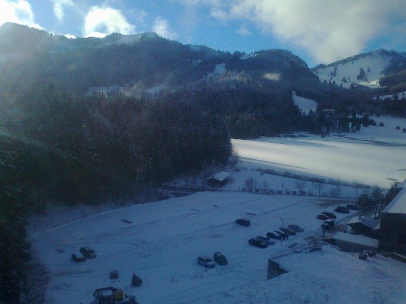 Entlang der Forststraße konnte man zunächst recht gut abfahren, da die Fußgänger und wenigen Autos den Schnee prima festgepresst hatten und somit nur selten der Split durchkam. Ab dem geteerten Bereich ging es dann nur noch am Rand. Als dann häufigeres Abschnallen sich nicht mehr vermeiden ließ, habe ich die Ski die letzten 15min lieber getragen, bis ich wieder im Hauptort ankam.