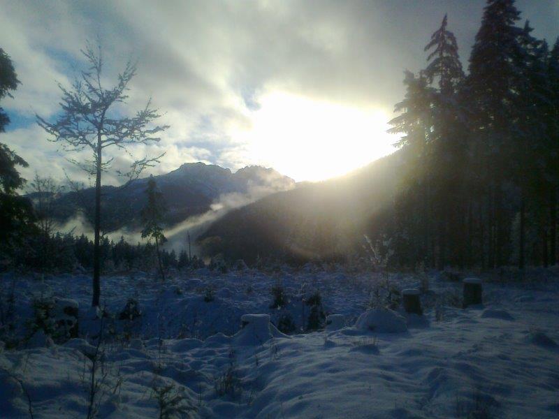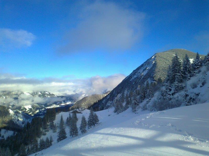 Bei der Bergfahrt konnte man schon leicht erahnen, dass die Schneehöhe grenzwertig gering sein dürfte. So verwarf ich meinen ursprünglichen Plan, den Lochgraben oder nach kurzem Aufstieg den Rauhkopf zu befahren und peilte lieber die Wiesen an der Maxlraineralm an. Nachdem sich nun auch die Sonne vollständig durchsetzte, stellte sich dies auch als landschaftlich deutlich schönere Variante heraus, auch wenn sie natürlich mit einem Fußmarsch entlang der Forststraße zurück zum Hauptort verbunden war.