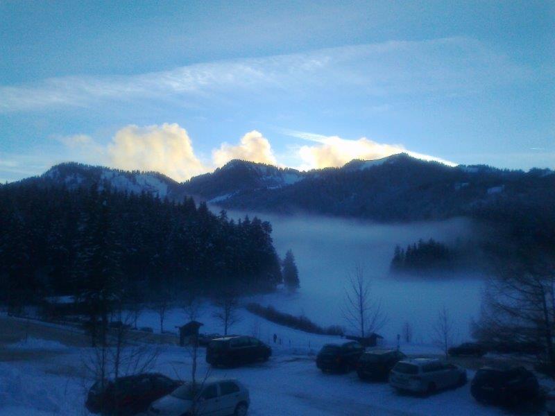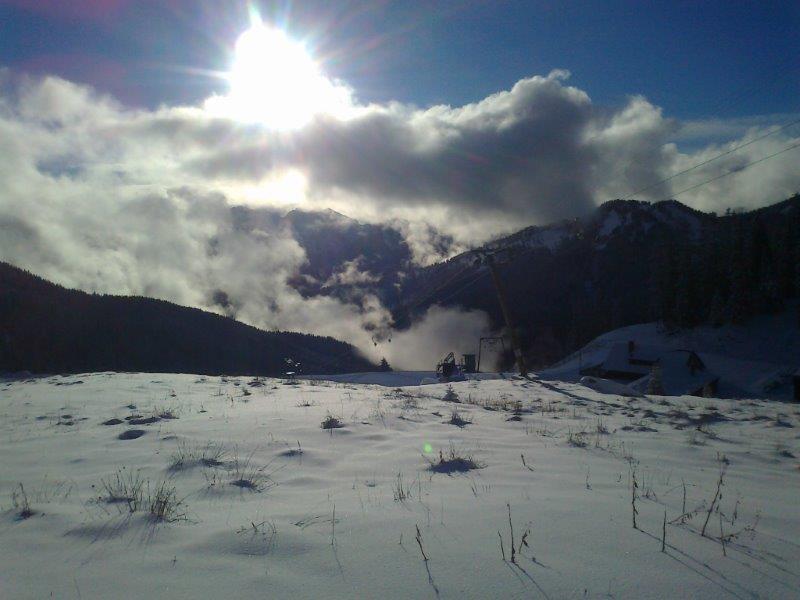 Die Liftbediensteten ließen mich ohne großes Verhandeln, wohl aber mit den dringenden Hinweisen, dass alles auf eigene Gefahr geschehe, nichts präpariert sei und dies generell schon eine recht merkwürdige Aktion sei, eine Einzelfahrt kaufen und mit Ski in die Bahn steigen. Offenbar war ich tatsächlich der Einzige, der heute eine Skiunternehmung starten wollte. Es waren trotz des Neuschnees etliche Wanderer und Kaffeefahrer unterwegs (Cafe an der Bergstation war geöffnet); Ski- oder Tourenspuren waren nicht zu sehen.