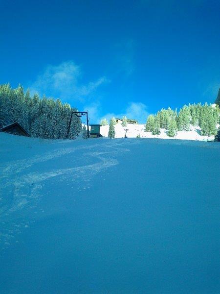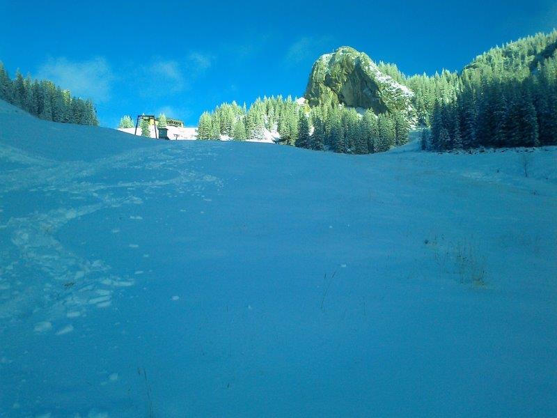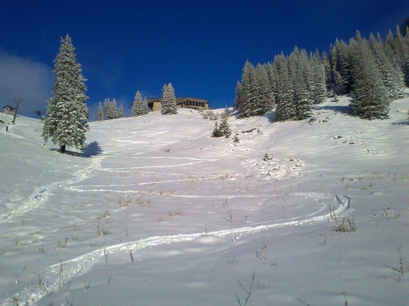 Die Verhältnisse waren am Einstieg zum Taubensteinhang mit Vorsicht zu geniesen. Zwischen den Wiesenterassen ließ sich hin und wieder Steinkontakt nicht vermeiden, was aber mein Equipment schon "gewohnt" war. Ab der unteren Hälfte des Taubensteinhanges und entlang des alten Maxlrainer-SL konnte man dann tatsächlich recht unbeschwingt powdern. Tortz der Sonneneinstrahlung und leichter Anfeuchtung war der Schnee noch nicht "pappert".