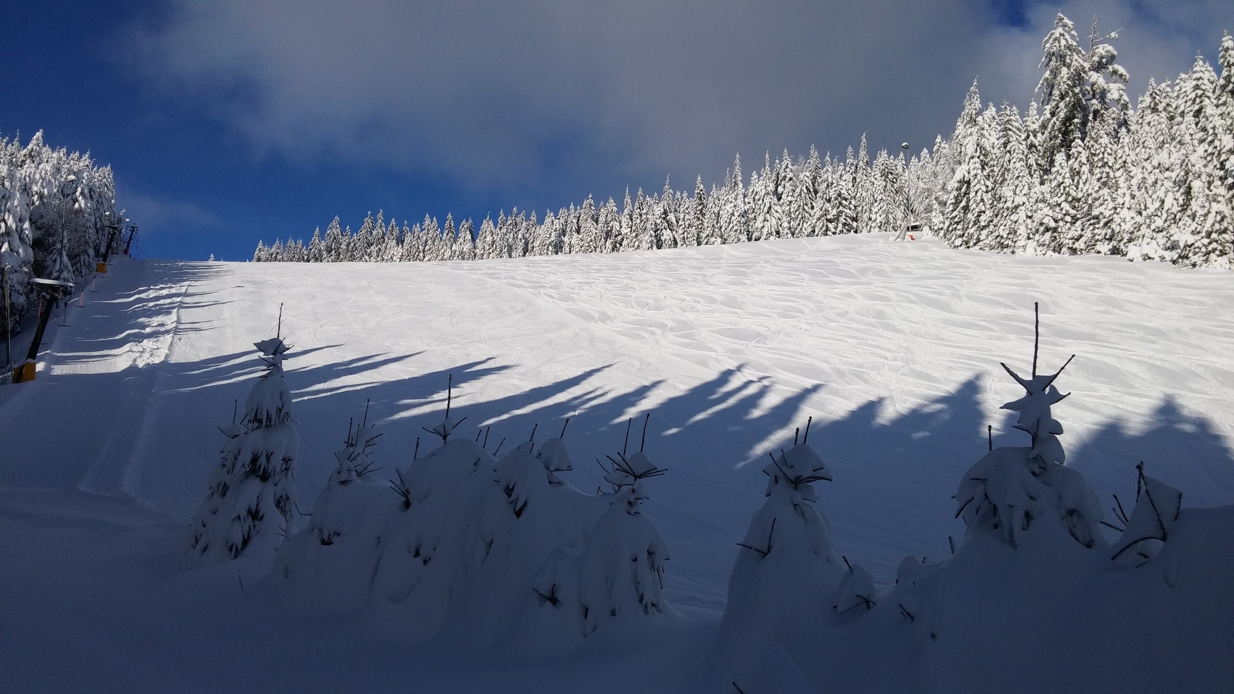 Der schönste Hang, in ebenfalls ziemlich gutem Zustand, mit Abstand am meisten Schnee und gerade mal vier Skifahrer, dazu hatte man nur die linke Hälfte des Hangs gewalzt.