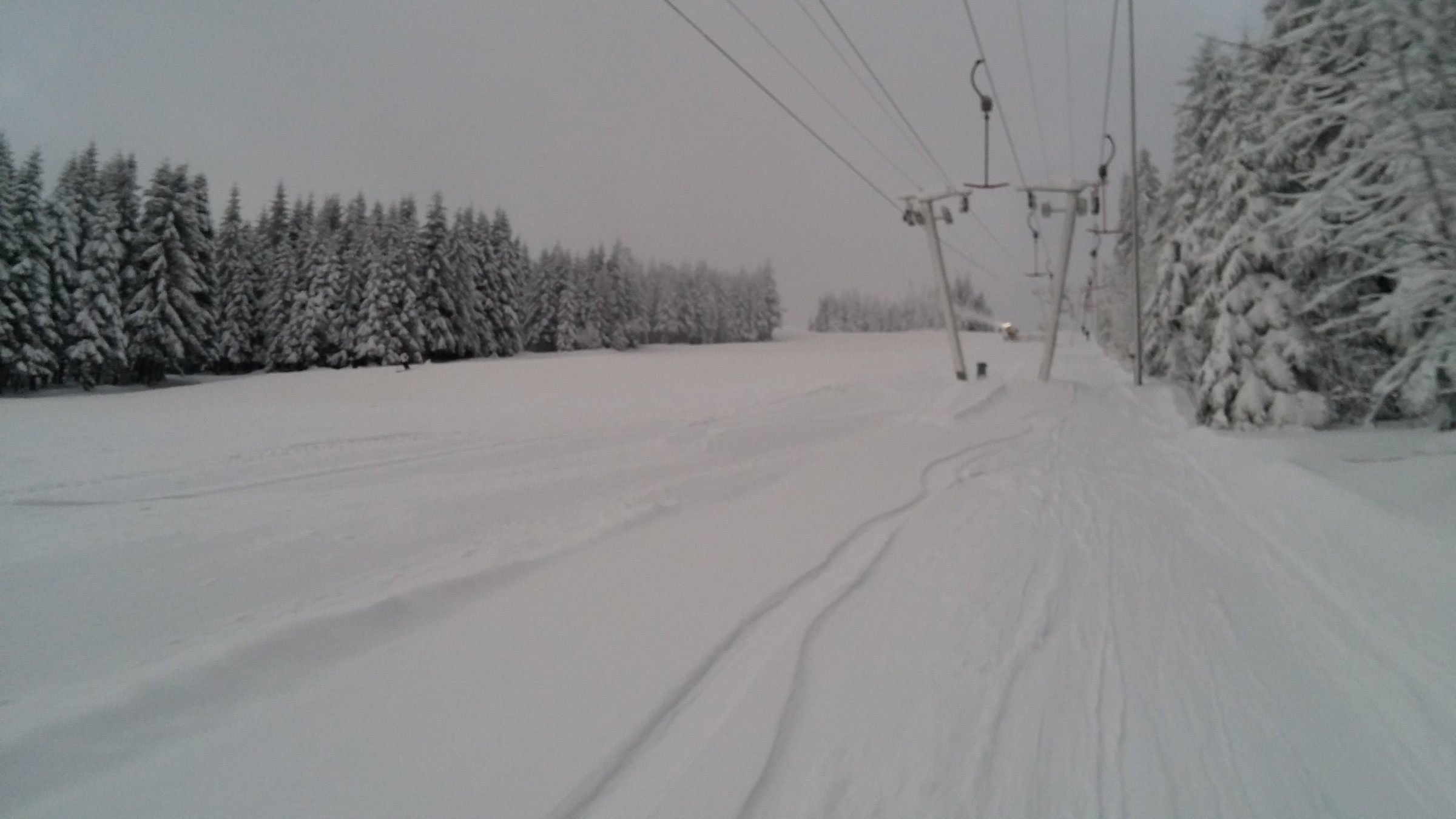 Bereits um 12 ging es daher zum Ruhestein. Es lief der westliche Lift. Hier war noch weniger los (höchstens zehn Skifahrer). Aufgrund der "sonnigeren" Hangausrichtung war der Schnee etwas fester und weniger stumpf, der Hang auf voller Breite perfekt gewalzt. Insgesamt fand man hier die besten Pistenbedingungen vor, die Abfahrt ist dafür aber auch flacher. :)