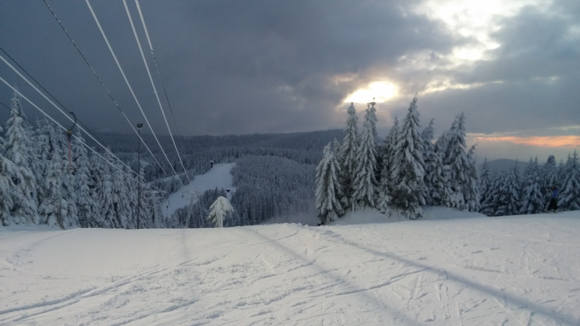 Mein nächstes Ziel war der Mehliskopf. Wider Erwartungen lief auch der Hundsecklift (auf der Website stand ja nichts) und dank Verbindungsweg konnte ich mir die Autofahrt auf die andere Seite sparen. Auch hier wurde beschneit. Los war auch hier so gut wie nichts, obwohl die Pistenverhältnisse trotz Beschneiung ziemlich gut waren. Mit dem Sonnenuntergang zog sich der Himmel langsam zu.