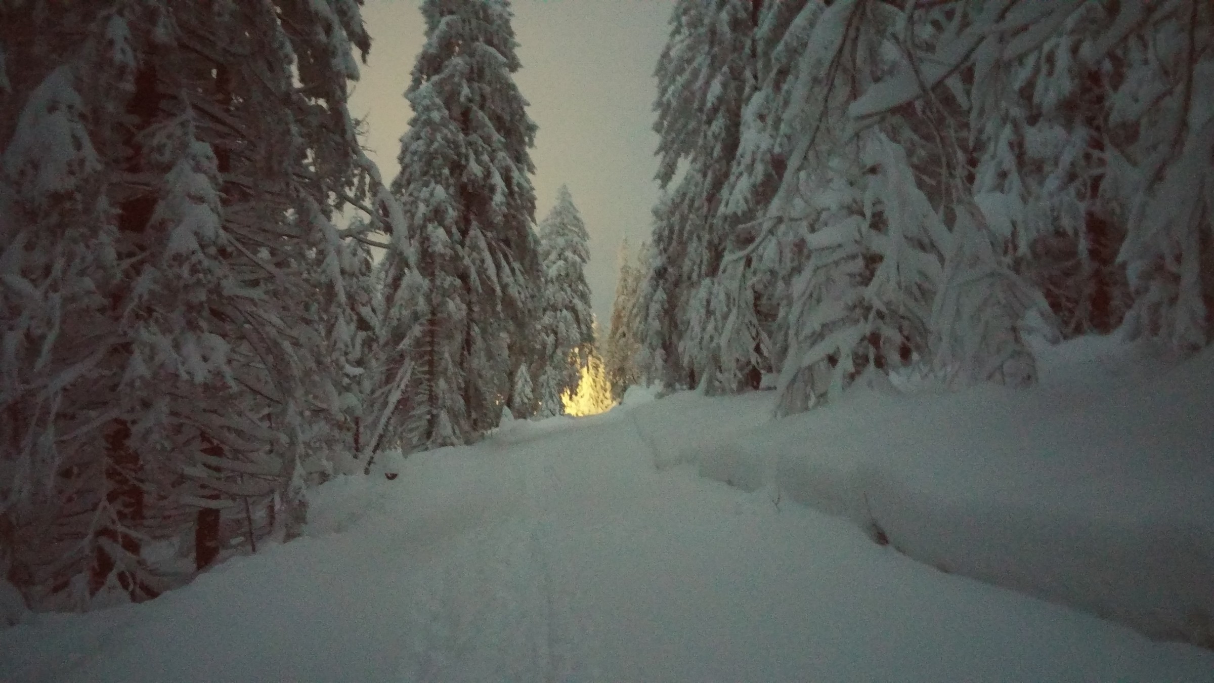 Zweites Ziel des Abends war der Skihang Seibelseckle. Hier war mehr Betrieb als am Ruhestein, und der Schnee war stärker zerfahren, was aber sicherlich auch der steileren Hangneigung geschuldet ist. Beschneit wurde am Seibelseckle noch nicht. Auch hier das schönste Winterwonderland mit kräftig verschneiten Fichten - für November durchaus toll.
