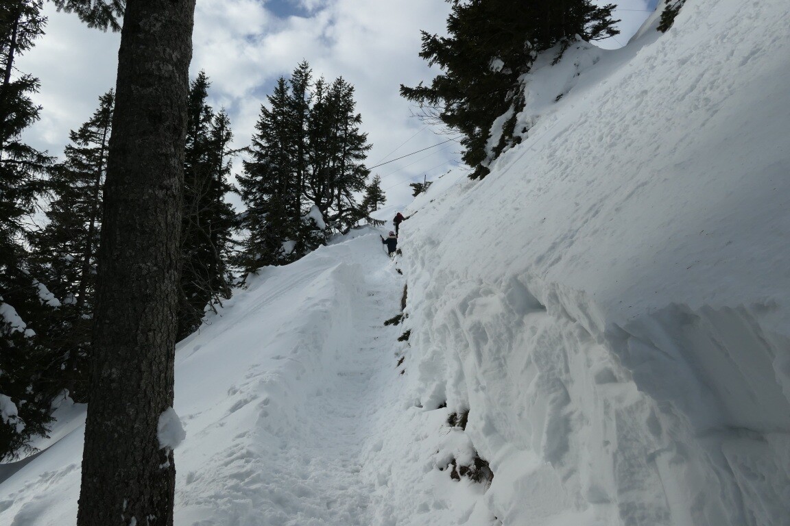 Dazu muss ich einwerfen: bei meinem Besuch nahm ein Vater mit seinem noch recht kleinen Kind von der Bergstation der PB aus nicht den Fußweg nach oben, sondern schnallte an und fuhr auf dem Wanderweg entlang. Das hab ich dann auch einfach probiert und es ging überraschend gut, anstrengende Schiebestücke waren nicht wirklich dabei. Allerdings ist der Weg an manchen Stellen sehr schmal und oft von Fußgängern frequentiert, denen man dann ausweichen muss. Und ich weiß nicht, ob dieser Weg manchmal gestreut wird, bei meinem Besuch war das Skifahren aber kein Problem. Offiziell vorgesehen ist das aber natürlich nicht.