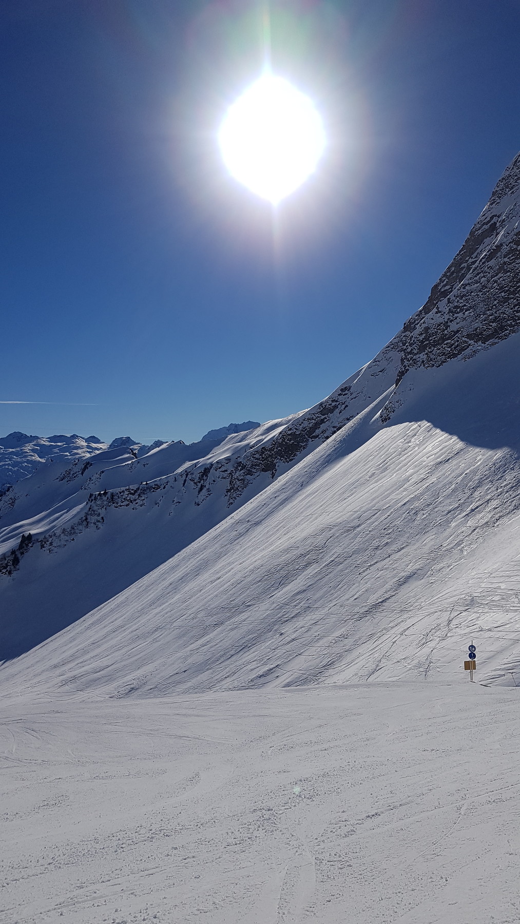 Noch vor dem Mittag bin ich nach Sonntag gewechselt. Dort waren die Pisten zu Beginn noch sehr hart und teils auch etwas glatt, wurde erst im Laufe des Nachmittags weicher und besser. Ziemlich genau vor einem Jahr war ich ebenfalls hier: viewtopic.php?f=46&t=63416 Damals war die Schneelage etwas geringer (die Südhänge gegenüber sogar schon bis relativ weit oben schneefrei), dafür ging es im Gelände erheblich besser und machte viel Spaß. Heute war es dort meist unfahrbar, da man 5-10 cm einsank, aber es gleichzeitig noch eine relativ harte Harschschicht gab. Die (geschlossene) Skiroute habe ich nur einmal welche fahren gesehen, sah nicht angenehm aus. Letztes Jahr fuhr ich hingegen fast nur dort. Wenn der Schnee in den nächsten Tagen besser werden sollte, komme ich vielleicht nochmal für ein paar Stunden wieder.