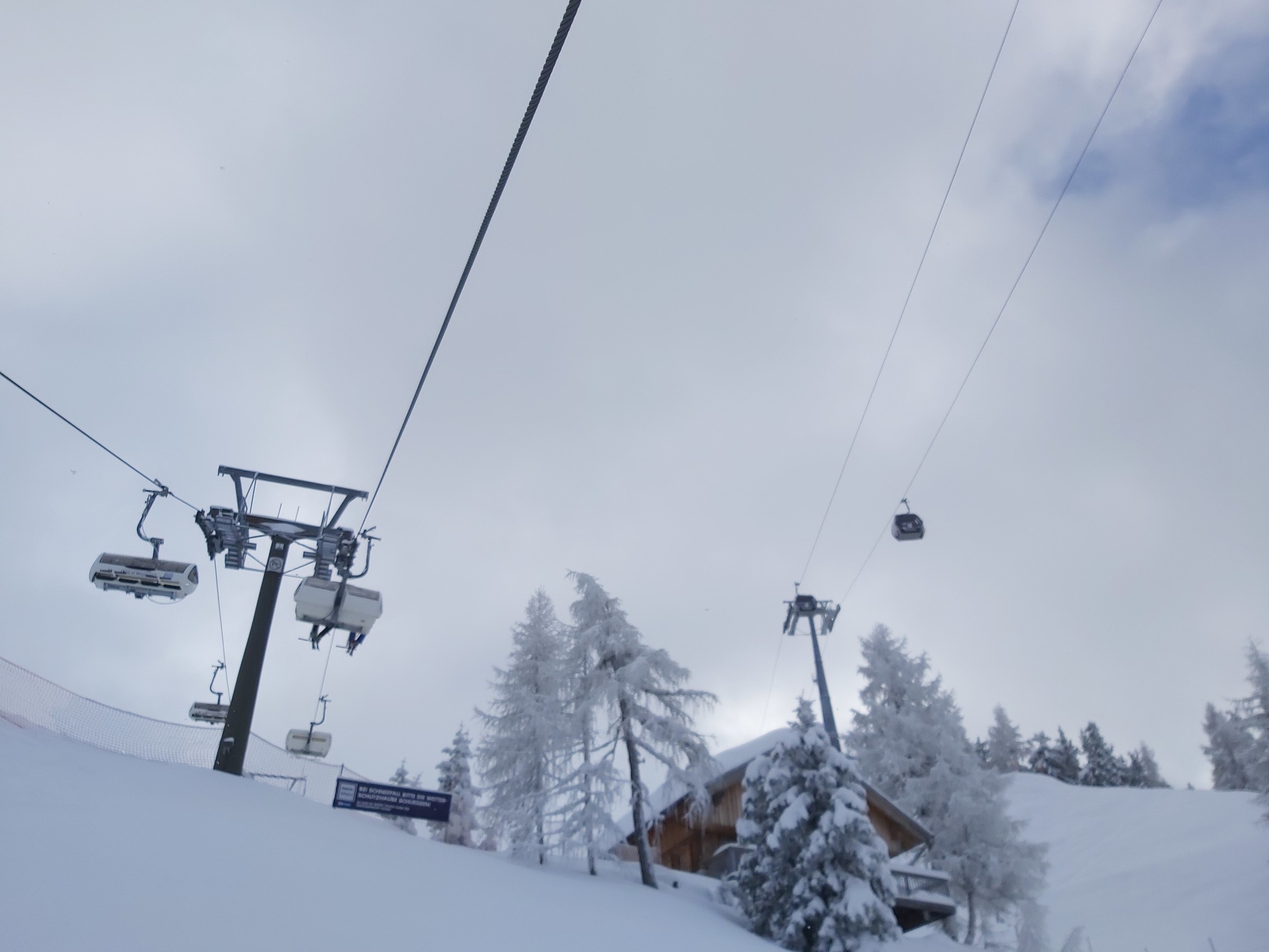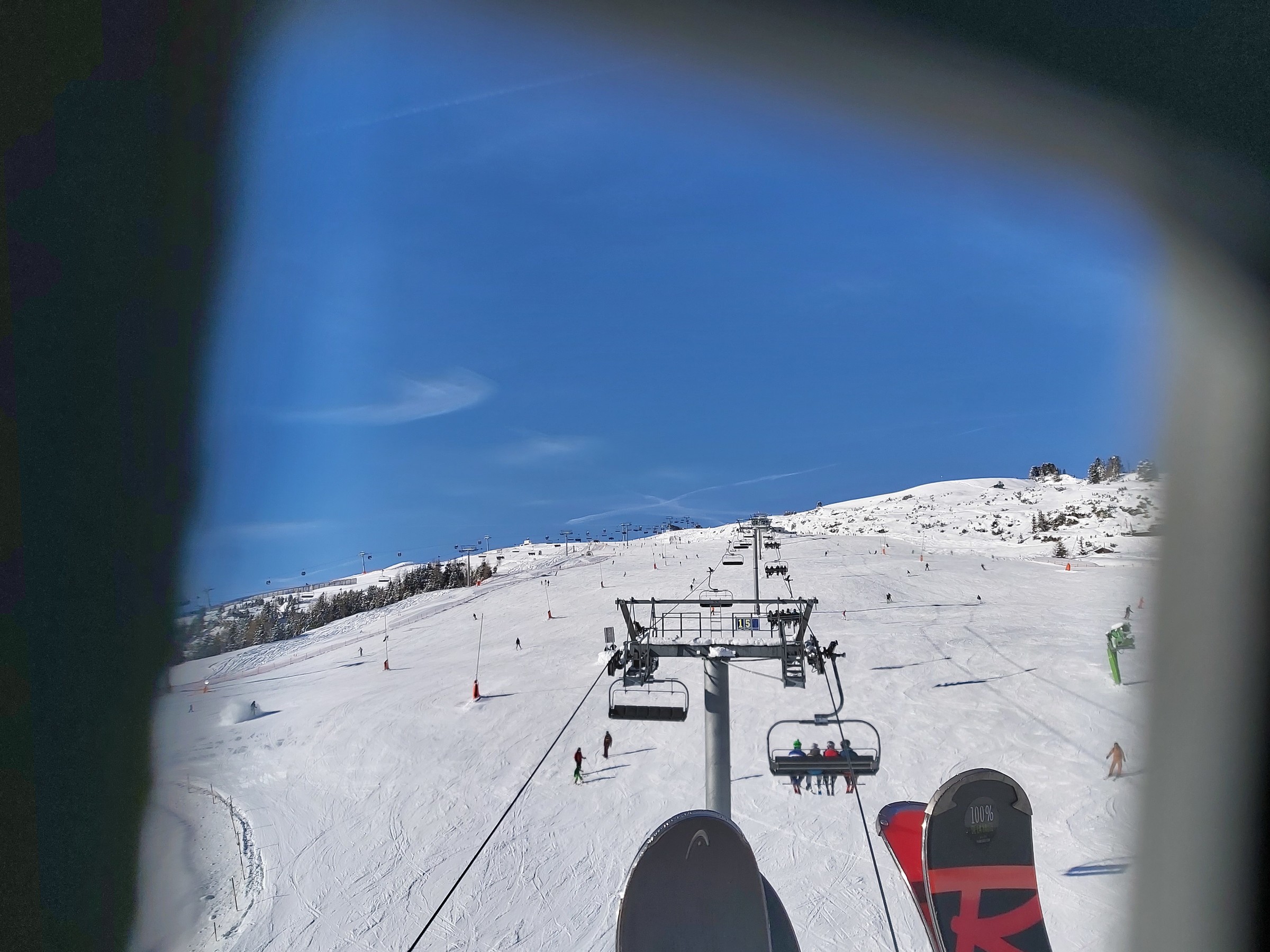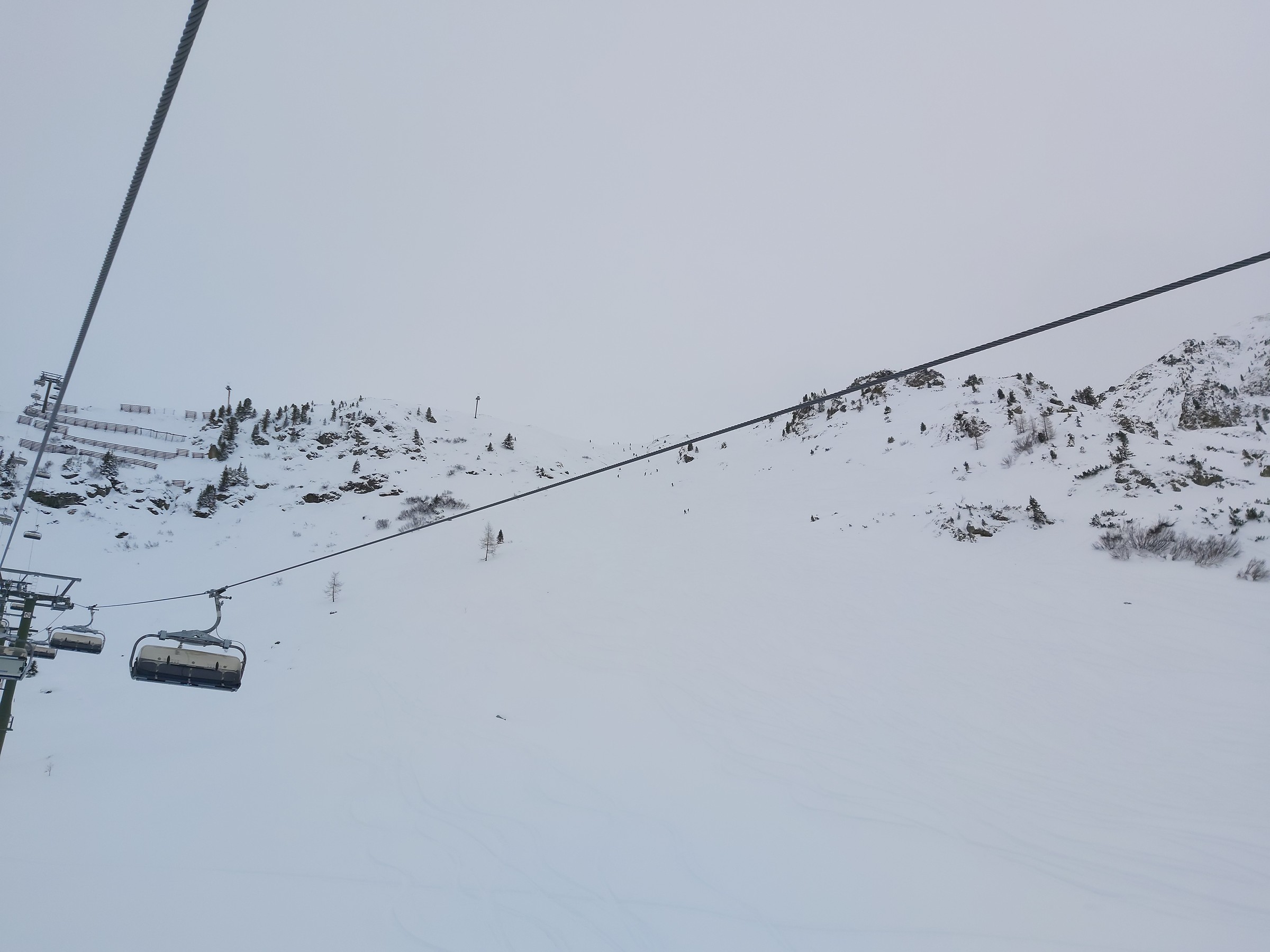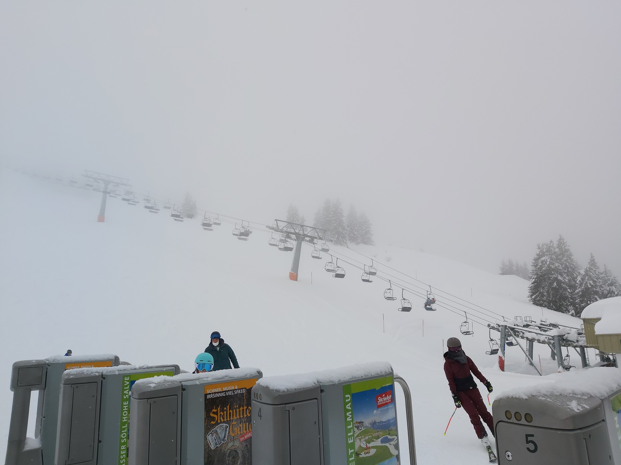 Durch einem Defekt am Lärchkogellift geht es doch noch an der Lawinensteinbahn nach oben. So wie der Bubble sieht die Skibrille auch aus. Man sieht fast nix...