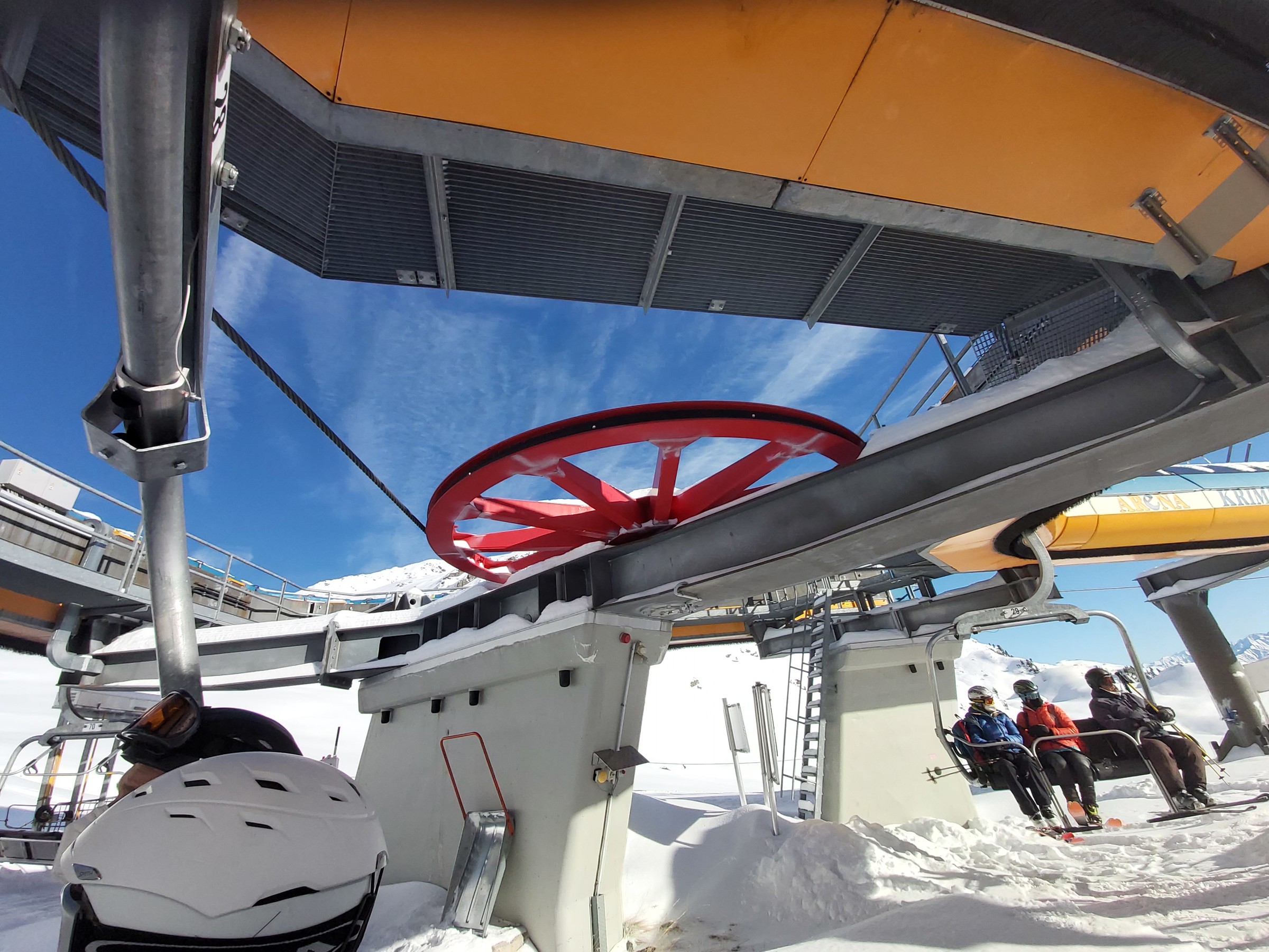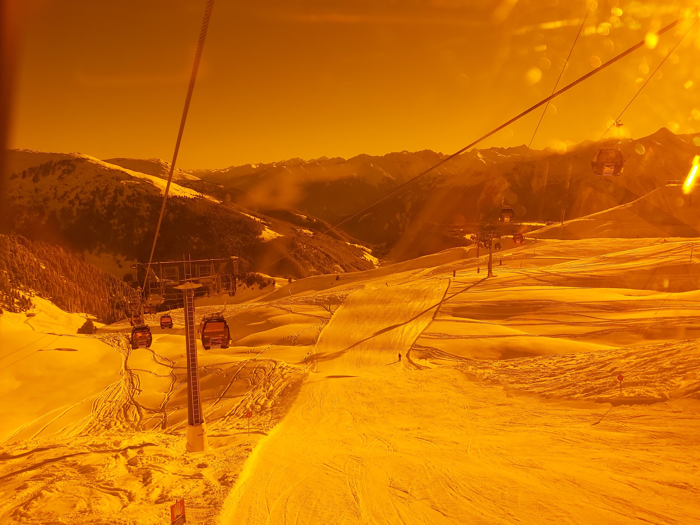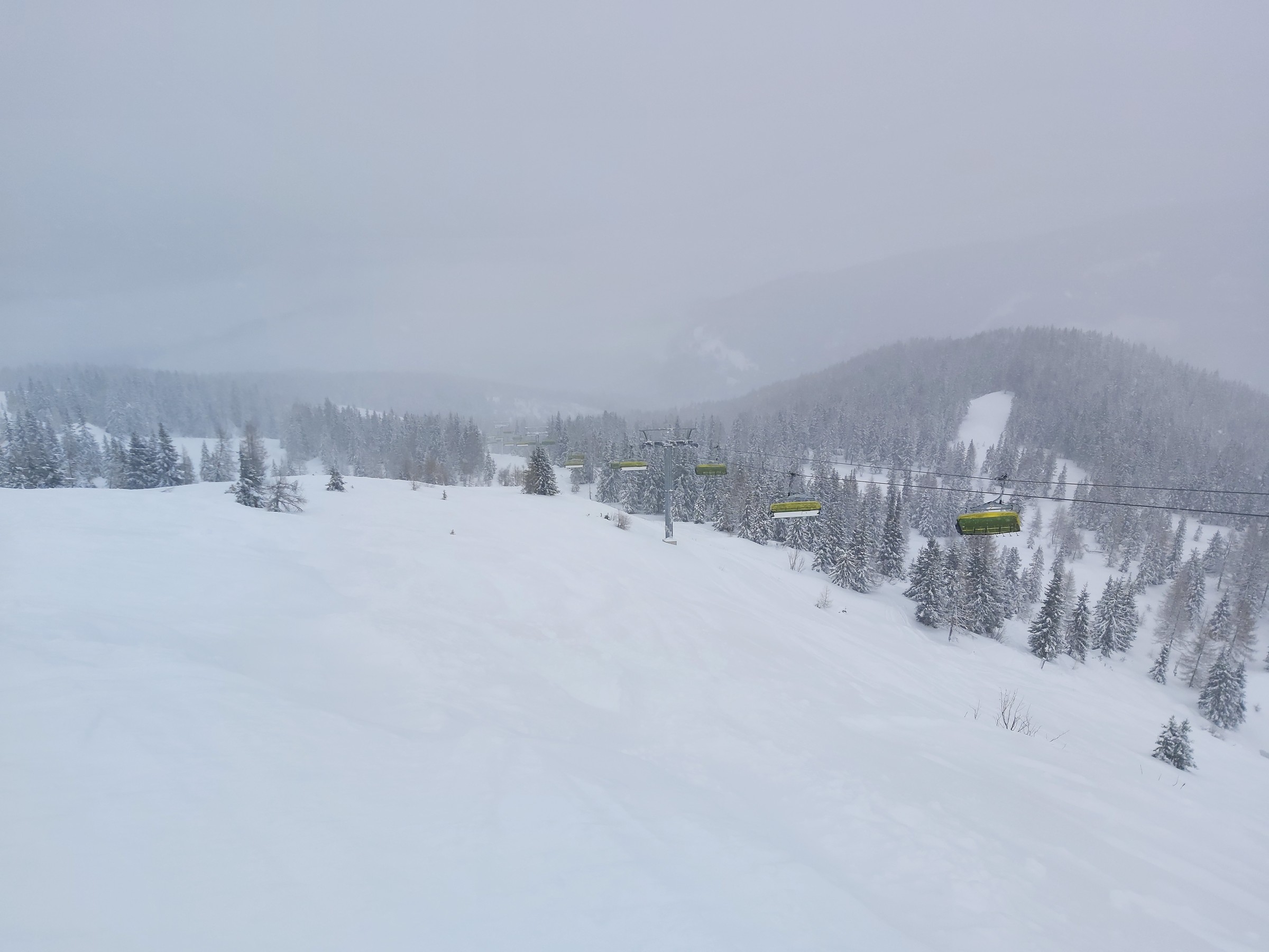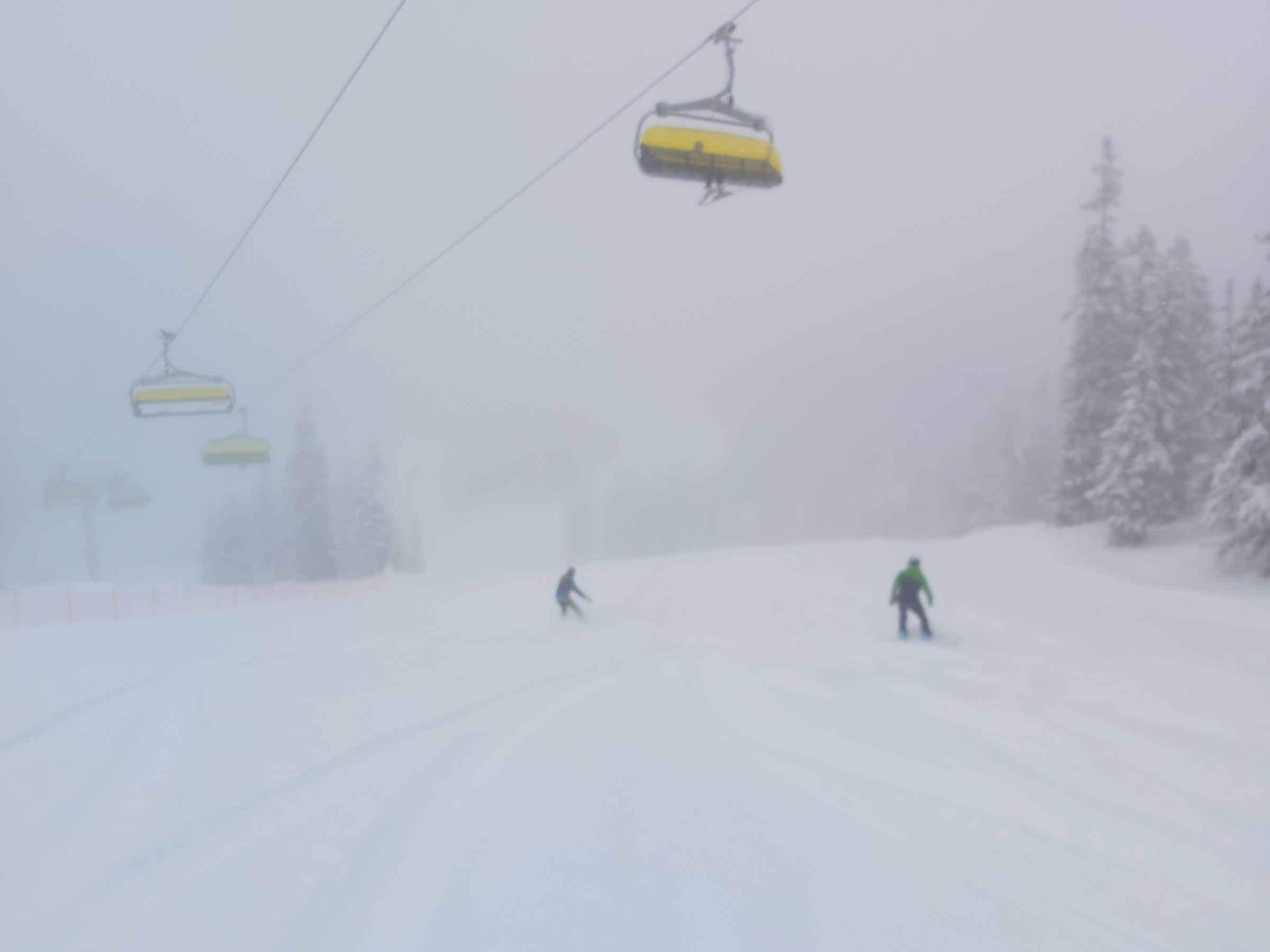 Durch einem Defekt am Lärchkogellift geht es doch noch an der Lawinensteinbahn nach oben. So wie der Bubble sieht die Skibrille auch aus. Man sieht fast nix...