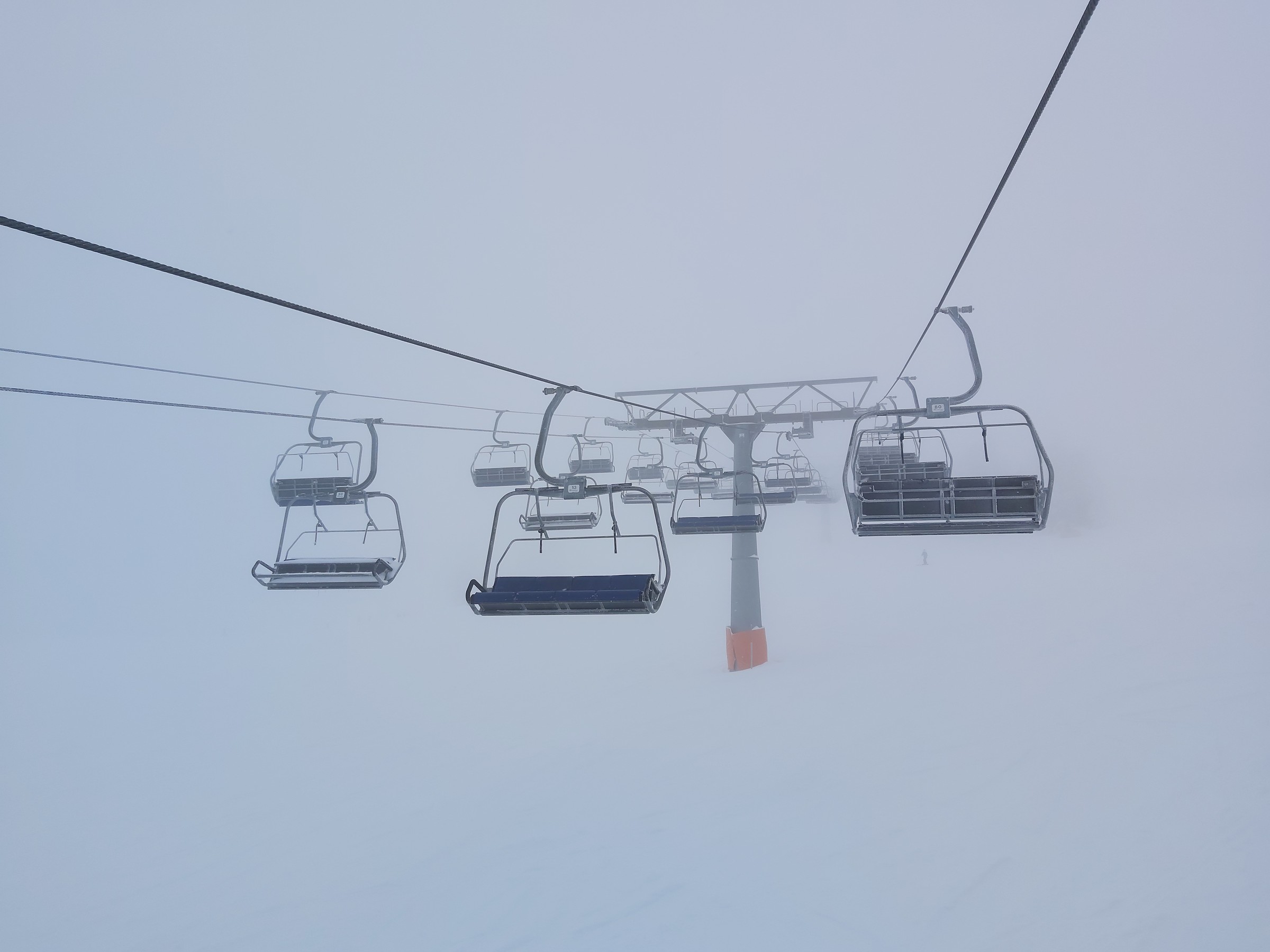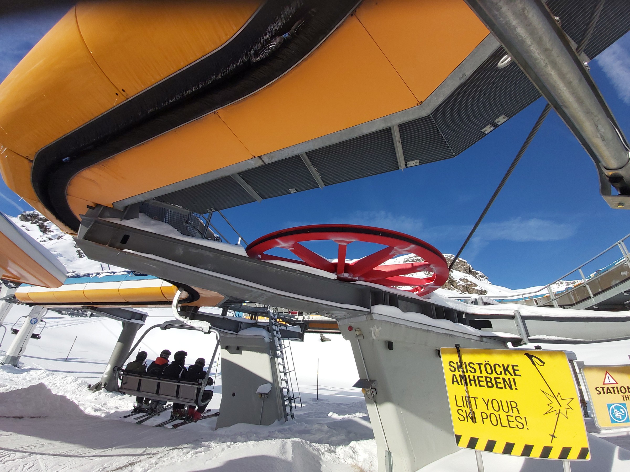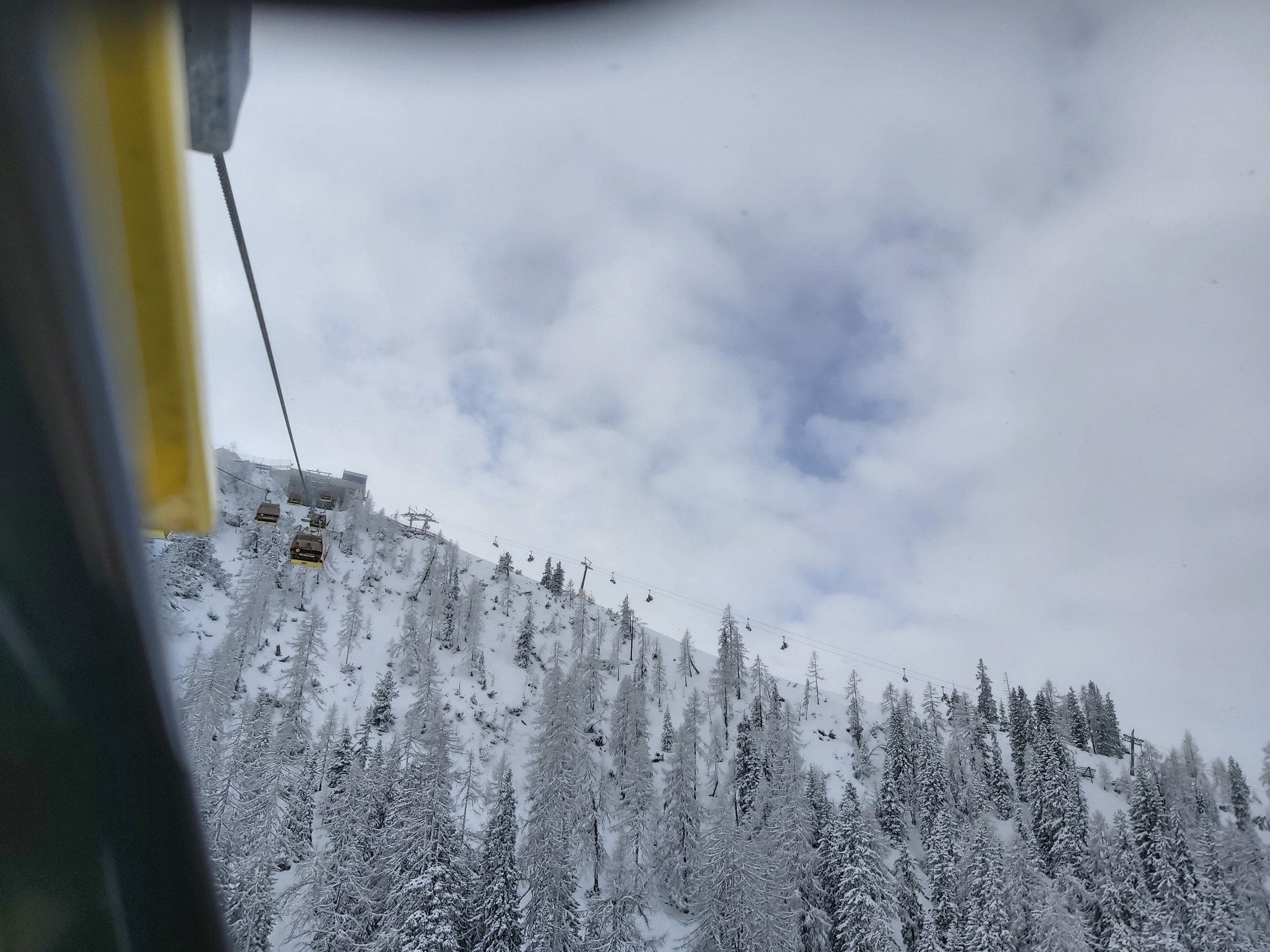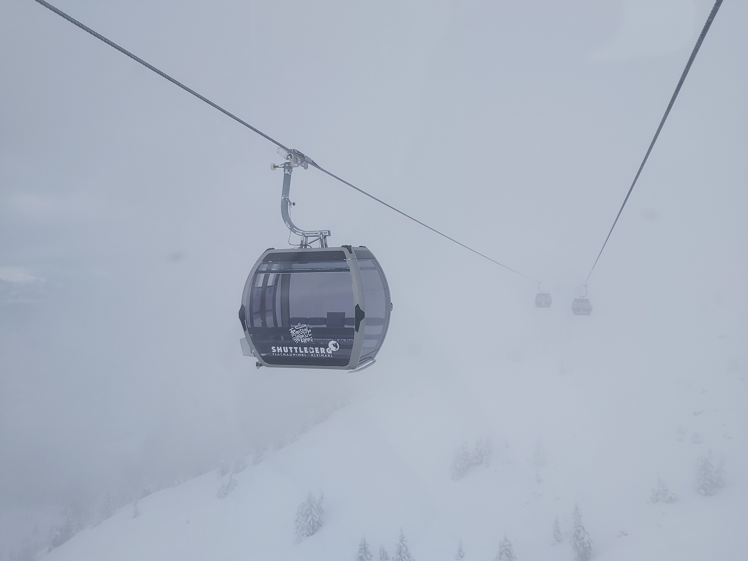 Durch einem Defekt am Lärchkogellift geht es doch noch an der Lawinensteinbahn nach oben. So wie der Bubble sieht die Skibrille auch aus. Man sieht fast nix...