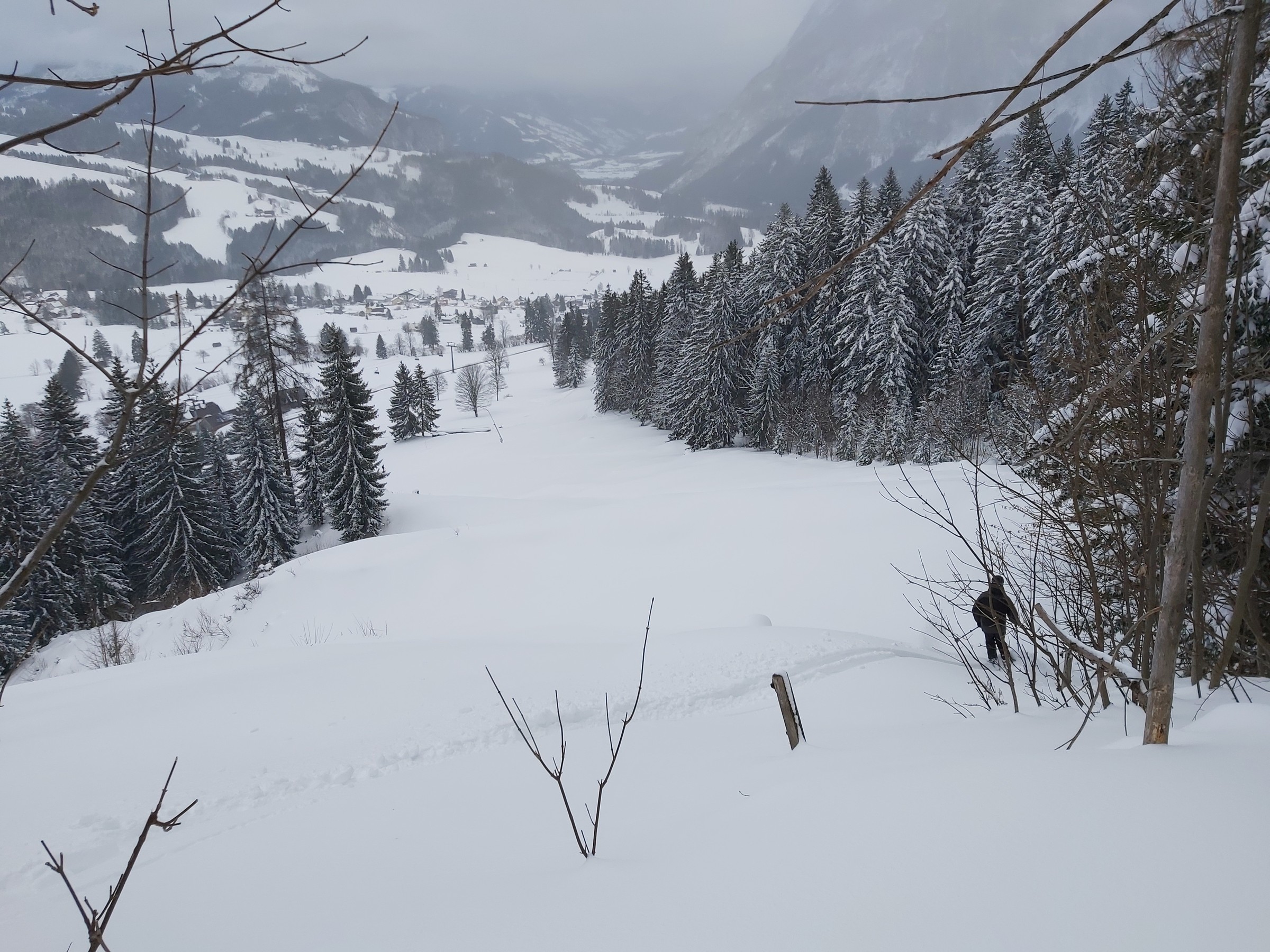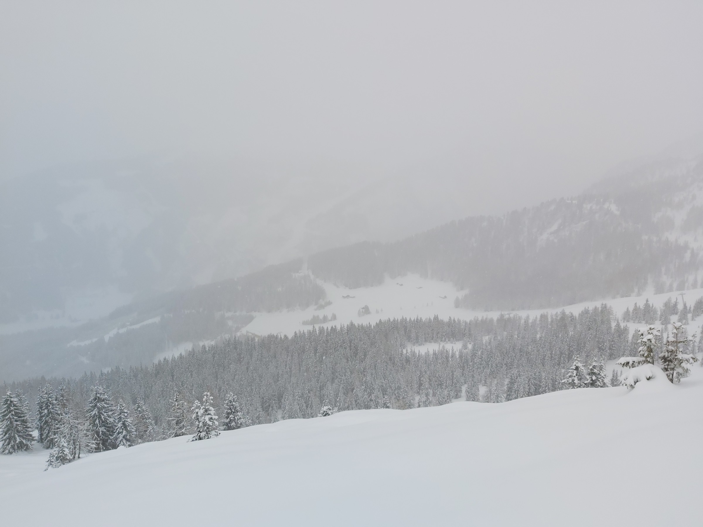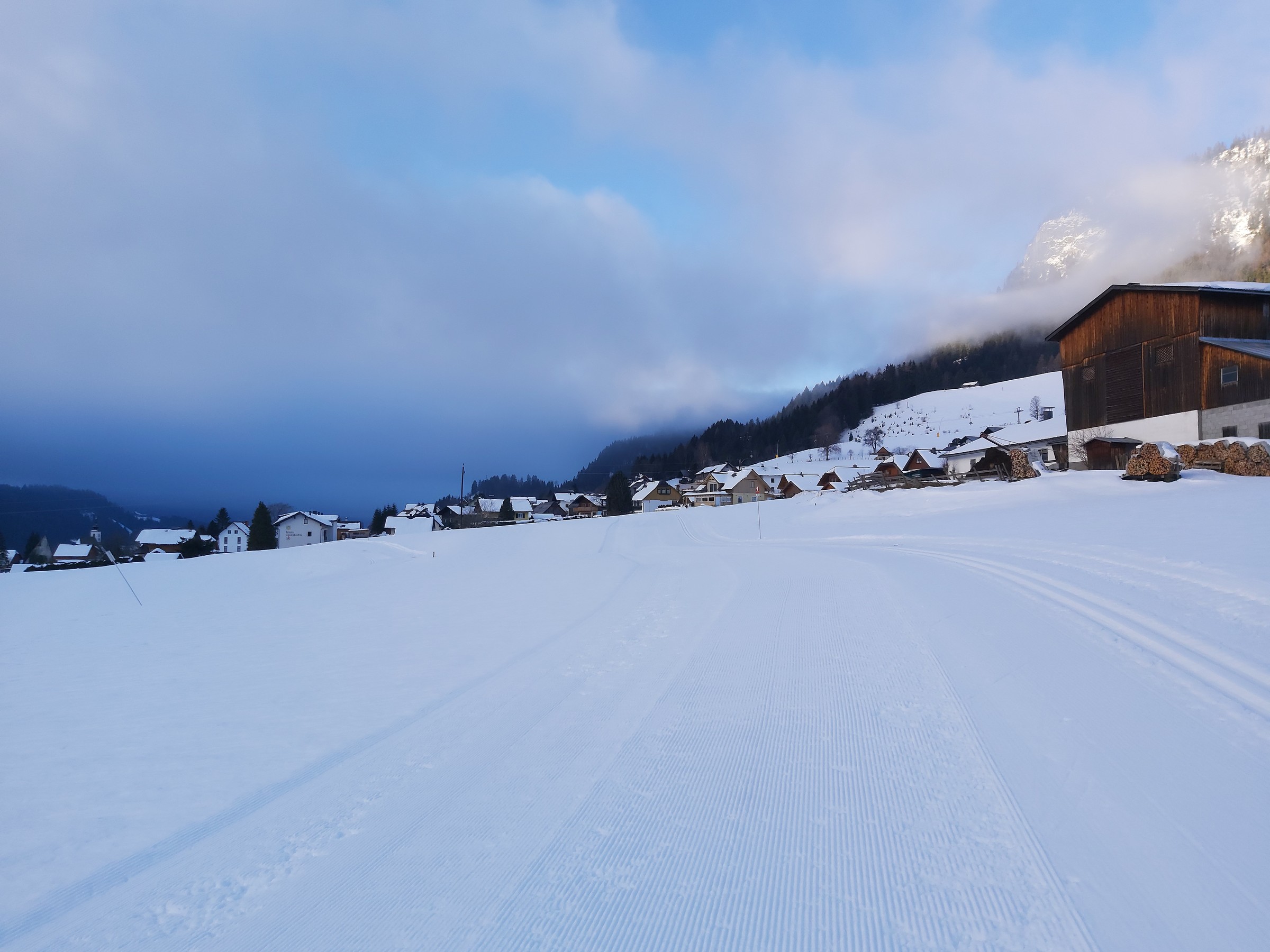 Am gestrigen Tag war es gar sehr windig und auch sonst nicht der Brüller. Heute wurde noch Schnee geschaufelt bei nun 50 cm im Tal. Doch jetzt ist es nicht zu windig und die Sicht relativ gut. Also Skisachen an und los gehts.