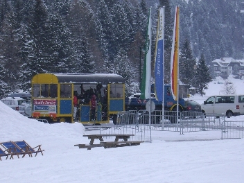 Sehr gefallen: der 'Empfangsbereich' neben der Talstation der 6KSB Kornockbahn: Kassenbereich, geplegte Toiletten ohne jede Treppe, vor allem aber netter Selbstwersorgerraum, wo man sich am Kamin wärmen, Jause auspacken oder am Automat Kaffe/Tee/Kakao etc. kaufen kann. Vorbildhaft!