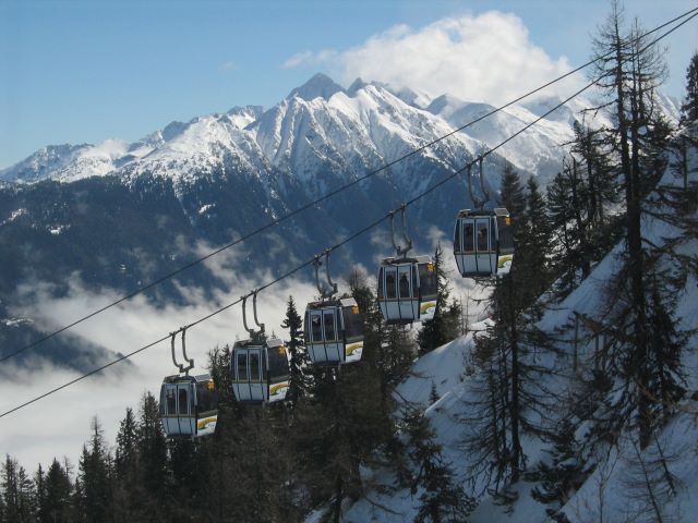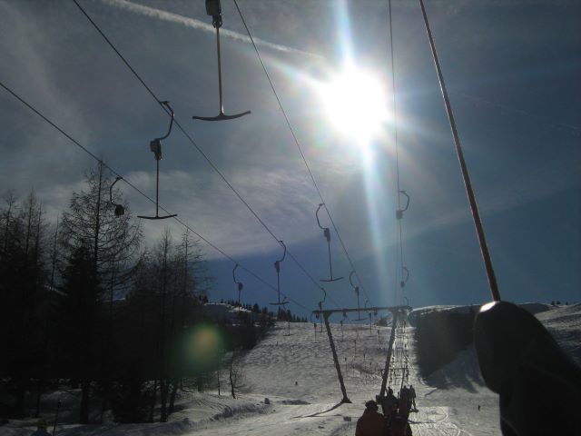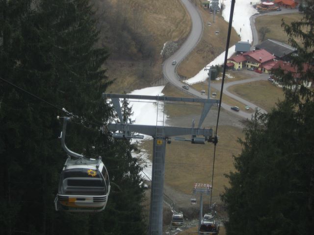 Aber, in Kürze kommt ein Omnibus. Naja, das iss ja schon mal was, das dauerte ca. 20 Min. -- mittlerweile machte aber der Lift wieder Probefahrten. Im vollem Tempo. Dann kam der Bus, und der Lift lief auch. Das iss dann sowas wie ausknobeln, Lift oder Bus... Lift oder Bus, Lift. Ich mag net in Gondeln sitzen, wenn s so warm und sonnig iss. Also rauf mit den Schi, rein in den Lift, und gar net denken, nur schaun.