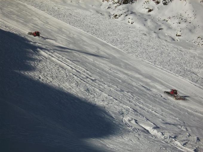 Die Grundpräperierung der roten Piste ist aus meiner Sicht nahezu abgeschlossen und alle Spalten sind beseitigt. Auch wurde heute erstmals die SPur der Lifttrasse eingewalzt. Der Lifte wird nicht direkt an der roten Piste verlaufen, sondern rechts davon versetzt. An der Talstation liegen bereits ein paar Teile, ich konnte allerdings nicht genau erkennen um welche Teile es sich da handelt. Allerdings sollten die sich meiner Meinung mal langsam schicken mit dem Liftbau, weil der Winter naht.