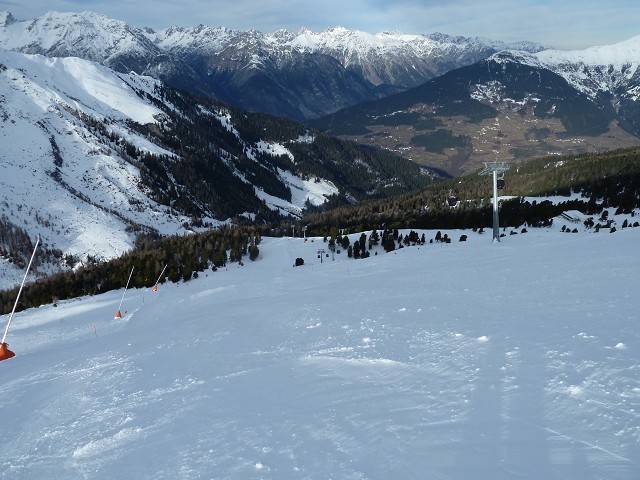 Trotz anhaltendem Tauwetter noch gute Schneelage auf den Pisten. Daneben vor allem in tieferen Lagen kaum mehr Schnee. Fisser Nordseite auch am Nachmittag noch perfekt, hart und griffig. Talabfahrten nachmittags extrem versulzt (Möseralmabfahrt) bzw. teilweise vereist (Waldabfahrt). Hervorragende Bedingungen im "Schneeloch" Masner.
