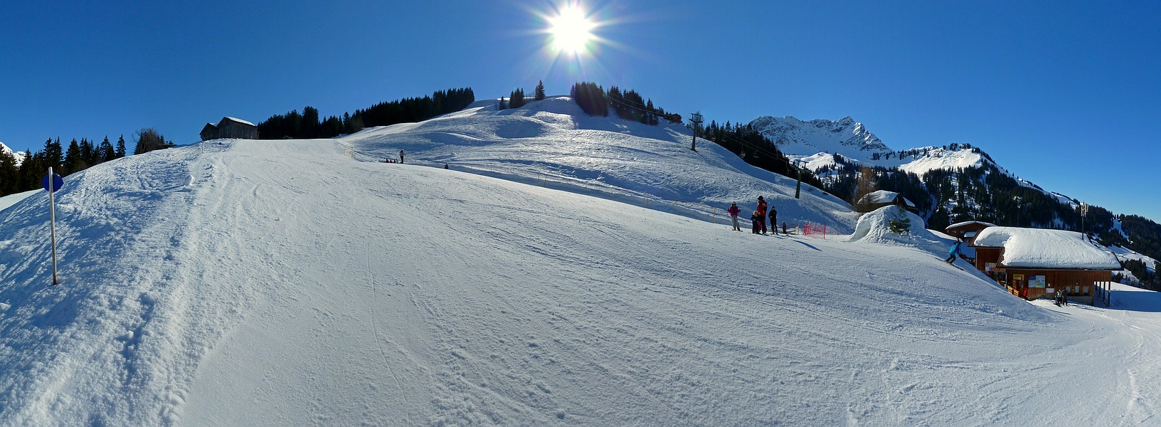 ^^Panoramabild von der Talstation der Sesselbahn. Von links kommt die Piste. Mittig im Bild sieht man das Förderband. (klick zum Vergrößern)